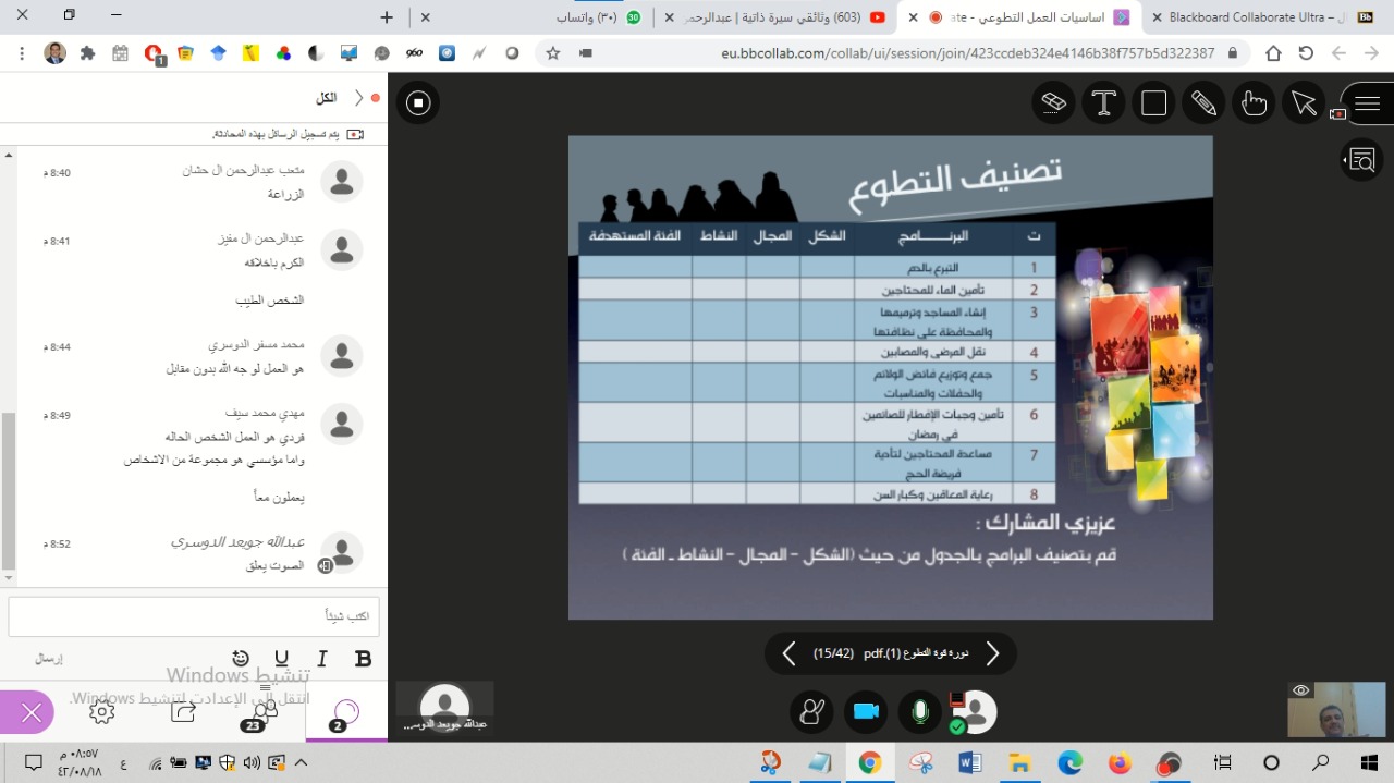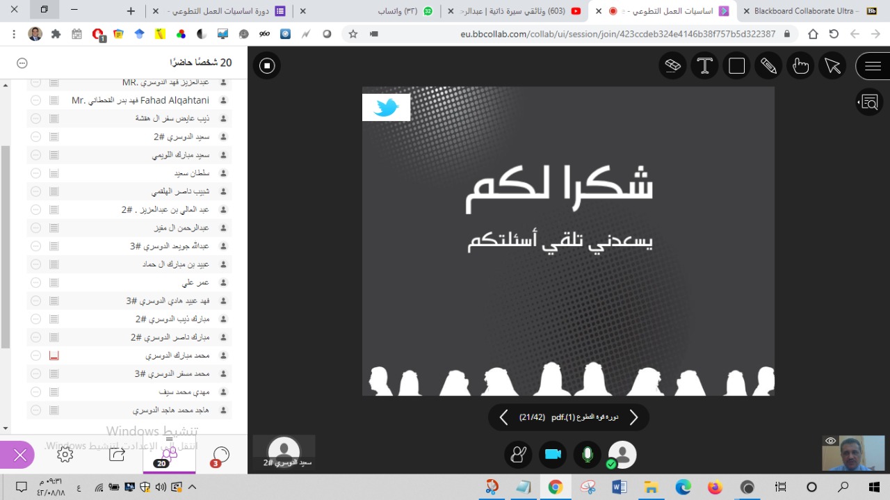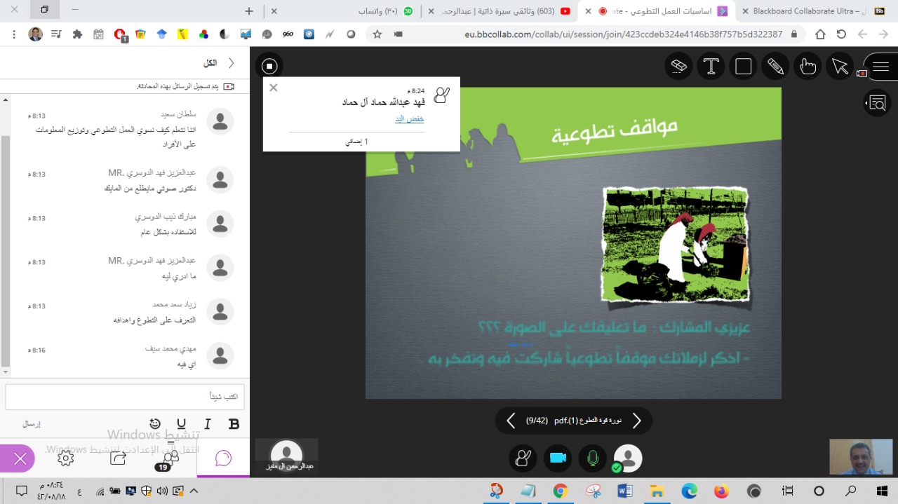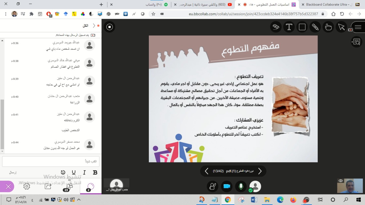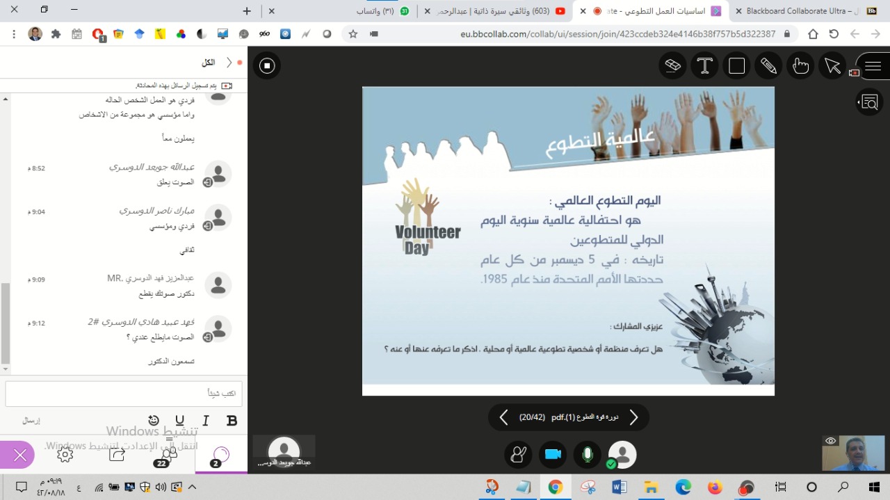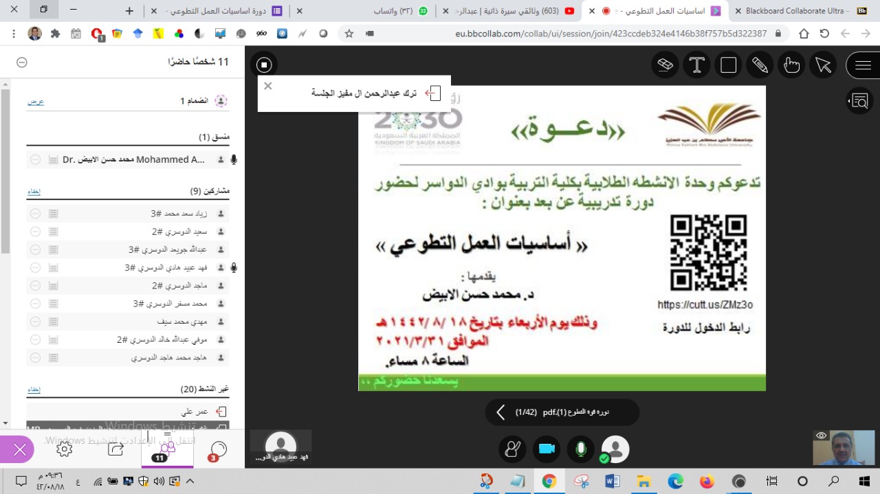 بتوجيه ومتابعة عميد كلية التربية بمحافظة وادي الدواسر الدكتور/ ماجد بن علي الشريدة، نظمت الأنشطة الطلابية بكلية التربية دورة تدريبية بعنوان: (اساسيات العمل التطوعي)، وذلك يوم الأربعاء 18/8/1442، في تمام الساعة الثامنة مساءً، عبر برنامج البلاك بورد، قدم الدورة الدكتور/ محمد حسن الابيض أستاذ الصحة النفسية المساعد بالكلية.
