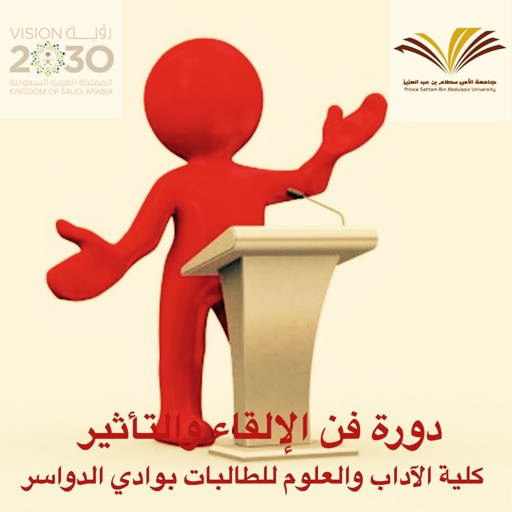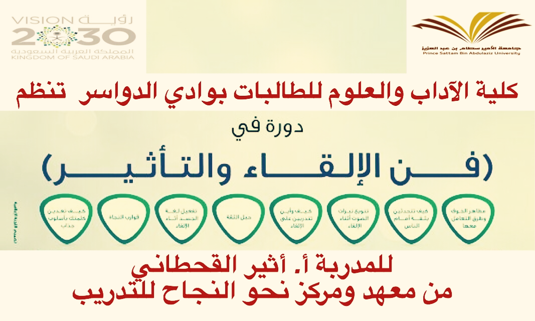 نظمت كلية الآداب والعلوم للطالبات بوادي الدواسر دورة تدريبية بعنوان "فن الإلقاء والتأثير" قدمتها المدربة الأستاذة / أثير القحطاني من معهد ومركز نحو النجاح للتدريب ، وذلك بمسرح الكلية .