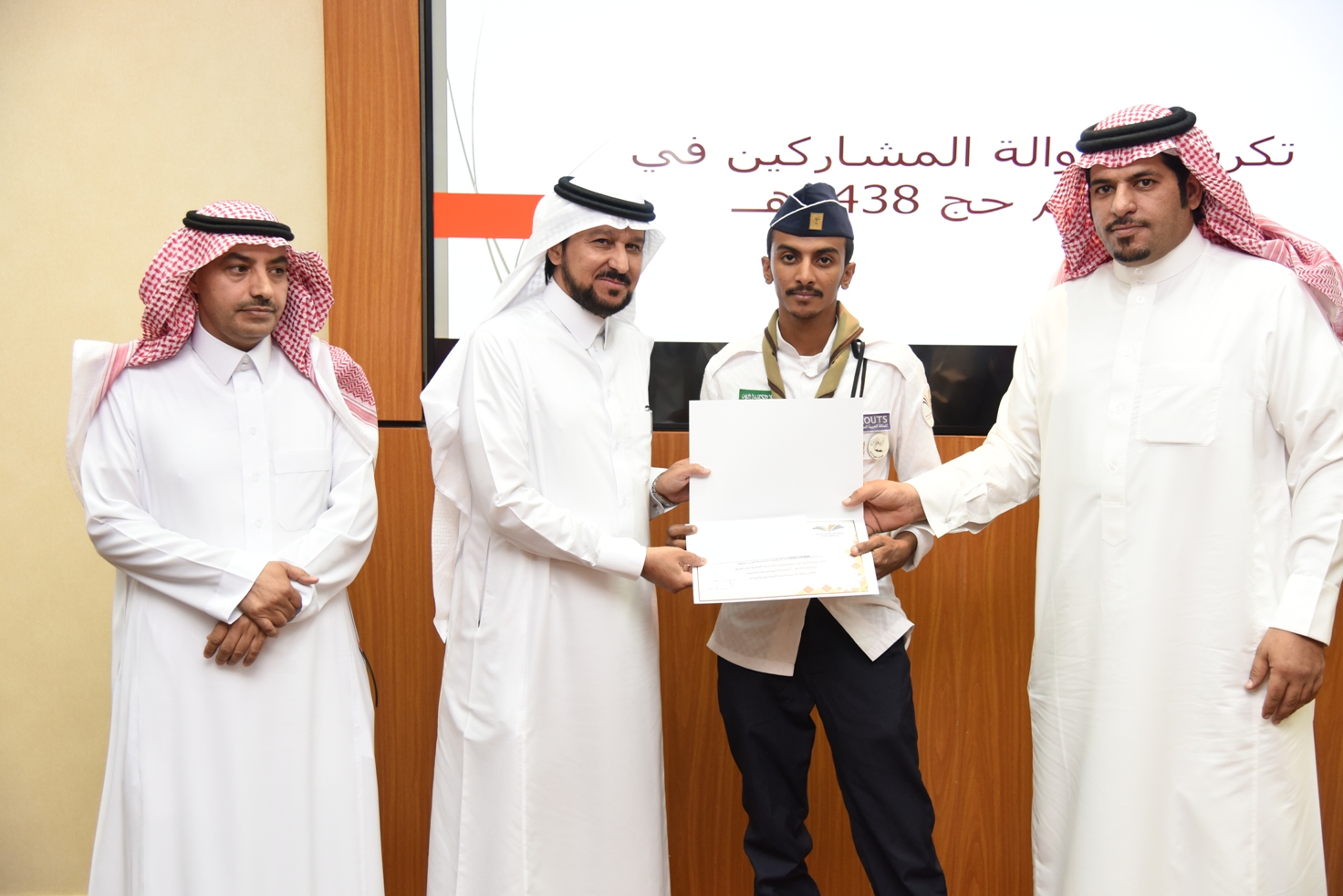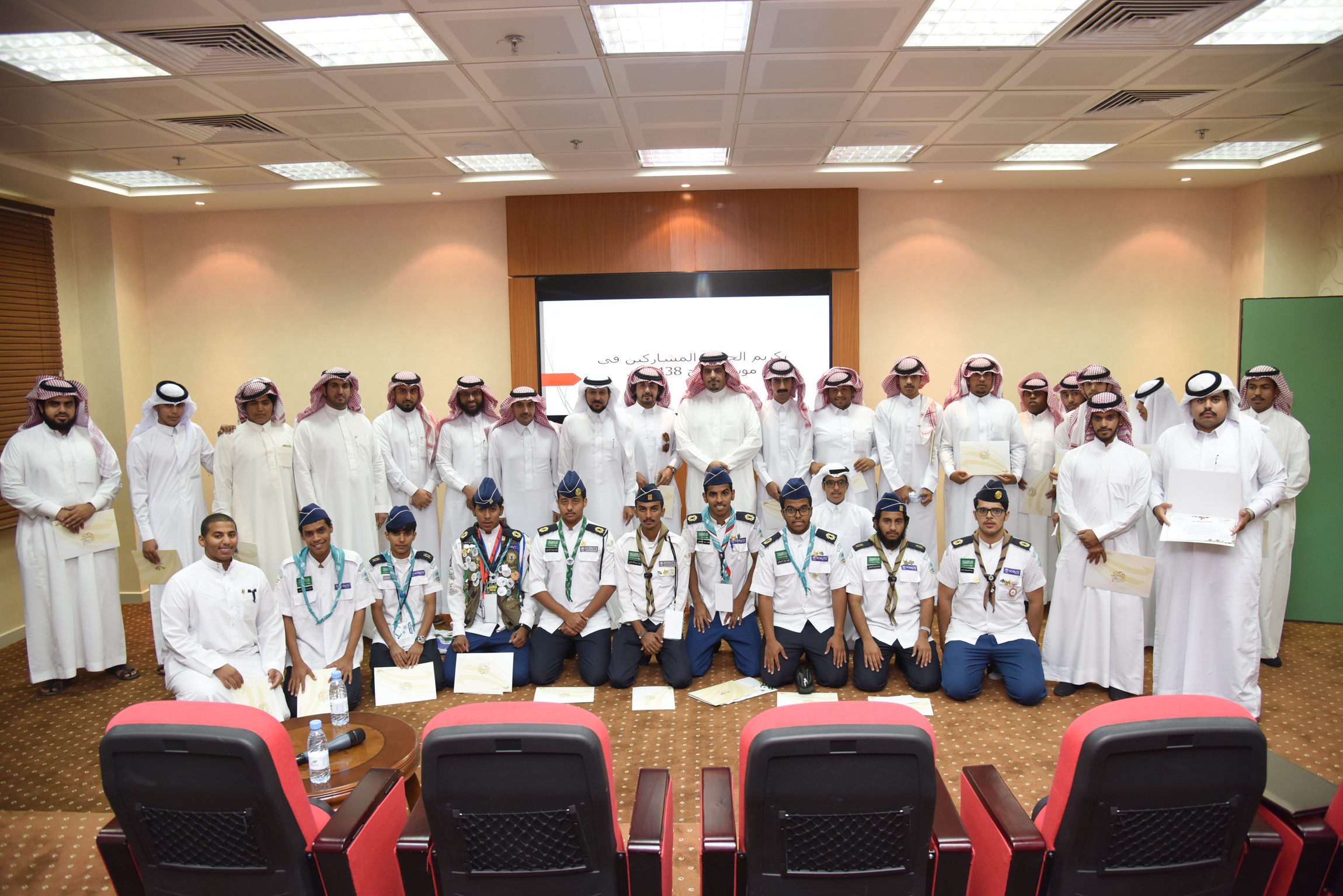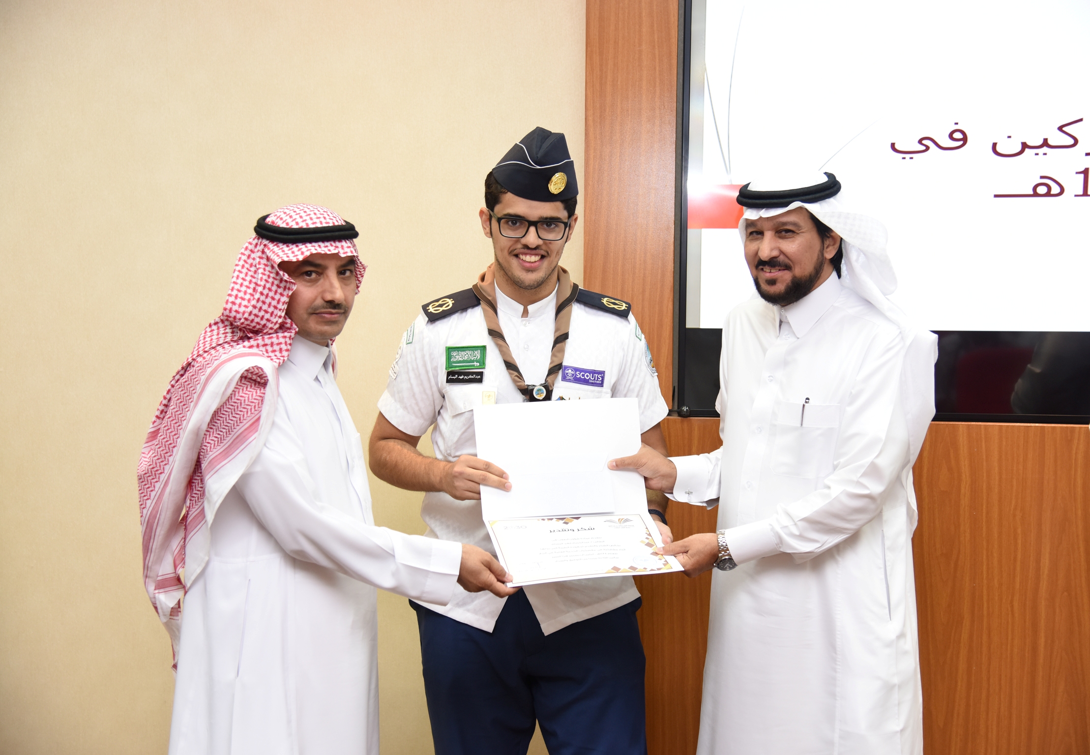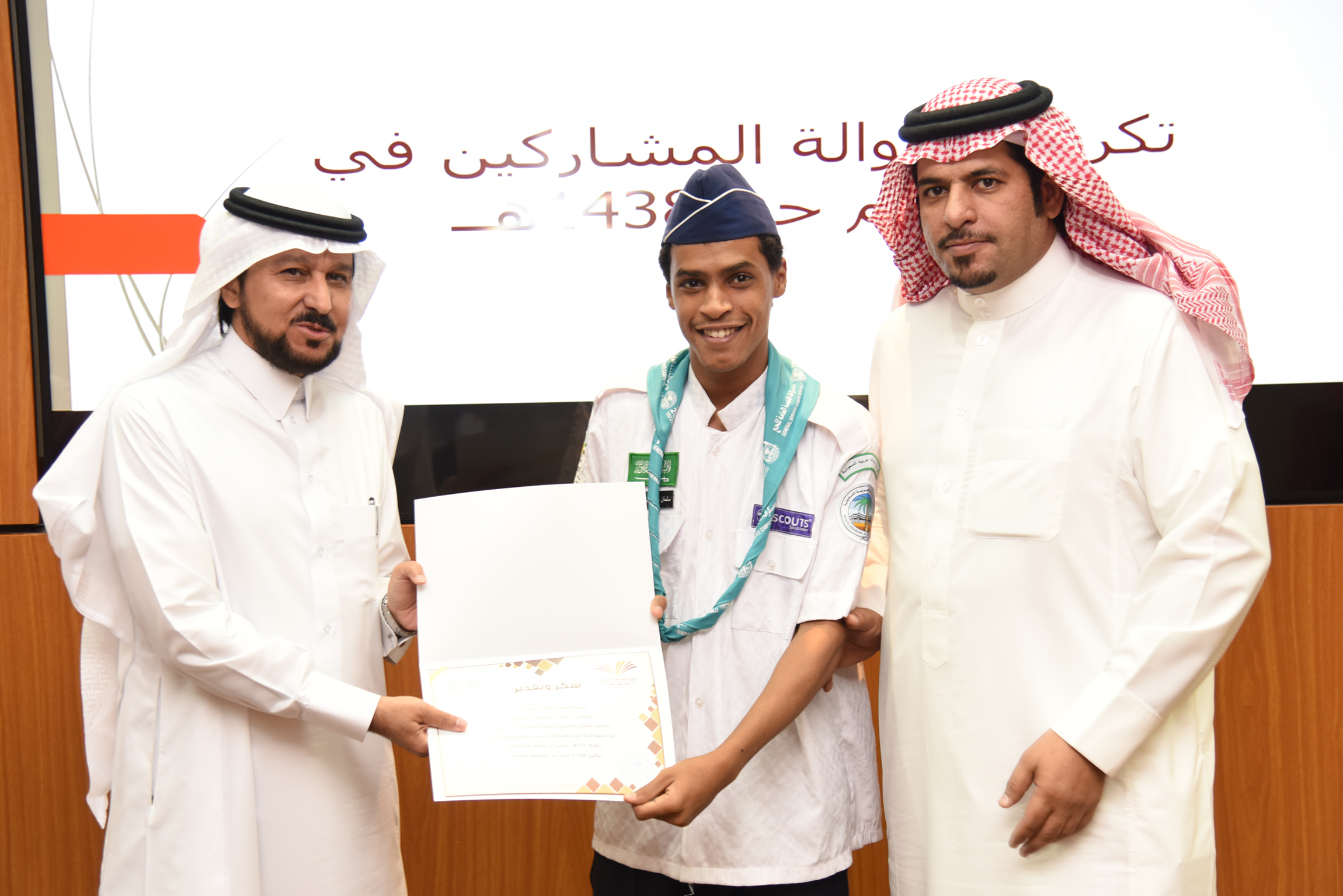 بعد ذلك سلم معاليه شهادة الشكر للجوالة المشاركين والتقطت الصور التذكارية لهذه المناسبة , وفي ختام اللقاء وجه عميد شؤون الطلاب الدكتور ثلاب الشكرة جزيل شكره لمعالي مدير الجامعة على دعمة المتواصل لأنجاح برامج وأنشطة العمادة وأتاحة الفرصة لأبنائه الطلاب للمشاركة في مثل هذه المناسبات الغالية والتعاون مع الجهات الاخرى لخدمة هذا الوطن , حضر اللقاء وكيل الجامعة للفروع الدكتور عبدالله الصقر .