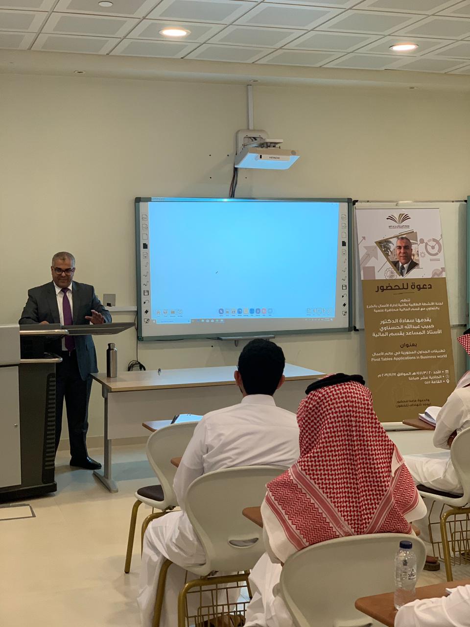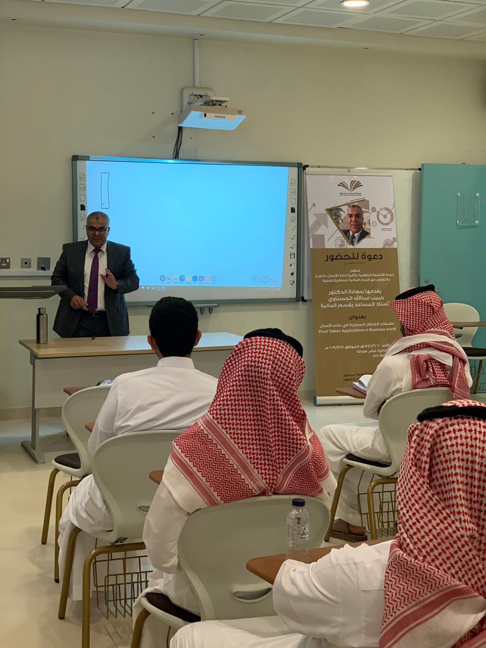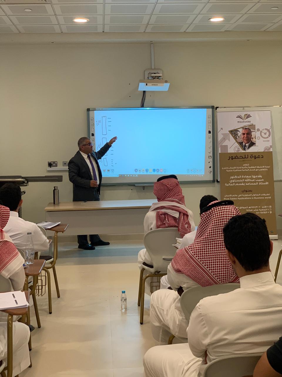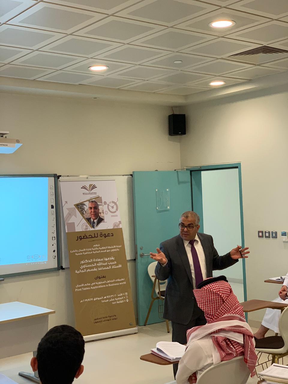 نظمت لجنة الأنشطة الطلابية بكلية إدارة الأعمال بالخرج بالتعاون مع قسم المالية محاضرة علمية بتاريخ 17 نوفمبر 2019م بعنوان "تطبيقات الجداول المحورية في عالم الأعمال"(PIVOT)، قدمها سعادة الدكتور الحبيب عبد الله الحسناوي الأستاذ المساعد بقسم المالية, وقد نوه المحاضر في أول مداخلته بضرورة تمكين طلاب إدارة الأعمال من آليات معالجة المعلومات في عالم يتسم بالتدفق السريع للمعلومات وذلك لدعم الطلاب في إتخاذ القرارات المناسبة وفي الوقت المناسب. إثر ذلك، قدم المحاضر الجداول المحورية وأبرز تطبيقاتها في إدارة الأعمال وقدم بعض الأمثلة التي ترتبط بالتسويق وبالموارد البشرية وبالمالية وبالمحاسبة. وفي ختام مداخلته قدم المحاضر تطبيقا عمليا يتعلق بأداء الأسهم المدرجة في السوق المالية وذلك باستخدام الجداول المحورية، كما قدم أيضاً بعض المواقع على الشبكة العنكبوتية للمزيد من الشرح والتوضيح .