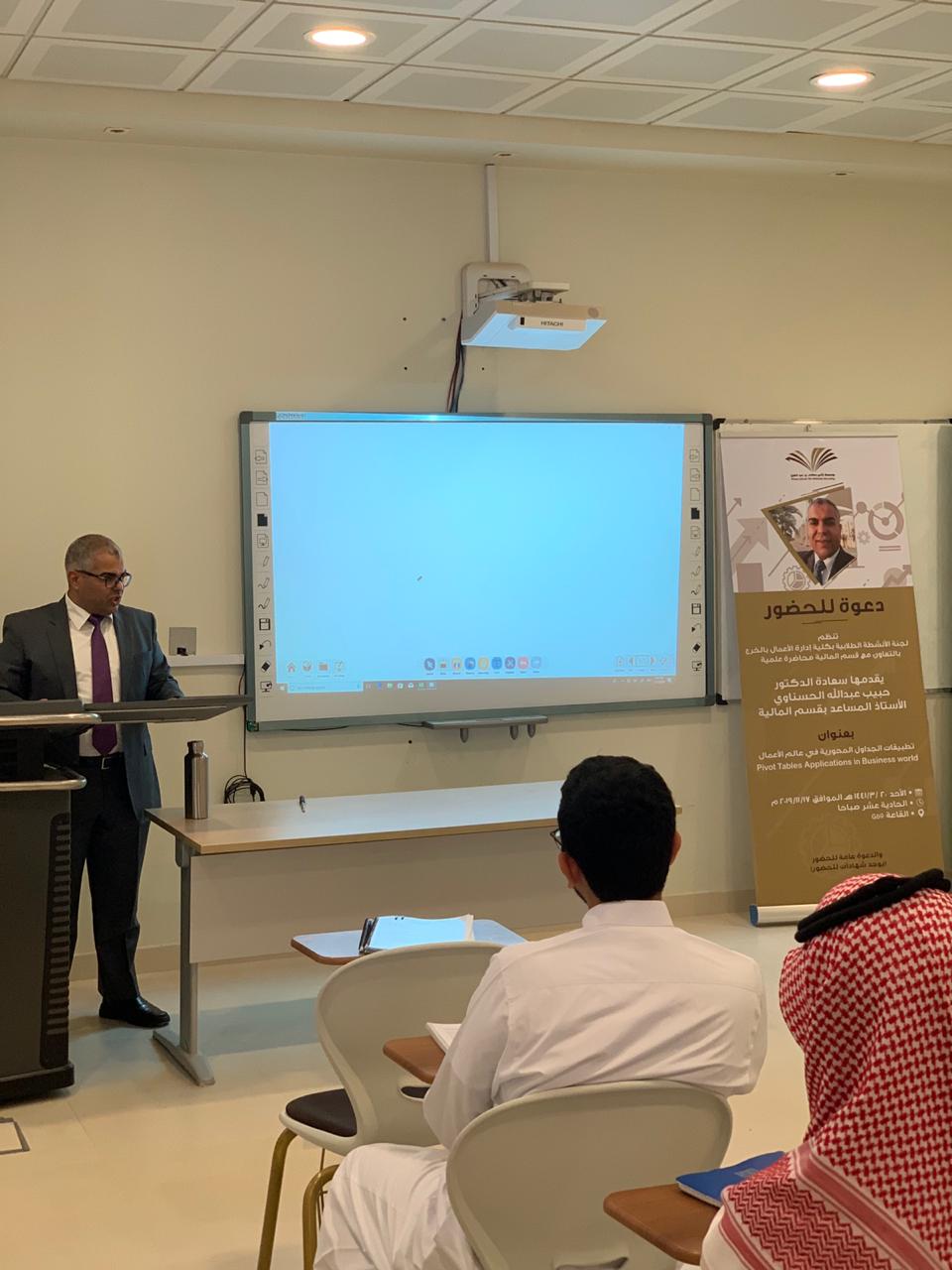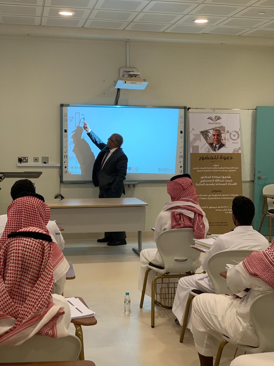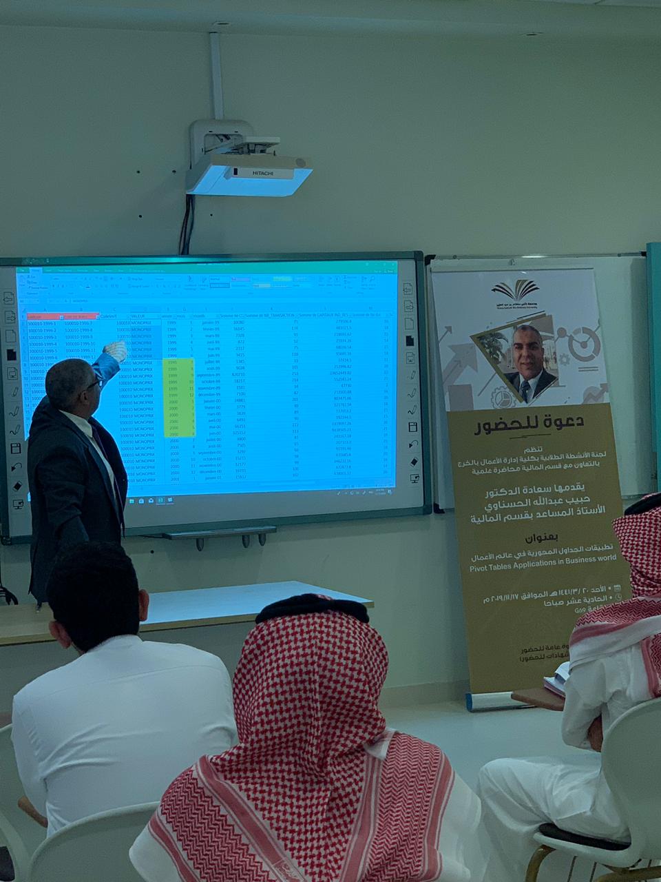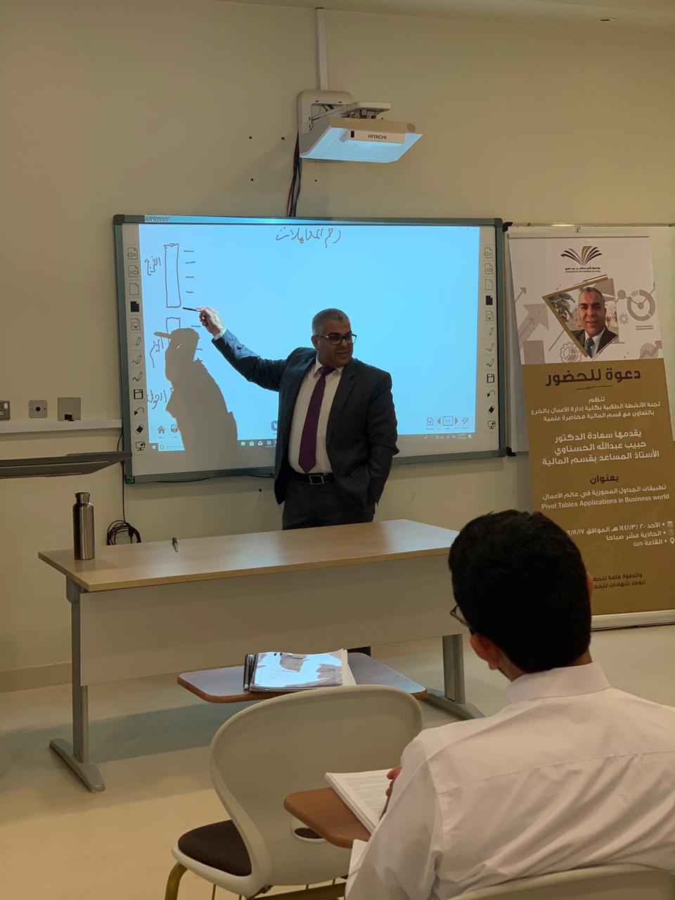نظمت لجنة الأنشطة الطلابية بكلية إدارة الأعمال بالخرج بالتعاون مع قسم المالية محاضرة علمية بتاريخ 17 نوفمبر 2019م بعنوان "تطبيقات الجداول المحورية في عالم الأعمال"(PIVOT)، قدمها سعادة الدكتور الحبيب عبد الله الحسناوي الأستاذ المساعد بقسم المالية, وقد نوه المحاضر في أول مداخلته بضرورة تمكين طلاب إدارة الأعمال من آليات معالجة المعلومات في عالم يتسم بالتدفق السريع للمعلومات وذلك لدعم الطلاب في إتخاذ القرارات المناسبة وفي الوقت المناسب. إثر ذلك، قدم المحاضر الجداول المحورية وأبرز تطبيقاتها في إدارة الأعمال وقدم بعض الأمثلة التي ترتبط بالتسويق وبالموارد البشرية وبالمالية وبالمحاسبة. وفي ختام مداخلته قدم المحاضر تطبيقا عمليا يتعلق بأداء الأسهم المدرجة في السوق المالية وذلك باستخدام الجداول المحورية، كما قدم أيضاً بعض المواقع على الشبكة العنكبوتية للمزيد من الشرح والتوضيح .