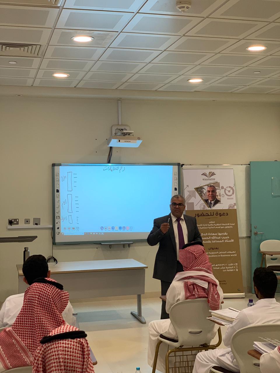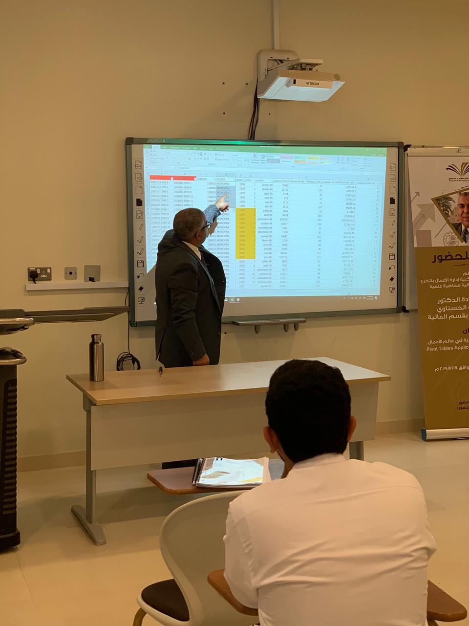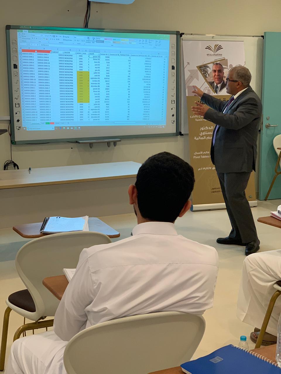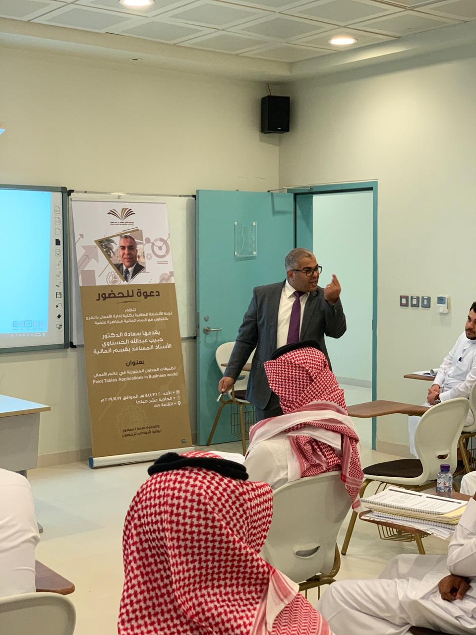 نظمت لجنة الأنشطة الطلابية بكلية إدارة الأعمال بالخرج بالتعاون مع قسم المالية محاضرة علمية بتاريخ 17 نوفمبر 2019م بعنوان "تطبيقات الجداول المحورية في عالم الأعمال"(PIVOT)، قدمها سعادة الدكتور الحبيب عبد الله الحسناوي الأستاذ المساعد بقسم المالية, وقد نوه المحاضر في أول مداخلته بضرورة تمكين طلاب إدارة الأعمال من آليات معالجة المعلومات في عالم يتسم بالتدفق السريع للمعلومات وذلك لدعم الطلاب في إتخاذ القرارات المناسبة وفي الوقت المناسب. إثر ذلك، قدم المحاضر الجداول المحورية وأبرز تطبيقاتها في إدارة الأعمال وقدم بعض الأمثلة التي ترتبط بالتسويق وبالموارد البشرية وبالمالية وبالمحاسبة. وفي ختام مداخلته قدم المحاضر تطبيقا عمليا يتعلق بأداء الأسهم المدرجة في السوق المالية وذلك باستخدام الجداول المحورية، كما قدم أيضاً بعض المواقع على الشبكة العنكبوتية للمزيد من الشرح والتوضيح .