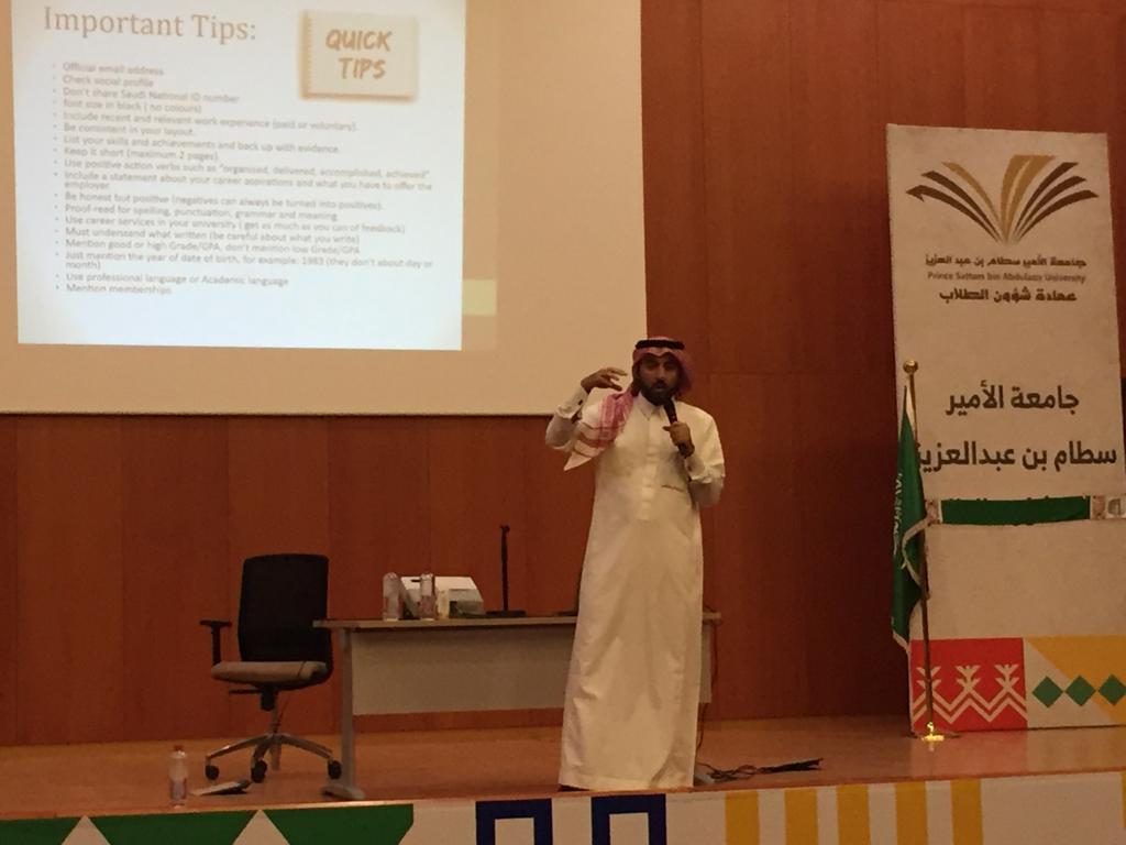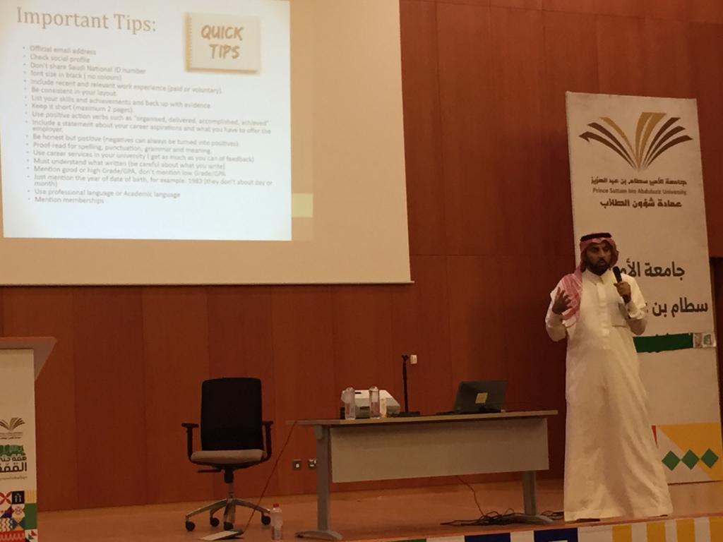 كما طلب الدكتور المحيا من الحضور إلى الاستفادة من خبرات أعضاء هيئة التدريس بالكلية لتوجيههم إلى أفضل الاحتمالات الممكنة لبناء السيرة الذاتية وتجاوز المقابلات الشخصية وكذلك بما يتعلق بالشهادات المهنية في التخصص الجامعي والتي لها الدور في تمييز الخريجين عن غيرهم.