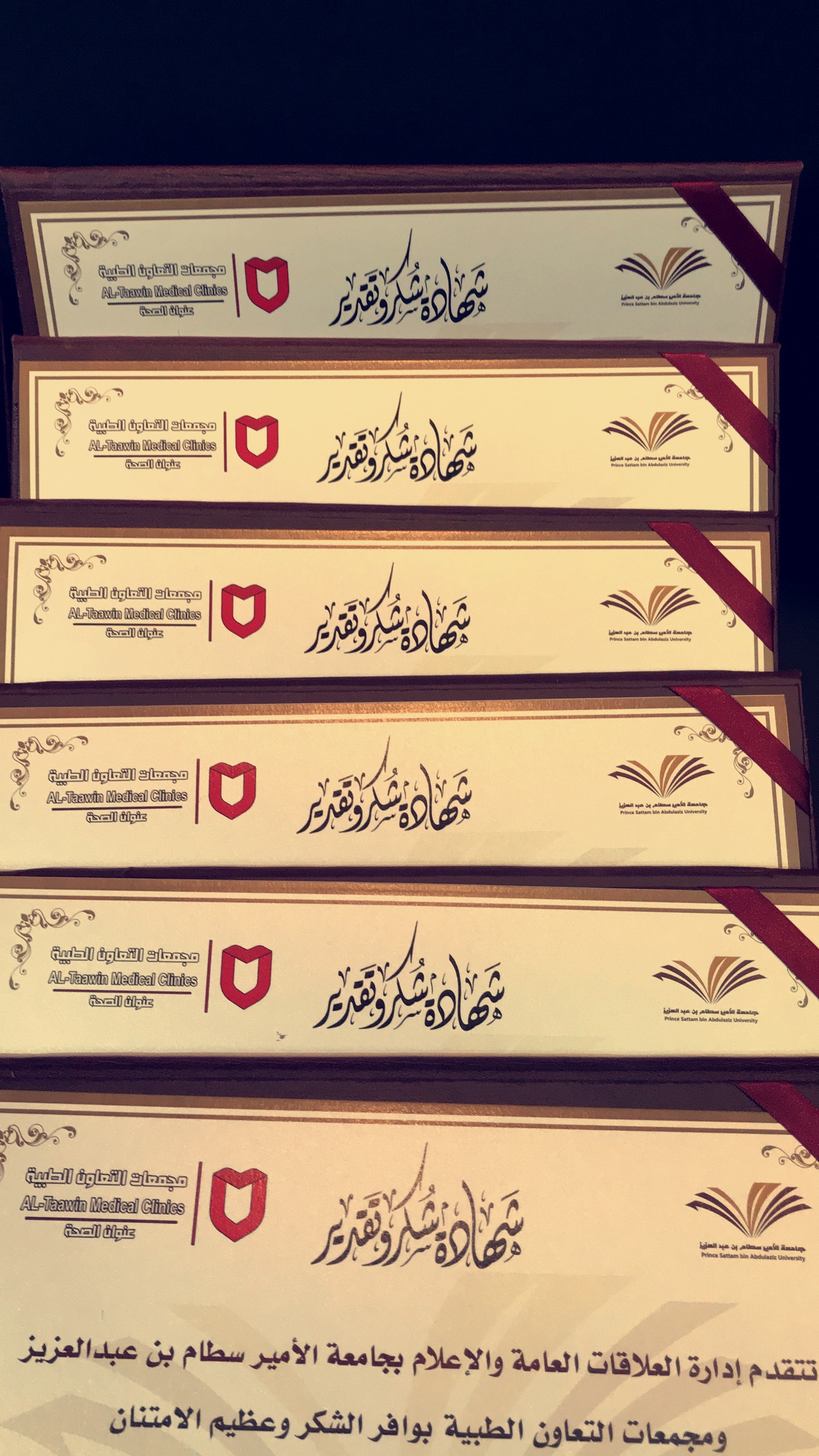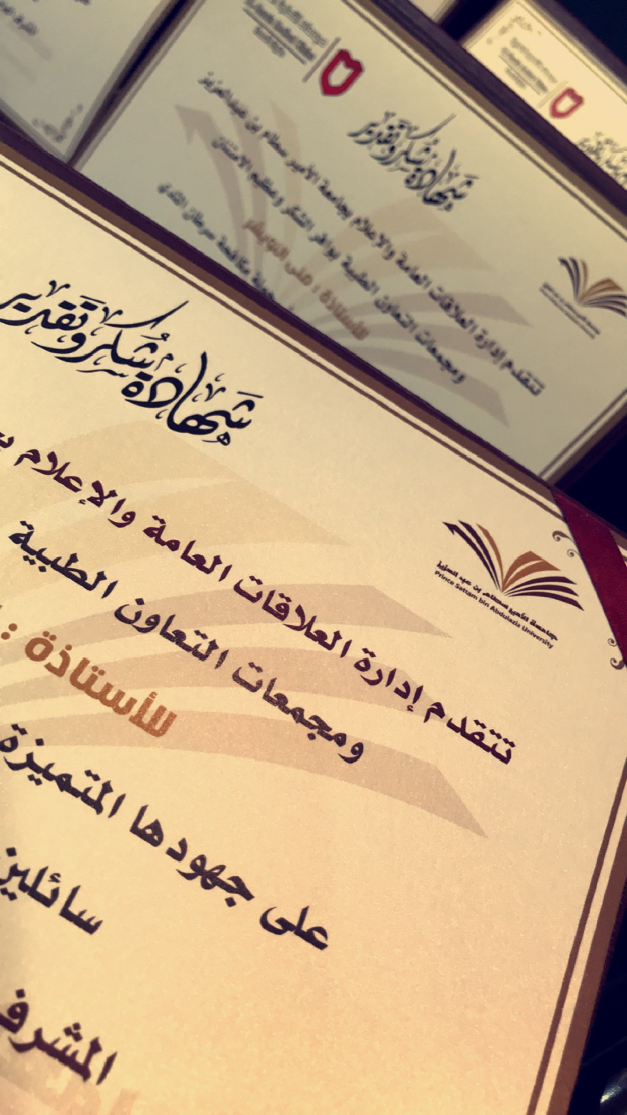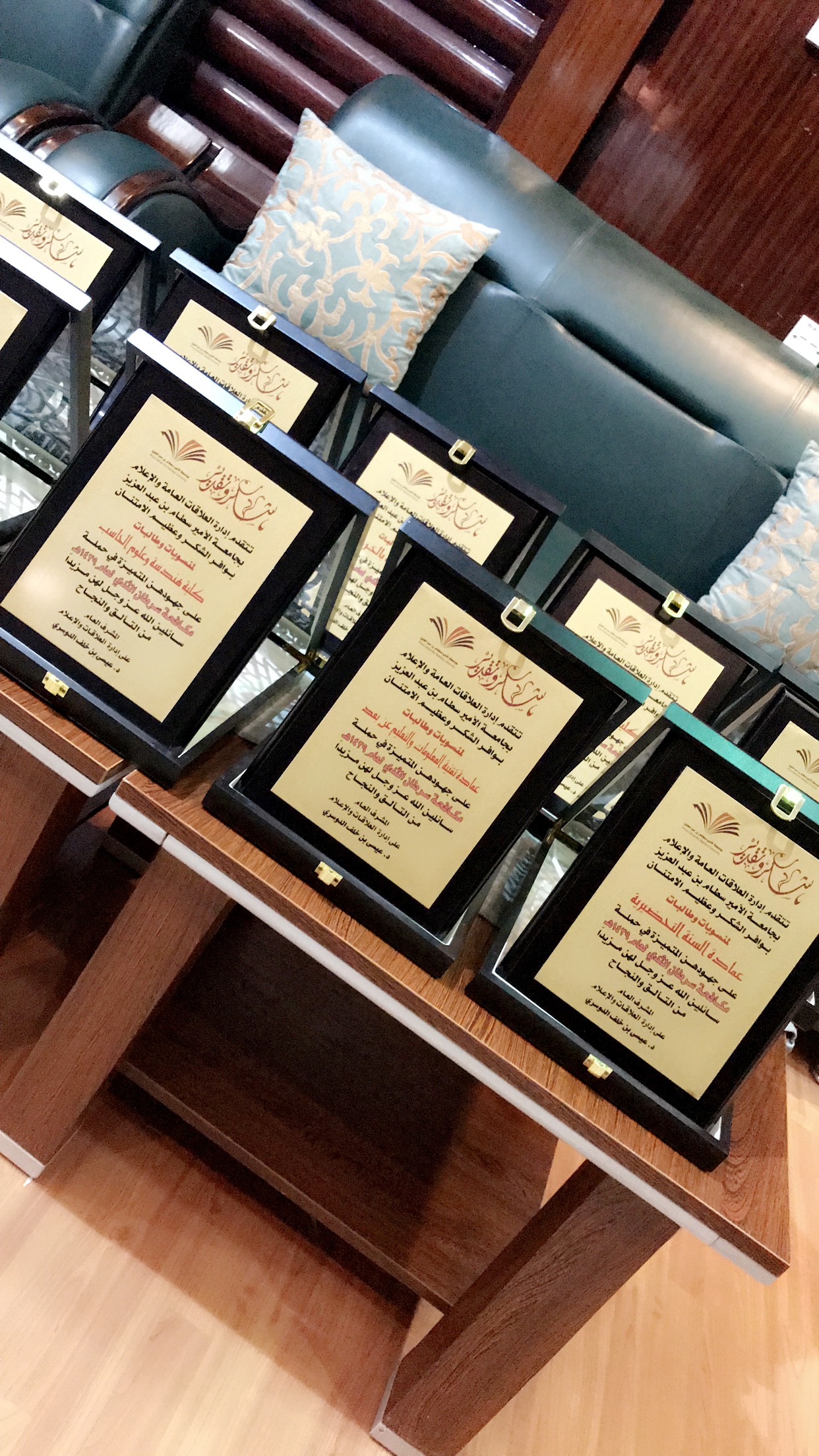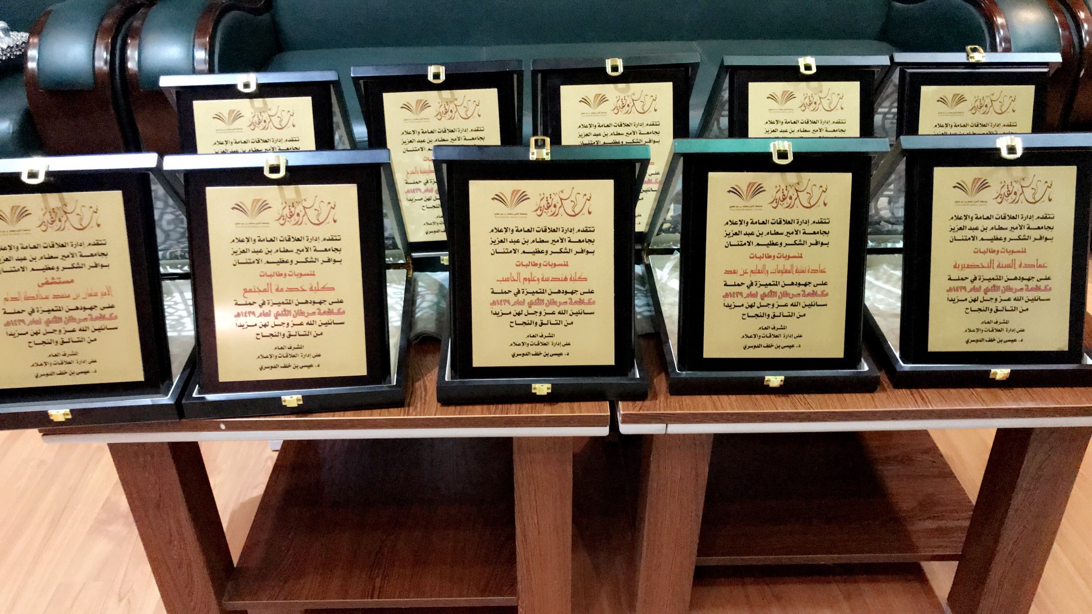 كرمت إدارة العلاقات العامة والإعلام كليات وعمادات الجامعة التي شاركت في حملة مكافحة سرطان الثدي والذي أقيم تحت رعاية صاحبة السمو الملكي الأميرة أضواء بنت فهد بن سعد آل سعود وذلك في يوم الخميس الماضي بكلية العلوم والدراسات الإنسانية بالخرج . وقد شارك في المعرض كلاً من : كلية التربية بالدلم – كلية التربية بالخرج – كلية العلوم الدراسات الإنسانية بالخرج – كلية العلوم والدراسات الإنسانية بحوطة بني تميم – كلية هندسة وعلوم الحاسب - كلية الصيدلة – كلية العلوم الطبية التطبيقية بالخرج - كلية خدمة المجتمع – عمادة السنة التحضيرية – عمادة تقنية المعلومات والتعليم عن بعد. وذلك تقديراً للجهود التي بذلتها منسوبات وطالبات الجهات المشاركة والتي كان لها أثر واضح و مُميز في تنظيم معرض الحملة حيث تنافست الأركان في التعبير عن مُسببات مرض سرطان الثدي و أعراضه وطرق الوقاية منه ، بأساليب متنوعة .
