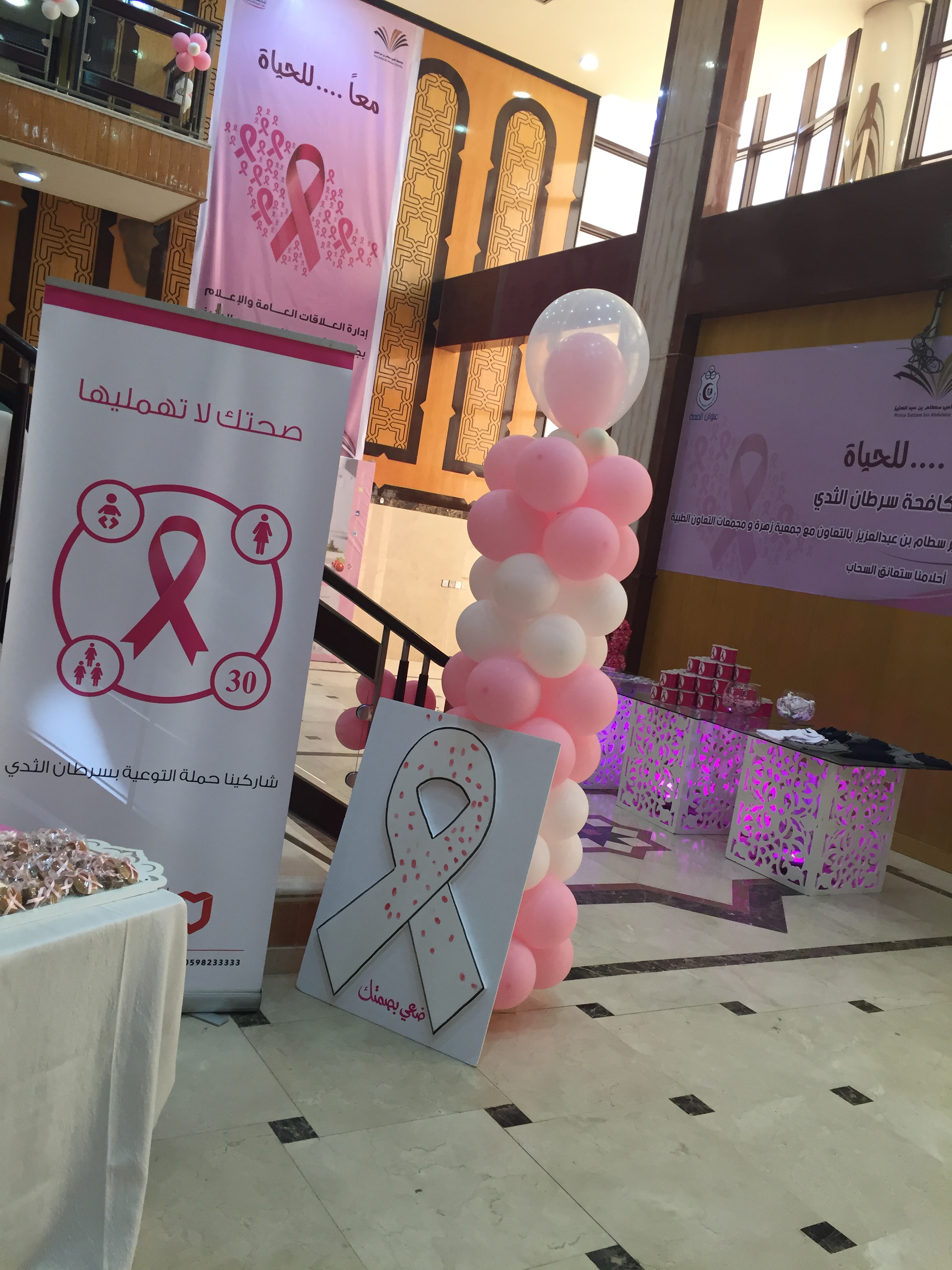 نظمت إدارة العلاقات العامة والإعلام بالتعاون مع جمعية زهرة لمكافحة سرطان الثدي، ومُجمعات التعاون الطبية، وبتعاون مُميز من وحدات العلاقات العامة في كليات البنات، حملة (معًا للحياة) التي انطلقت يوم الأحد الموافق 1437/1/12هـ وكانت البداية في كلية التربية بالدلم؛ حيث نظمت وحدة العلاقات بالكلية معرضًا مصاحبًا للحملة افتتحته د. سحر عبده مساعدة العميدة للشؤون التعليمية والأكاديمية وأ. أمير الجيزاني مشرفة الشؤون المالية والإدارية، وبحضور أعضاء هيئة التدريس والطالبات.