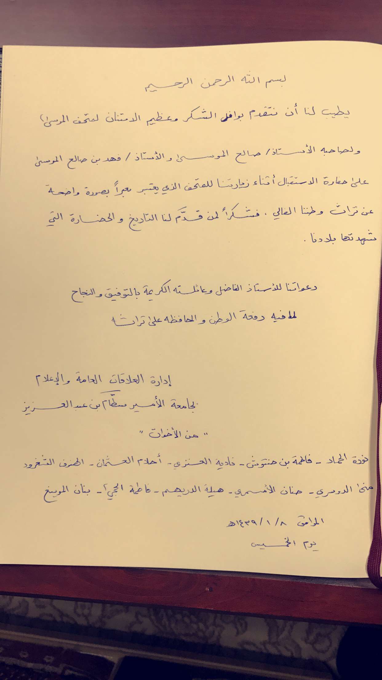 وتأتي زيارة مُتحف الموسى ضمن فعاليات إدارة العلاقات العامة والإعلام التي نظمتها بمناسبة اليوم الوطني 87 للمملكة العربية السعودية وقد حضيت هذه الفعاليات بمتابعة وحرص من سعادة المشرف العام على العلاقلات العامة والإعلام د. عيسى بن خلف الدوسري.