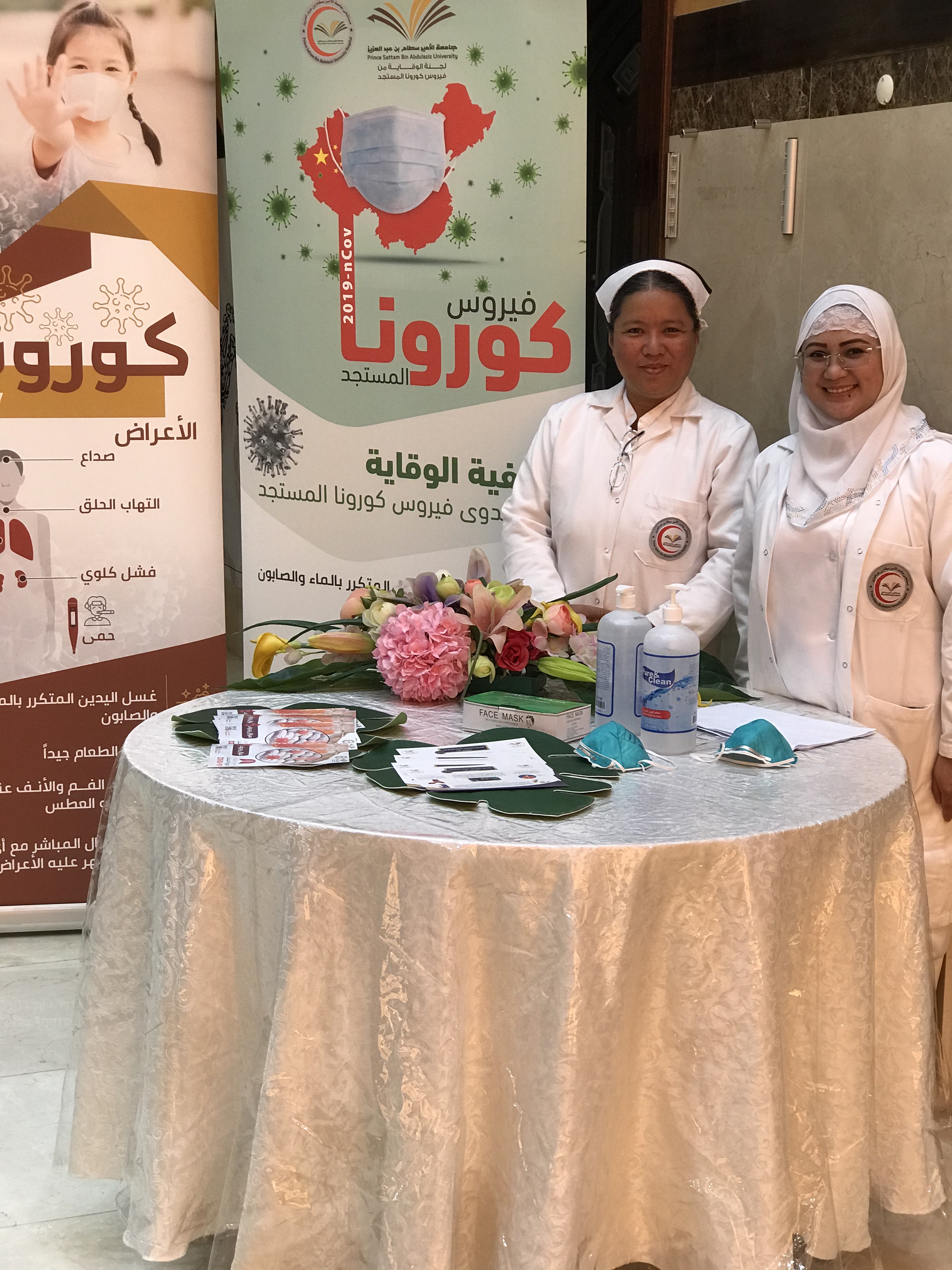 إنطلاقاً من حرص إدارة العلاقات العامة والإعلام على التفاعل مع الأحداث المحلية والعالمية وسعيها لنشر الثقافة الصحية والتعريف بمرض العصر (الكورونا) نظم القسم النسائي ركناً توعوياً بمبنى العمادات المساندة بالتعاون مع المستشفى الجامعي وذلك صباح اليوم الأثنين الموافق 14/7/1441هـ .