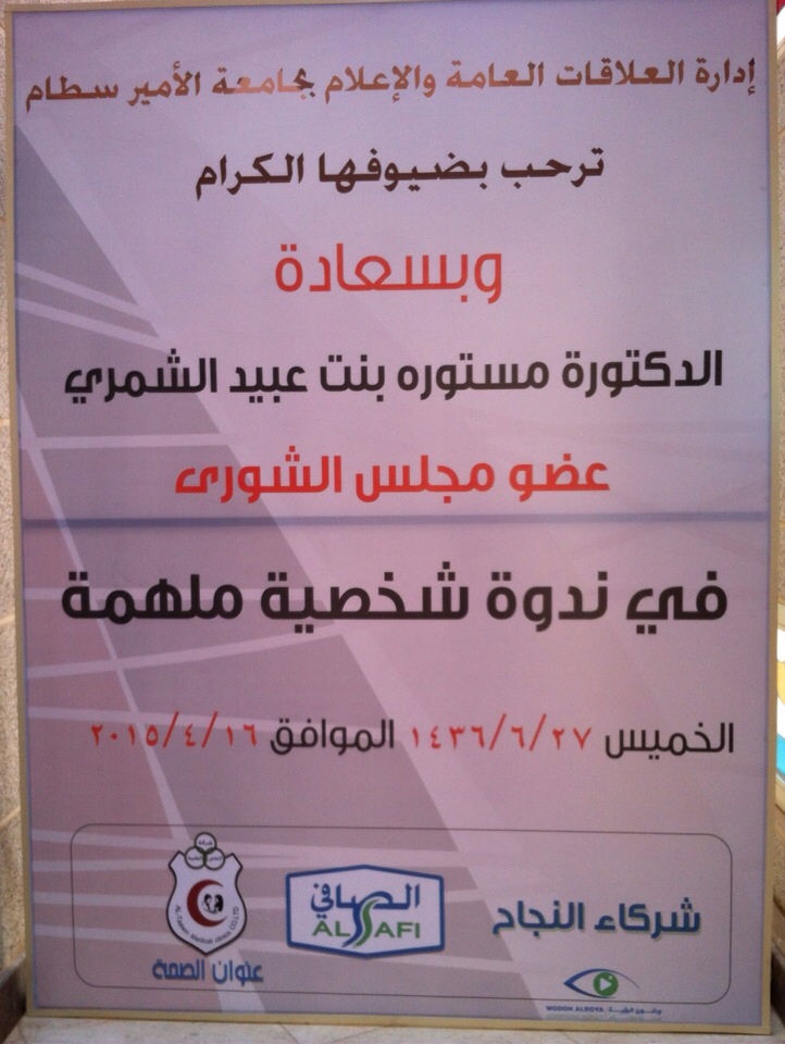 أقامت إدارة العلاقات والإعلام ( القسم النسائي) ندوة بعنوان شخصية ملهمة استضافت فيها د مستوره بنت عبيد الشمري عضو مجلس الشورى وذلك يوم الخميس المواف١٤٣٦/٦/٢٧ وبحضور حرم محافظ محافظة الخرج ،ود نوره الضعيان وكيلة عمادة التطوير والجودة بالجامعة