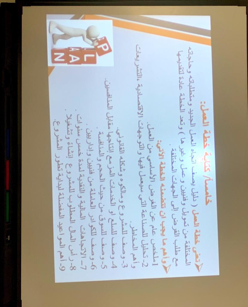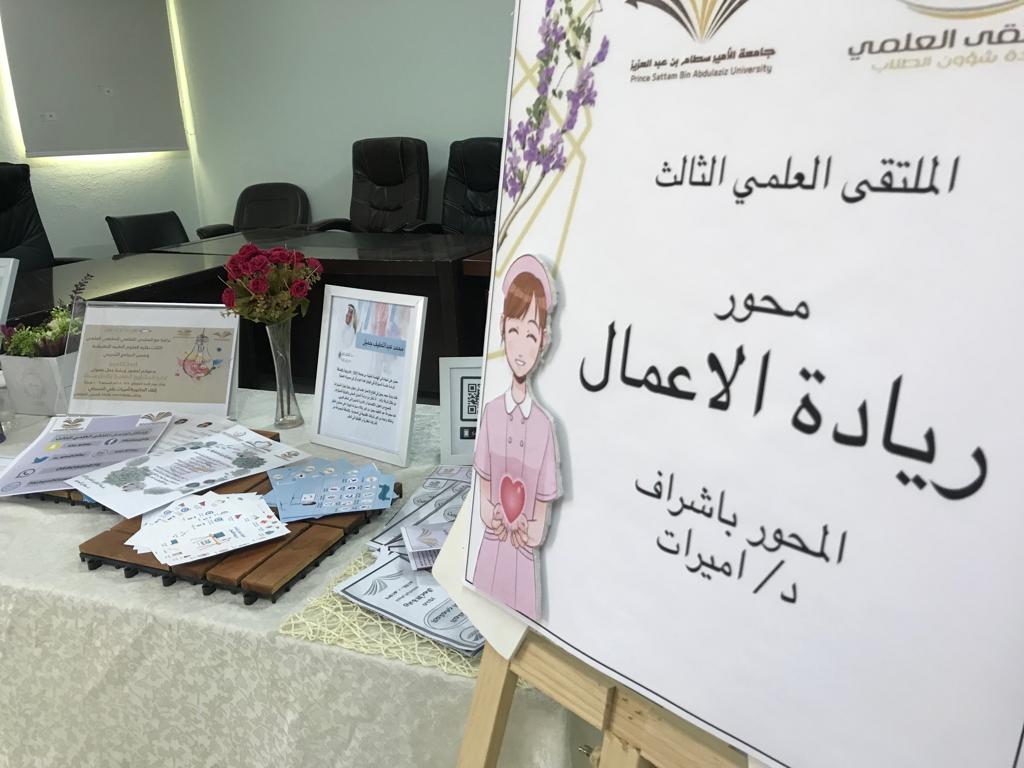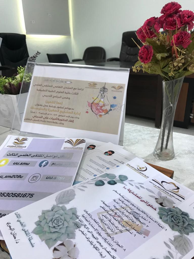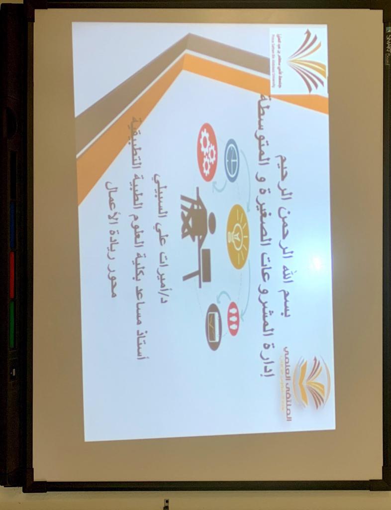 محاضرة بعنوان " إدارة المشاريع الصغيرة و المتوسطة" للتعريف بمحور ريادة الأعمال يوم الأحد الموافق ١٤٤٠/٥/٧ هـ تزامناً مع المنتدى الثقافي للملتقى العلمي الثالث بكلية العلوم الطبية التطبيقية وضمن البرنامج التدريبي معاً للتميز.