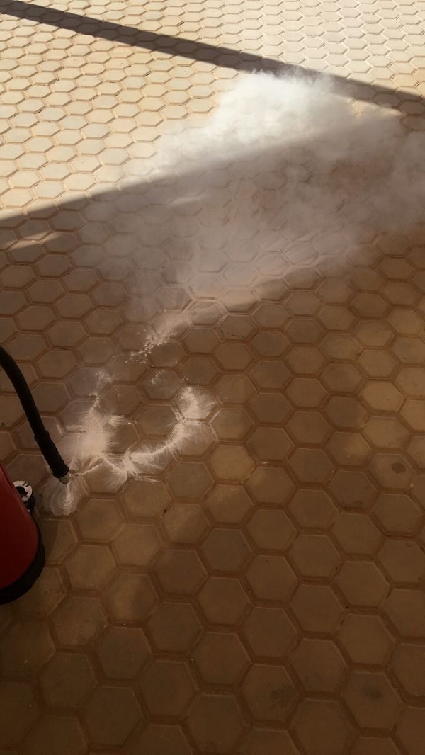 كما تضمن البرنامج ايضاَ تطبيقاً عملياً على استخدام طفاية الحريق من قبل أ. فاطمة راشد الدوسري ـ عضو في فريق السلامة التدريبي ـ حيث طبقت مع المتدربات استخدام الطفاية عملياَ.