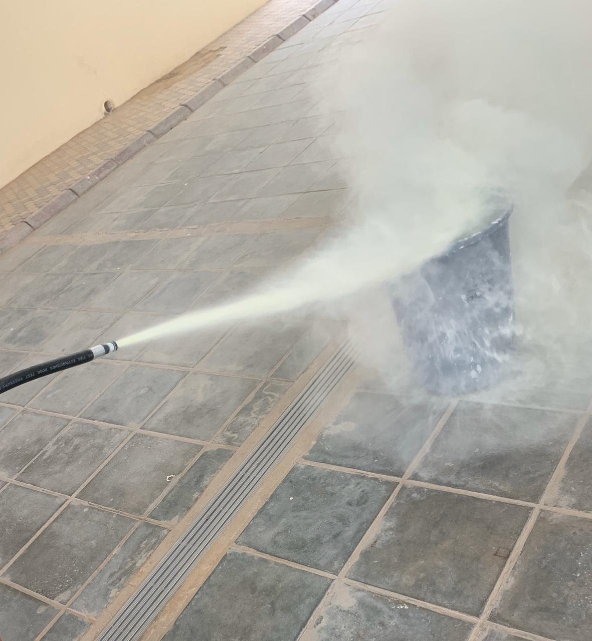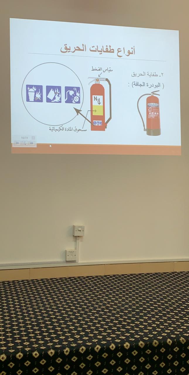 كما تم تدريب الحضور من طالبات ومنسوبات من قِبل مشرفات السلامة بالإدارة على كيفية استخدام الطفايات وتدريبهم على طرق الإطفاء.