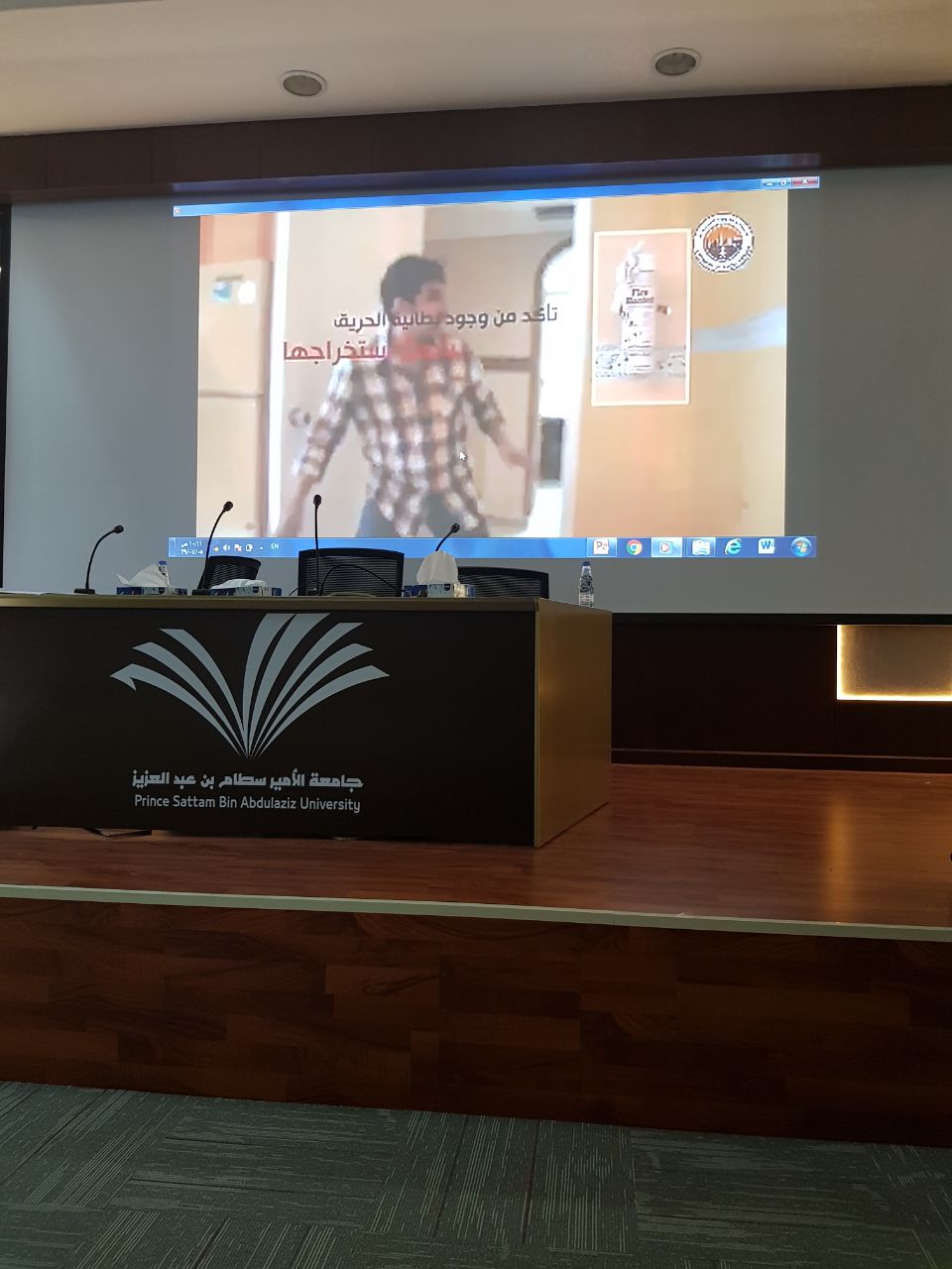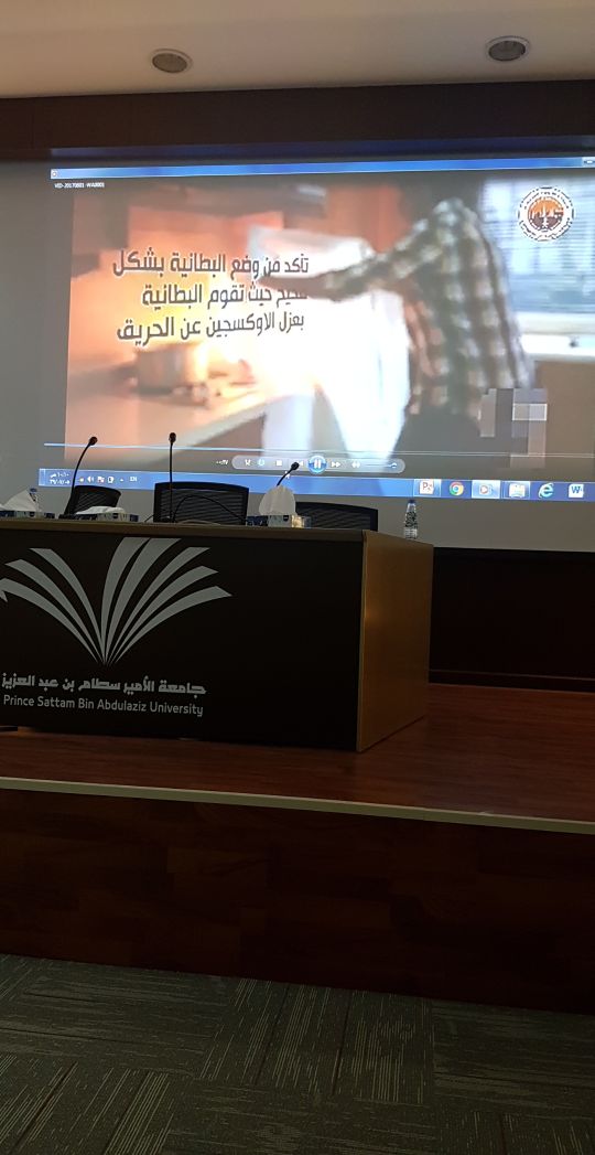 كما شمل البرنامج تدريباً عملياً للجنة السلامة وفريق الطوارئ بالكلية بصفة خاصة ولجميع الحضور عامة على كيفية استخدام طفاية الحريق، وكان ذلك من قِبل مشرفات السلامة أ/ فاطمة الدوسري و أ/ فاطمة الحجي و أ/ فاطمة الشمشير.