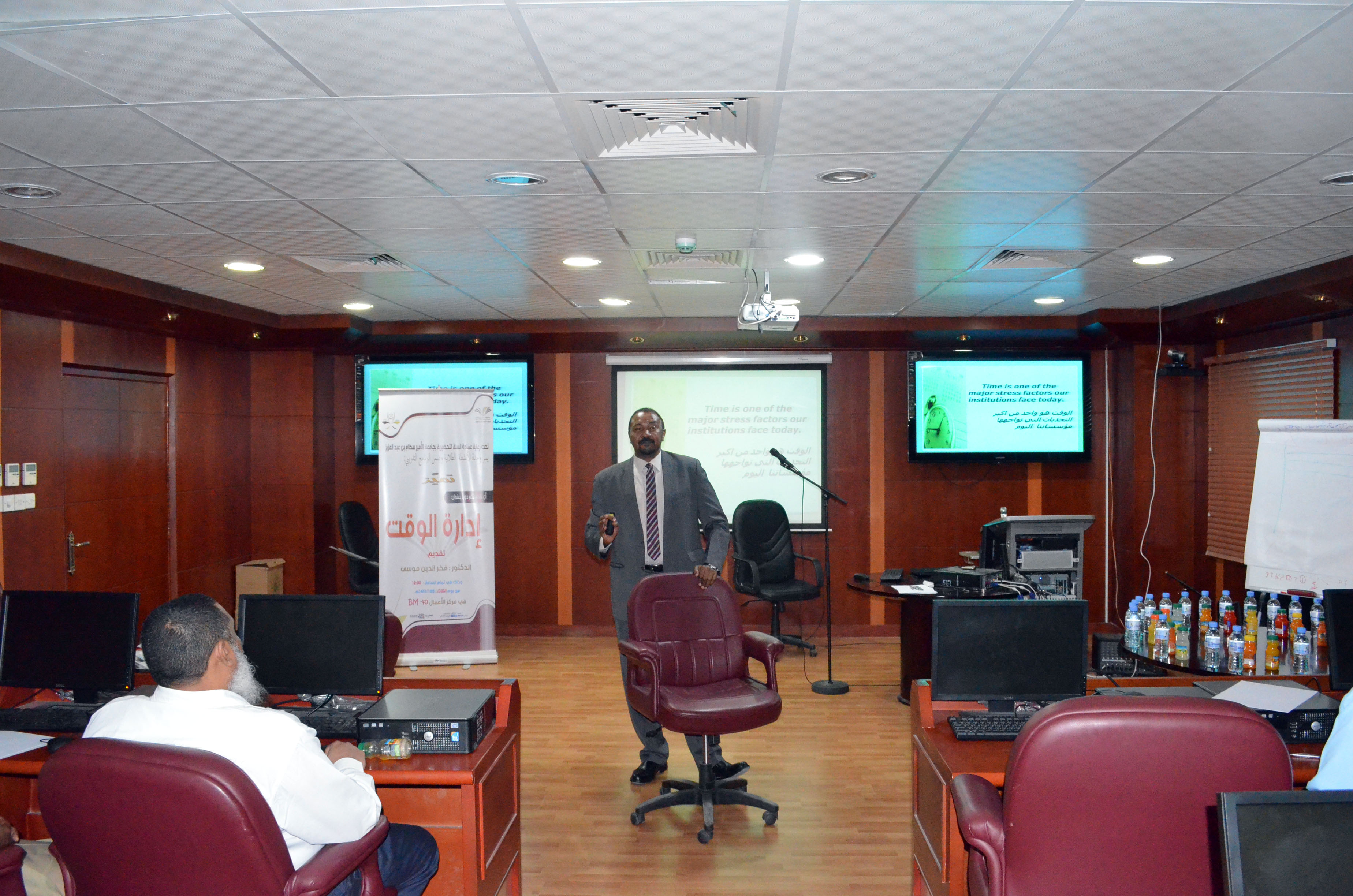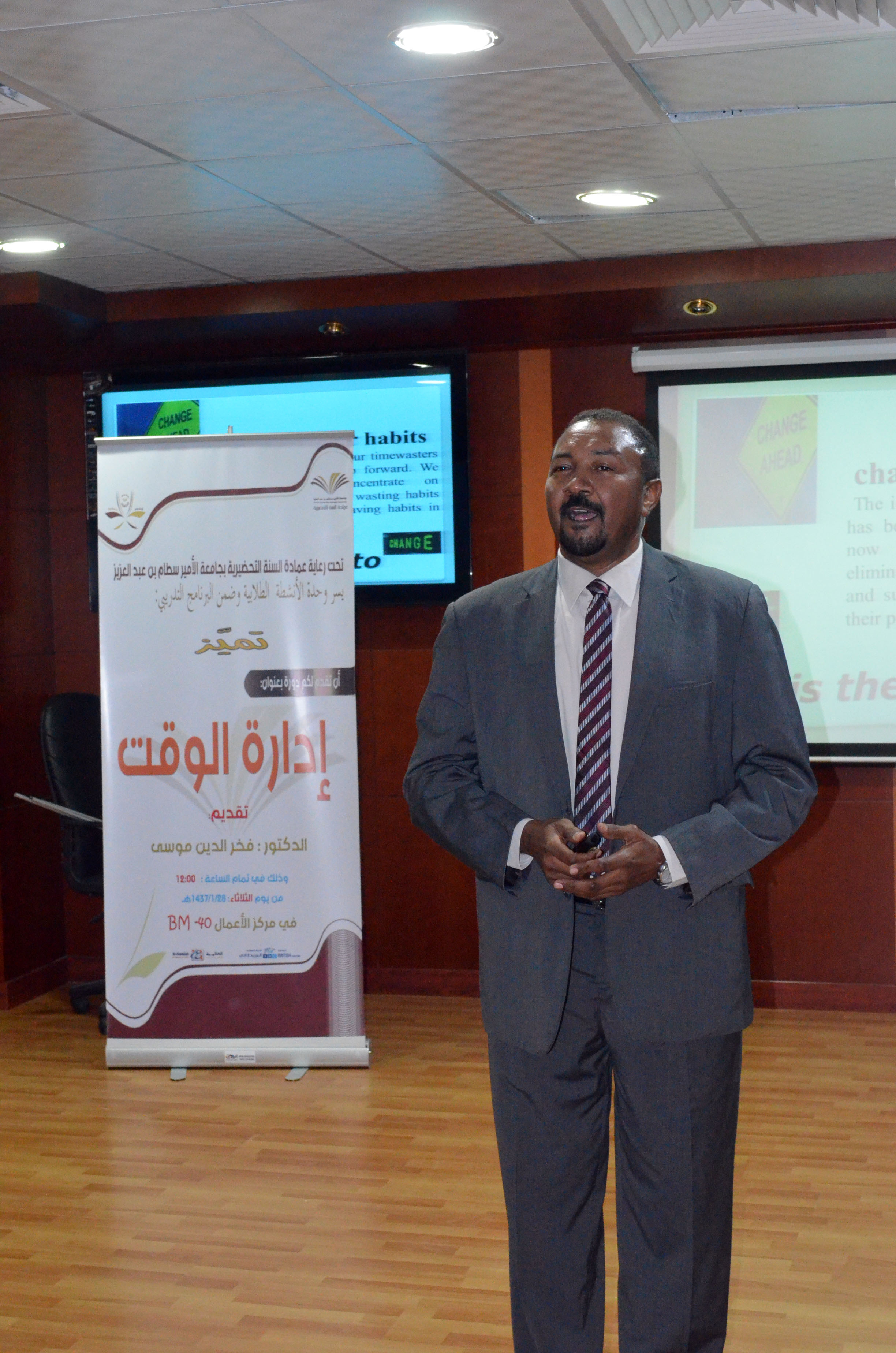 انطلاقًا من حرص عمادة السنة التحضيرية وتفعيلا لدورها في إيجاد برامج تسهم في تطوير أداء أعضاء هيئة تدريس، وضمن البرنامج التدريبي ( تميّز) أقيمت دورة تدريبية لأعضاء هيئة التدريس بعنوان (إدارة الوقت) قدمها الدكتور فخر الدين موسى في قاعة التدريب بالعمادة حيث تطرق إلى المفهوم ومما قال أن الوقت هو الحياة، والوقت هو الأساس، والوقت إن مضى لا يعود فانتهز هذه الفرصة قبل فوات الأوان واعمل في دنياك كأنك تعيش أبداً، وأعمل لآخرتك كأنك تموت غداً، واستشهد بقول الشاعر دقات قلب المرء قائلة له إن الحياة دقائق وثواني.