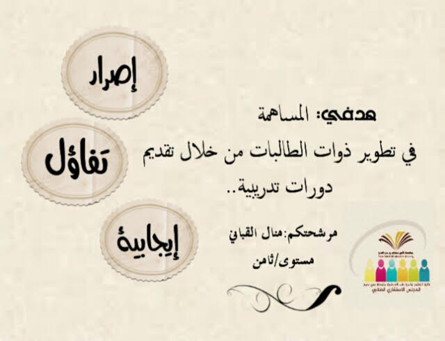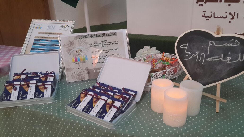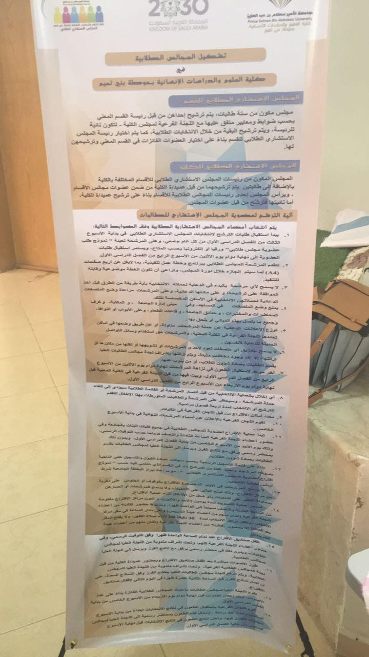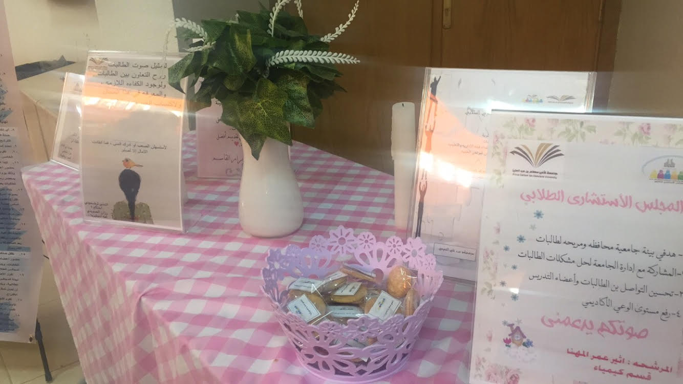 كما قامت وحدة المجالس الطلابية ممثلة برئيستها أ. فاطمة المسعد بعرض أبرز مهام المجالس الطلابية الاستشارية للطالبات وكذلك الجدول الزمني لتشكيل المجالس الطلابية وآلية الترشيح لعضوية هذه المجالس، ورافق العرض مجموعة من إعلانات المرشحات للمجالس الطلابية من كل قسم للتعريف بأهدافهن وتطلعاتهن داخل المجلس الطلابي طلبًا لدعمهن واستعدادًا لجمع أصوات الانتخابات خلال الأيام القادمة.