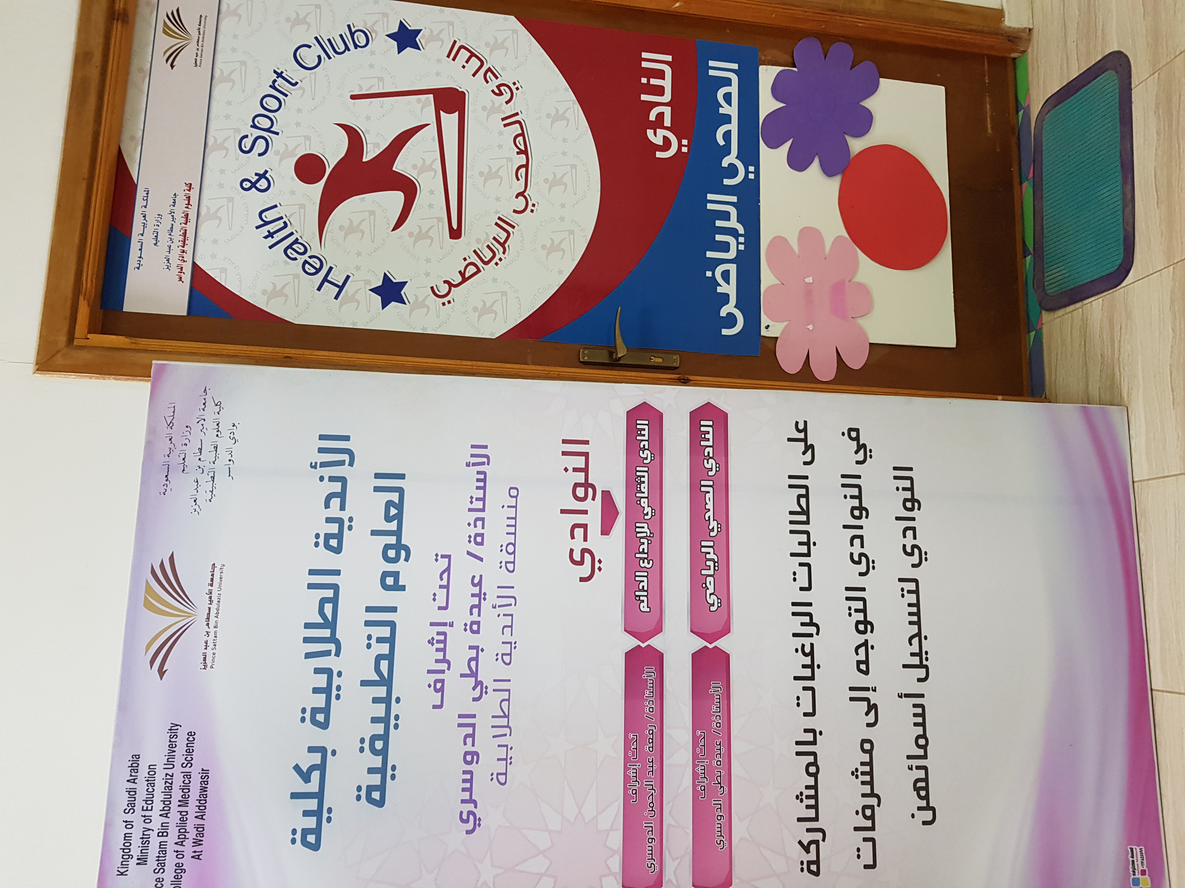 بتوجيه من مشرف كلية العلوم الطبيه التطبيقية بوادي الدواسر الدكتور ماجد علي الشريدة واشراف مشرفة الأندية. أ/عيده بطي ومشرفة النادي الرياضي أ/رفعه عبدالرحمن تم بحمد الله افتتاح النادي الرياضي بكلمة لمشرفة الأندية تحدثت فيها عن أهمية الانشطة الطلابية بصفه عامة والأنشطة الرياضية بصفه خاصة للصحة الجسمانية والنفسية بماتمثل محورا هاما من محاور بناء الشخصية المتكاملة للطالبات وأهمية الرياضة للطالبات وان الرياضة هي وسيلة الحصول على جسد سليم معافي كما أنها وسيلة للتخلص من الأمراض وقد ذكرت أهمية الرياضة في الإسلام. حيث تم التجول داخل النادي و تفعيل الأجهزة المتاحة به والاطلاع على أ هداف ومحتوي برنامج النادي الرياضى الذى أ عد بهدف الترويح عن منسوبات الكلية من طالبات وأعضاء هيئة التدريس وموظفات وتقديم الخدمات الرياضية بهجة وبساطة وفن وترويح ورياضة بهذا العبارات يمكن وصف النادي الرياضي في الكلية .وقد كانت لنا الرياده في إنشاء هذا النادي الرياضي كاول نادي لكلية طالبات في جامعة الامير سطام بن عبدالعزيز.