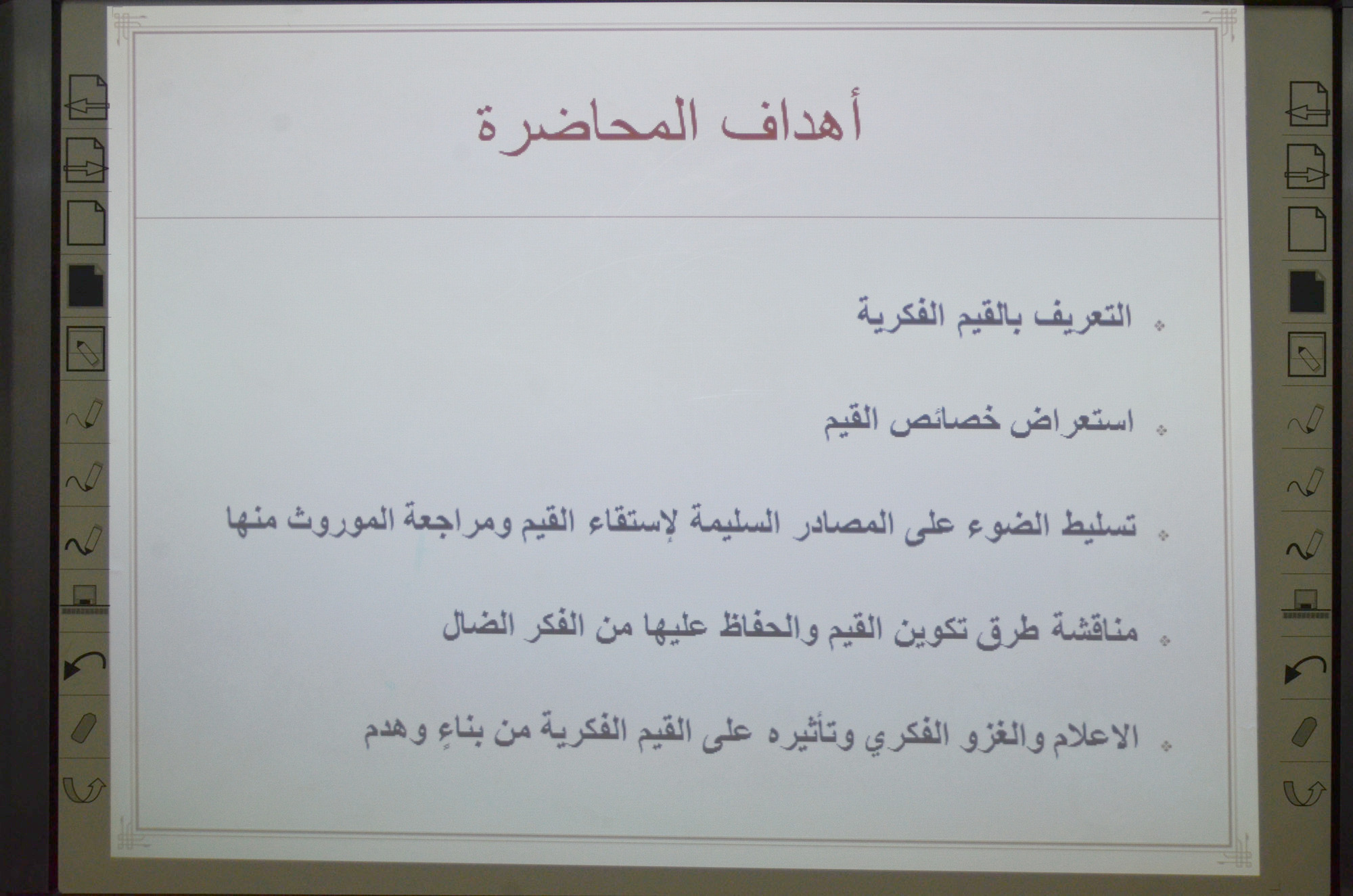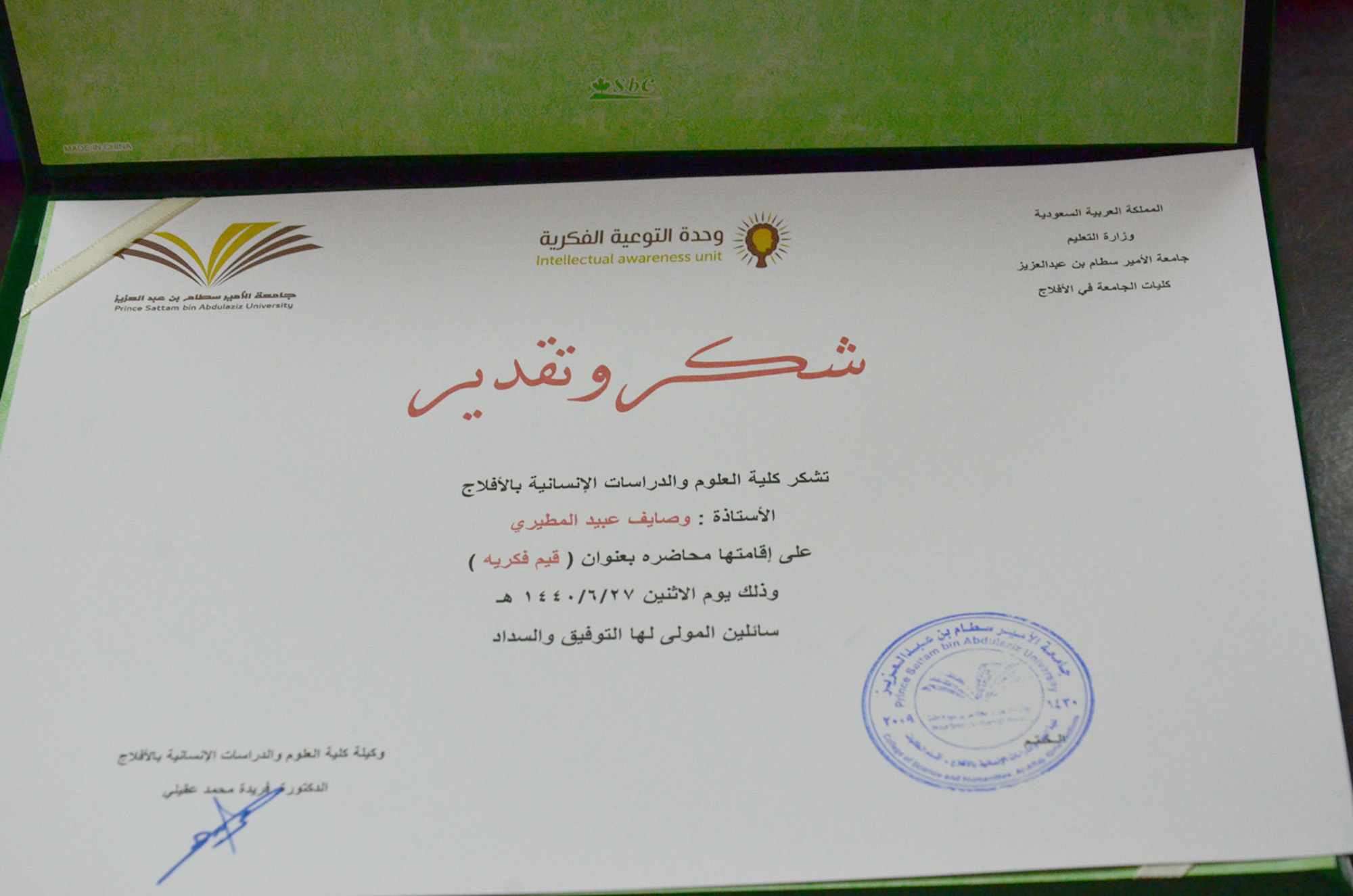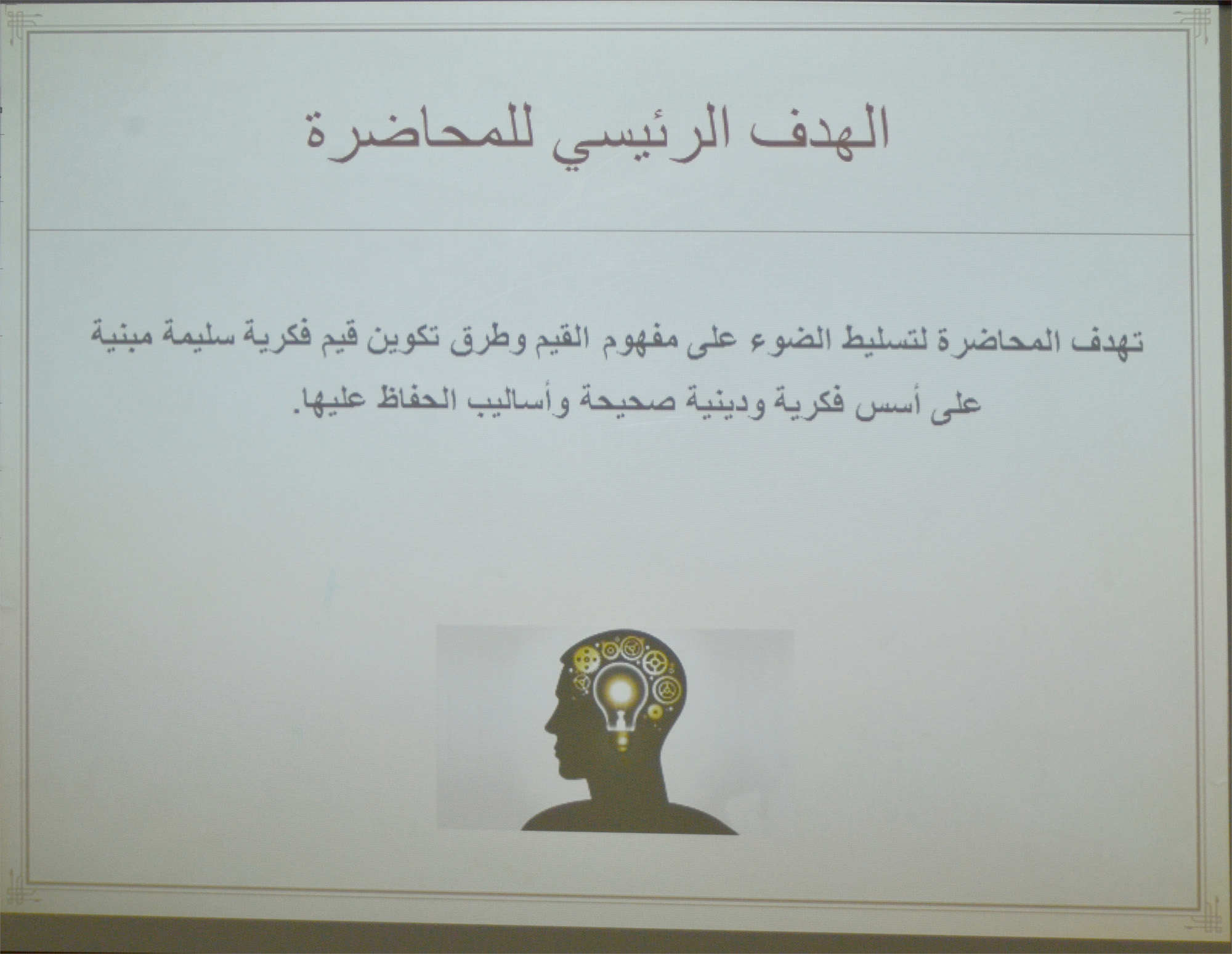 نظمت كلية العلوم والدراسات الانسانية بالأفلاج ( شطر الطالبات ) يوم الاثنين١٤٤٠/٦/٢٧ هـ الساعة الحادية عشرة في قاعة التدريب بالتعاون مع وحده التوعية الفكرية محاضرة بعنوان: "قيم فكرية" قدمتها عضو هيئة التدريس الأستاذة: وصايف المطيري , تناولت فيها عدة محاور منها طرق الحفاظ على قيمنا الفكرية الدينية والوطنية من الفكر الضال ومواجهته , وكذلك تم تسليط الضوء على الغزو الفكري من خلال وسائل الأعلام والتواصل الاجتماعي ودوره في هدم القيم السليمة و إحلال قيم أخرى قد تتعارض مع قيمنا الفكرية الدينية والوطنية , كما ذكرت عنصر الكوميديا والسخرية كوسيلة غزو فكري غير مباشر للنيل والحط من قيمنا ومجتمعنا وهويتنا , هدفت المحاضرة إلى تسليط الضوء على مفهوم القيم الفكرية وخصائصها و المصادر الموثوقة لاستقاء قيمٍ فكرية سليمة أو مراجعة الموروث منها اجتماعياً وأساليب الحفاظ عليها.