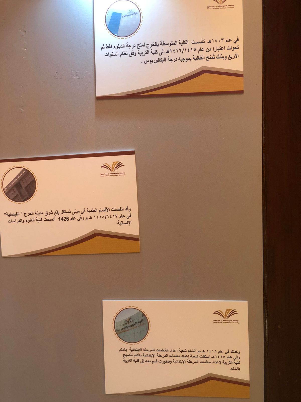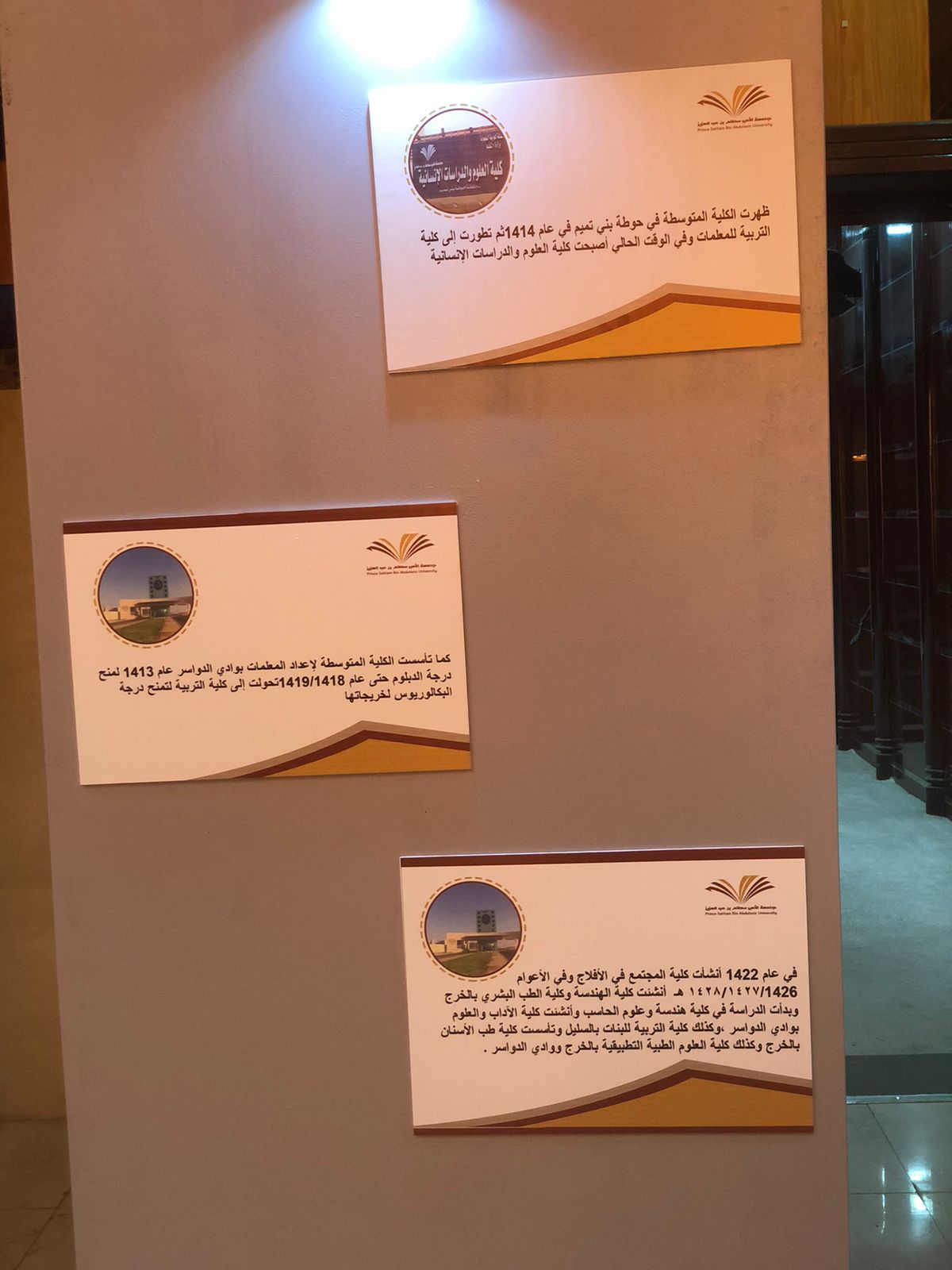 فبعد حفل خطابي ومعرض حمل تنوع الأرث الثقافي لبلادنا، نظم القسم النسائي بإدارة العلاقات العامة والإعلام صبيحة يوم الاثنين العشرون من شهر صفر احتفاءً باليوم الوطني السعودي الواحد والتسعون في بهو مبنى العمادات المساندة شاملا عروض مرئية ومعرض يحكي تطور جامعة الأمير سطام منذ البداية وحتى دخولها مجال المنافسة كإحدى الجامعات الرائدة في مجالات التعليم الجامعي، من تنوع في التخصصات وتبوء مكانة في البحث العلمي. إلى مبتعثين ومبتعثات يحققون إنجازات باسم الوطن.