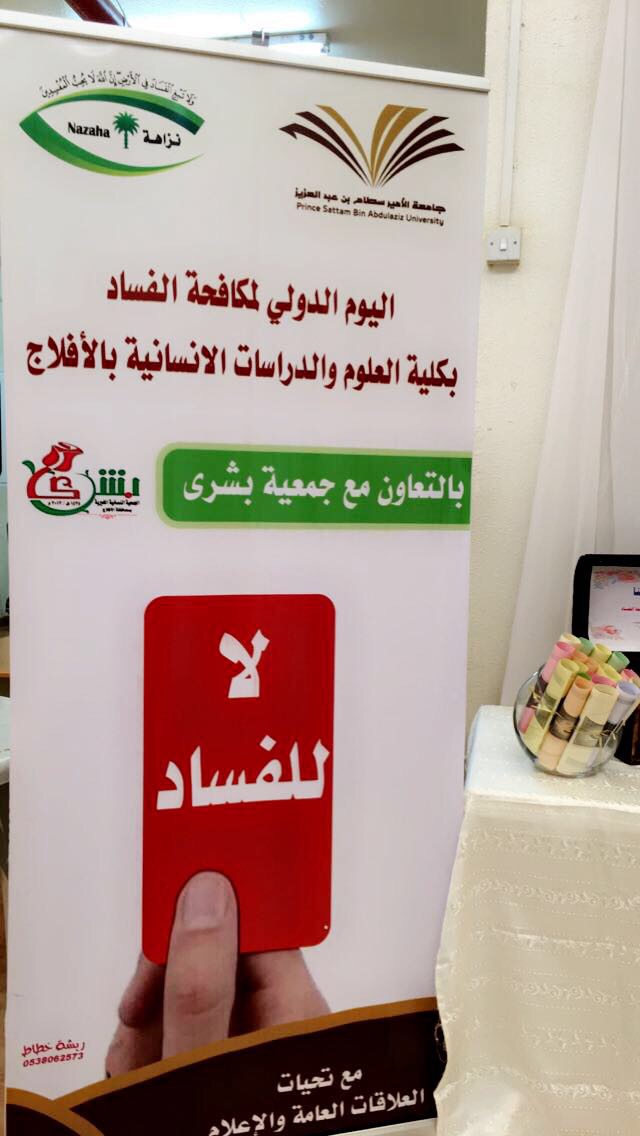 أقامت العلاقات العامة و الإعلام بكلية العلوم والدراسات الإنسانية بالأفلاج بالتعاون مع جمعية بشرى النسائية , اليوم الأحد 1438/3/12 هـ في تمام الساعة التاسعة و الربع ببهو المبنى الرئيسي احتفاء باليوم الدولي لمكافحة الفساد , قدم البرنامج مديرة العلاقات العامة أ: منيرة الرشود ,أوضحت في مقدمتها أن الفساد آفة عالمية تشكو منها كل الدول لما له من مخاطر على الأمن الإجتماعي و النمو الإقتصادي و الأداء الإداري , بعد ذلك عُرض فيديو عن مظاهر الفساد و كيفية محاربتها , تلى ذلك محاضرة القتها مديرة جمعية بشرى النسائية أ: ريم آلزعير , كان مفادها نحن المسؤولون عن زرع القيم و الأخلاق في نفوس الناشئة , لان عكس ذلك هو سبب تفشي الفساد بجميع مظاهره , فإذا اردت الإصلاح ابدأ بالأساس , بعد ذلك كرمت مساعدة العميد د: وصال عز الدين مديرة جمعية بشرى النسائية و كل من ساهم في نجاح البرنامج , حيث اشتمل البرنامج على ركن حوى رسومات لمشاركة الطالبات في هذا السياق , حضر عدد كبير من الطالبات و اعضاء هيئة التدريس و الطاقم الاداري , يهدف البرنامج الى التوعية ونشر ثقافة النزاهة والإرشاد لمضار الفساد و الشد عليهم لنكون يد واحدة لمحاربته .