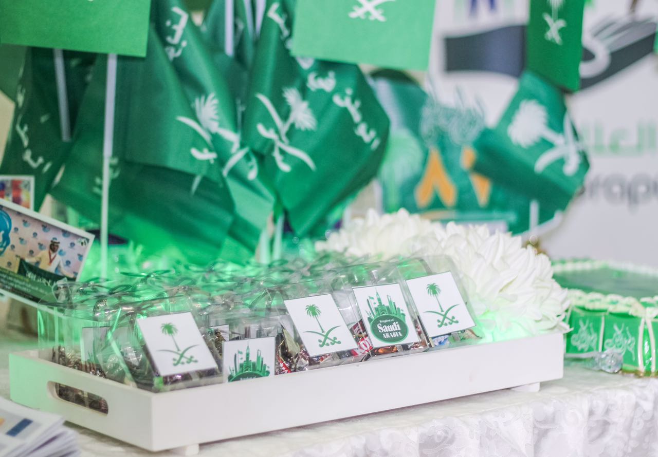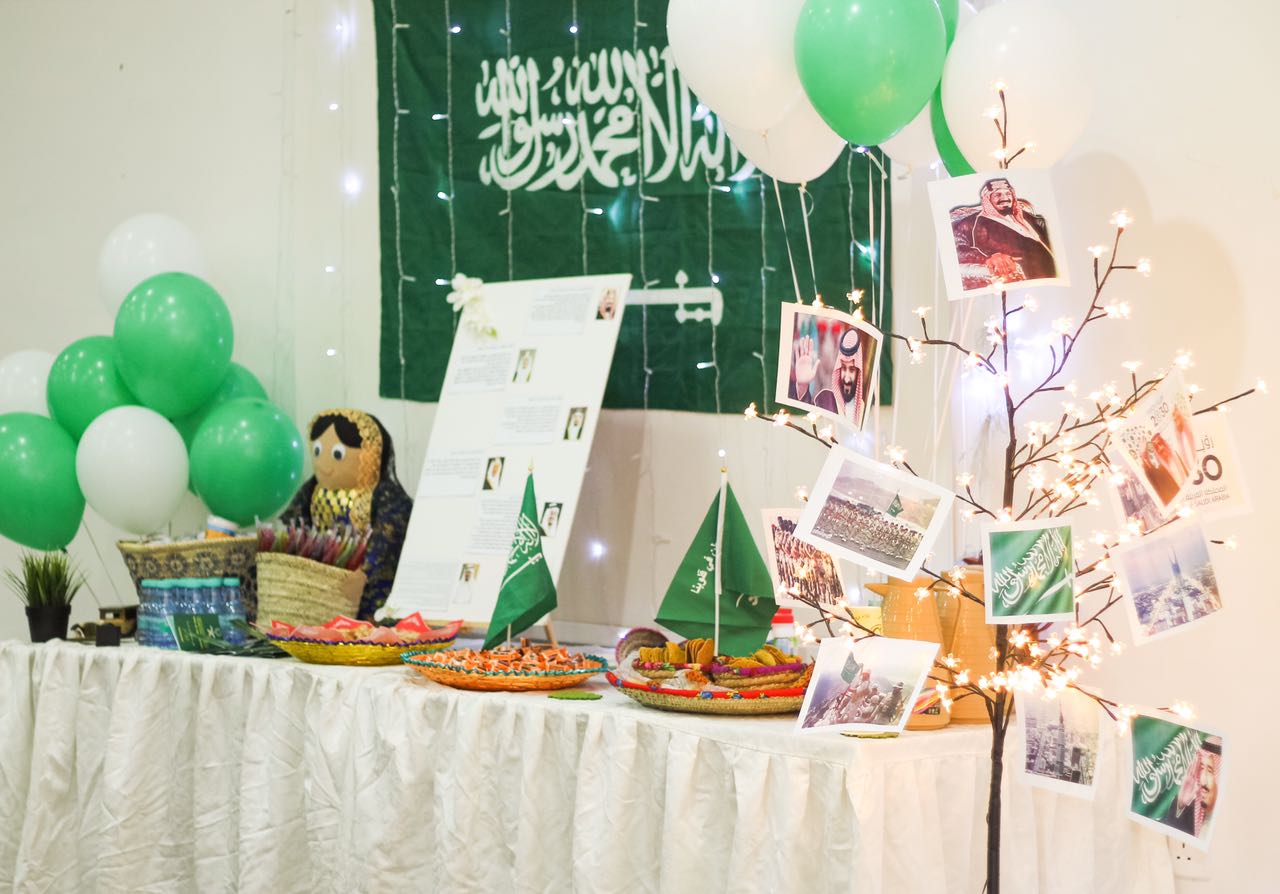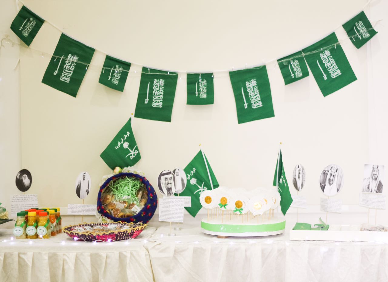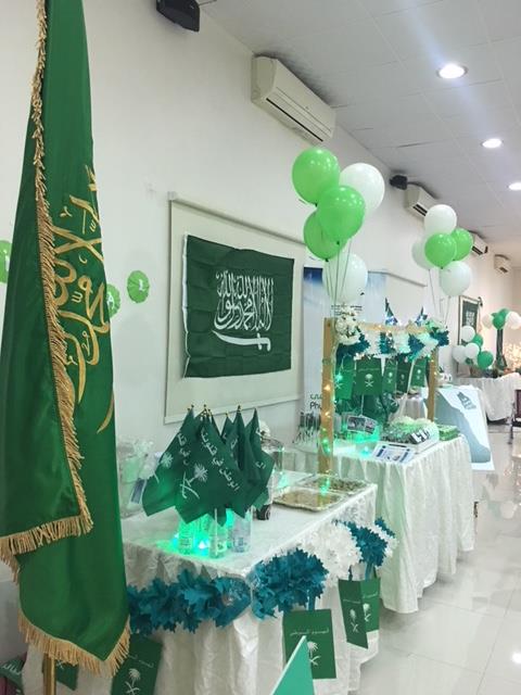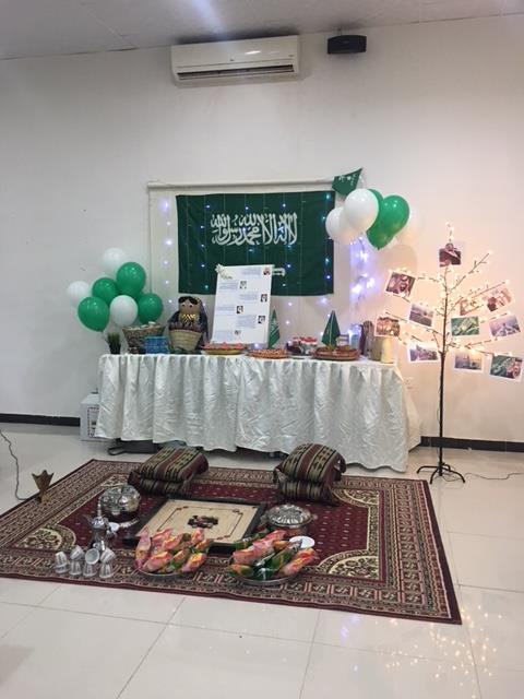 وقد بدأت فعاليات هذا اليوم المجيد بتجهيز الأركان والمعرض المصاحب للحفل وبعد ذلك تم عرض النشيد الوطني السعودي والعرضة السعودية.