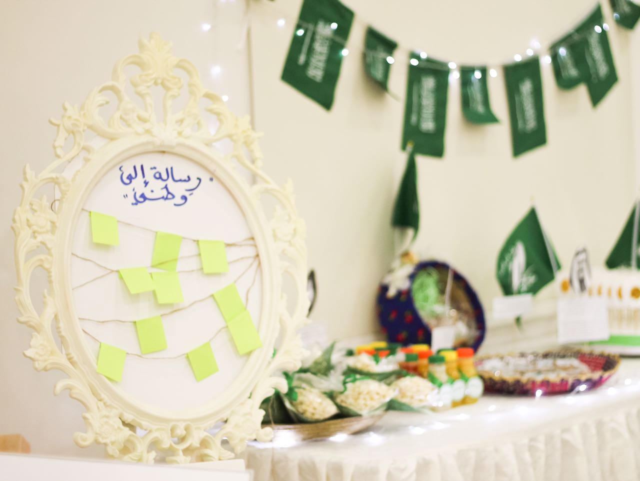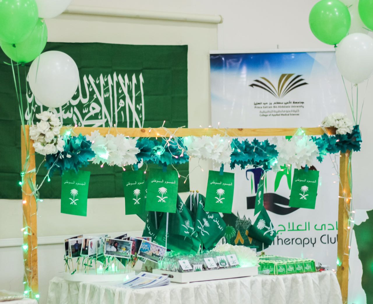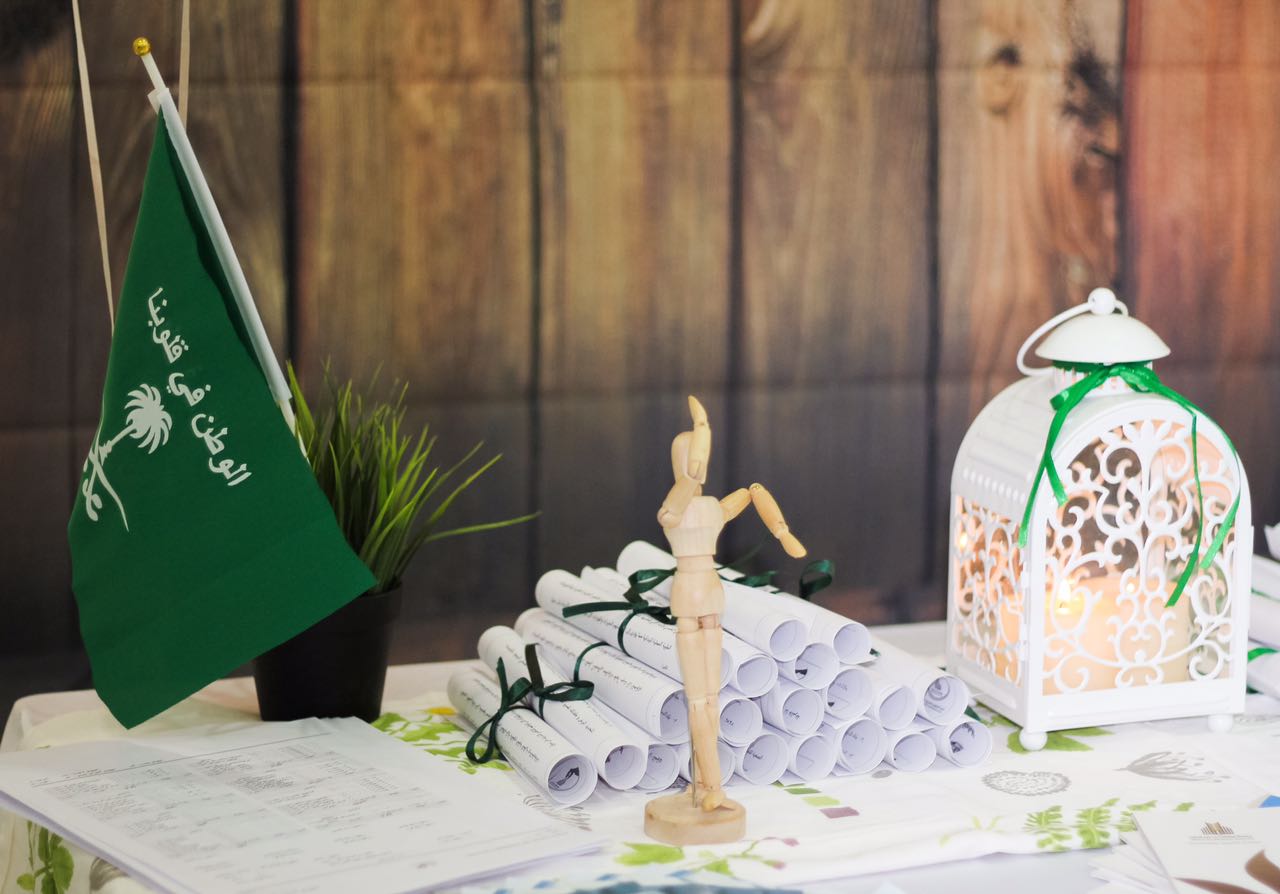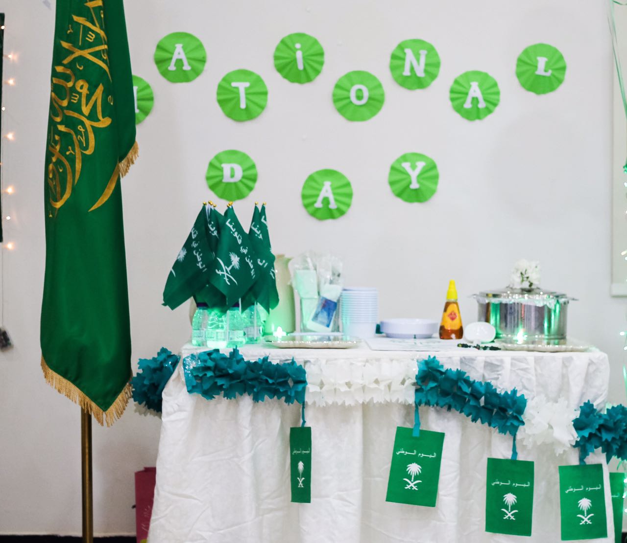 وقد بدأت فعاليات هذا اليوم المجيد بتجهيز الأركان والمعرض المصاحب للحفل وبعد ذلك تم عرض النشيد الوطني السعودي والعرضة السعودية.