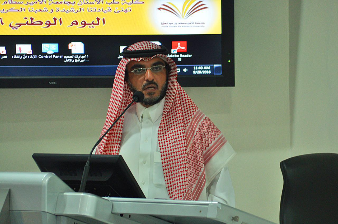 احتفلت كلية طب الأسنان الأسنان بجامعة الأمير سطام بن عبدالعزيز بـ"اليوم الوطني" وأستهل الحفل آيات من الذكر الحكيم ,ومن ثم كلمة سعادة عميد الكلية عن الوطن ورحب سعادته بالحضور من وكلاء الكلية وبقية أعضاء هيئة التدريس وطلاب الكلية ,ثم ألقى الطالب عايض القحطاني قصيدة وطنية ,بعدها قدم الطالب حمد الدريهم كلمة عن حب الوطن وواجبنا نحوه , أزداد الحفل جمالاً بحضور الطلاب وأعضاء هيئة التدريس واصحاب السعادة وكلاء الكلية ورؤساء الأقسام .
