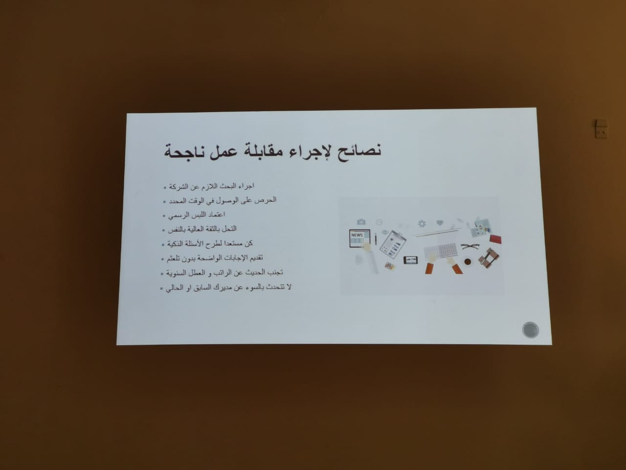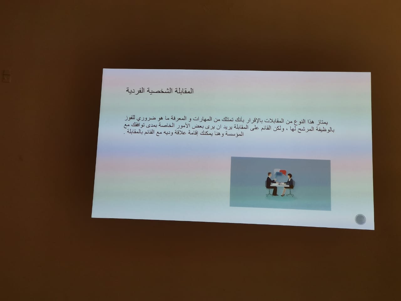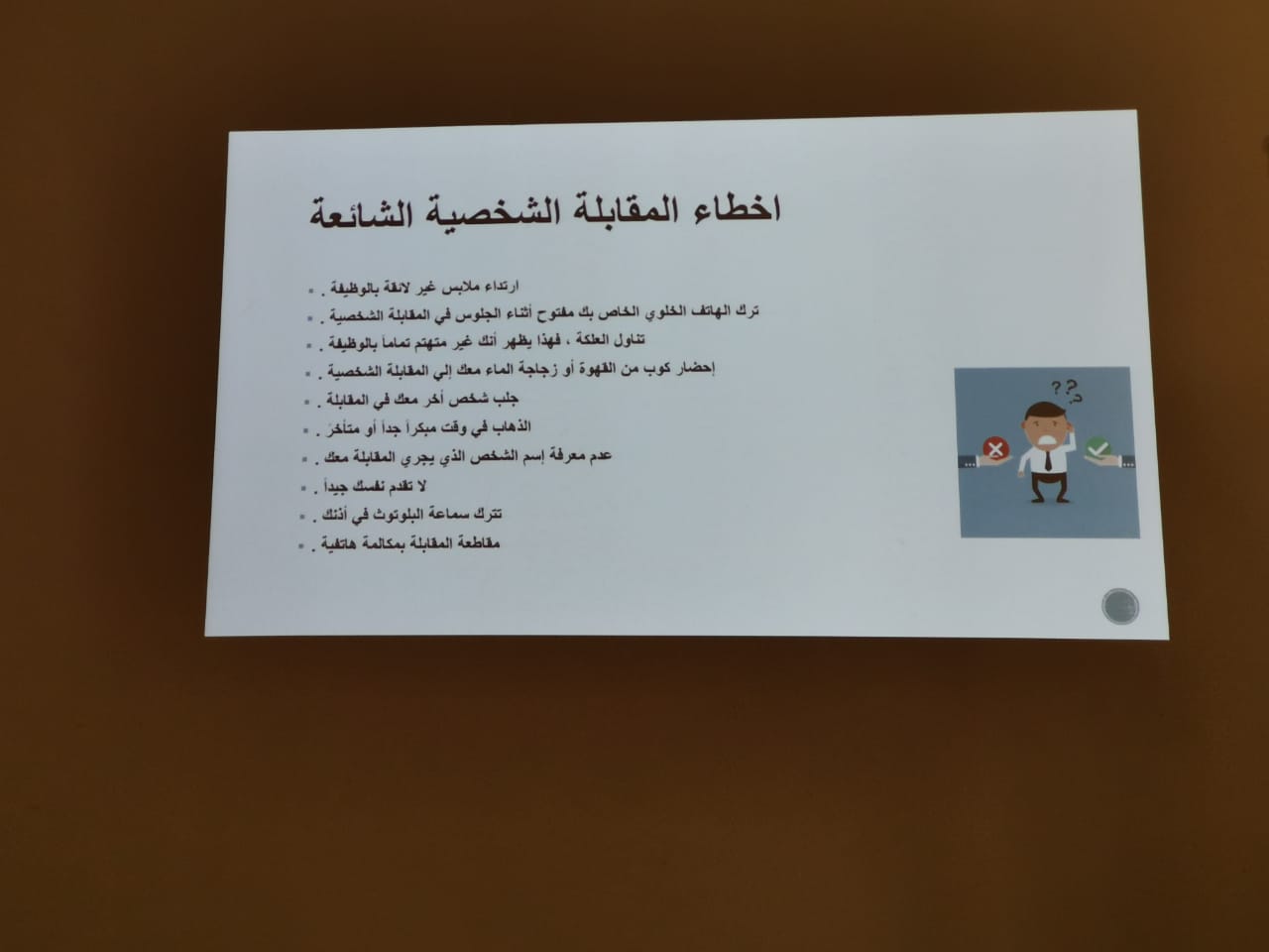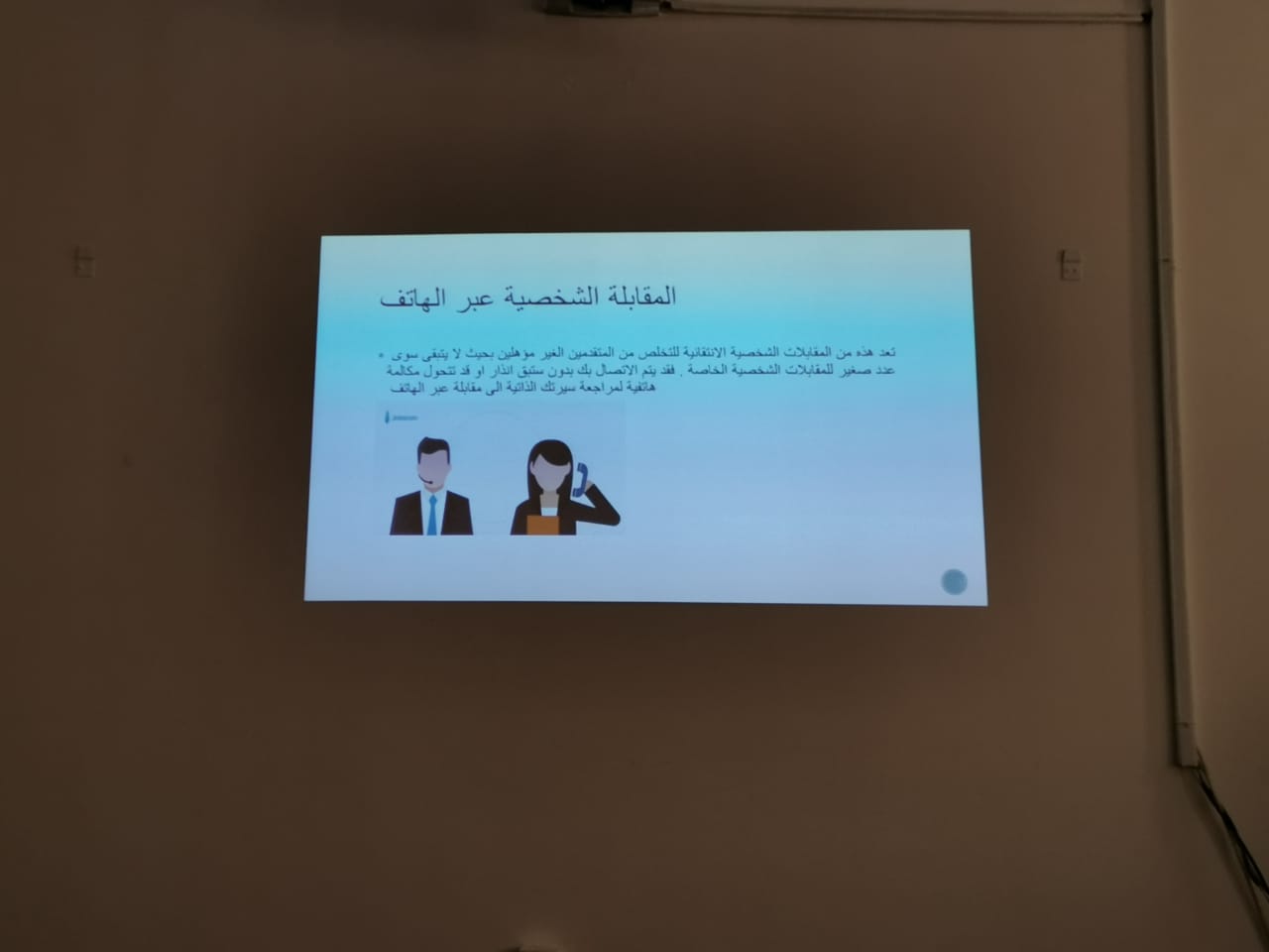 قدمت طالبات نادي العلوم الأساسية بعمادة السنة التحضيرية دورة بعنوان ( اجتياز المقابلة الشخصية ) تحت اشراف الأستاذتين: أ/ راضية حميدة وأ/زهراء علي يوم الثلاثاء الموافق ١٤٤١/٠٢/٢٥هـ, ابتدأتها الطالبة شعاع المغنم بمقدمة بسيطة اشتملت على تعريف عن المقابلة الشخصية وأهميتها في الدخول إلى عالم الحياة العملية. عقبها أوضحت الطالبات العنود الخويلدي، أمجاد المالكي، وداد اليوسف أنواع المقابلات: الفردية والجماعية والمقابلة عبر الهاتف. كما أوضحت الطالبةأمجاد المالكي الأخطاء الشائعة التي يقع فيها الشخص أثناء المقابلة كالجلوس الخاطئ والابتسامة الزائدة و غيرها من الأخطاء. تلتها الطالبةالعنود الخويلدي بتقديم نصائح وإرشادات لكي تكون المقابلة ناجحة كاللبس الرسمي والحضور قبل الموعد بنصف ساعة والإجابة على قدر السؤال والجلوس الصحيح والثقة بالنفس. اختتمت الدورة بتقديم كلمة شكر من قبل الحضور للطالبات اللاتي اعددن و قدمن الدورة وللأستاذتين أ. راضية حميدة وأ. زهراء علي على حسن اختيارهن لمثل هذه المواضيع التي تعود بالنفع والفائدة لطالبات ومنسوبات العمادة.