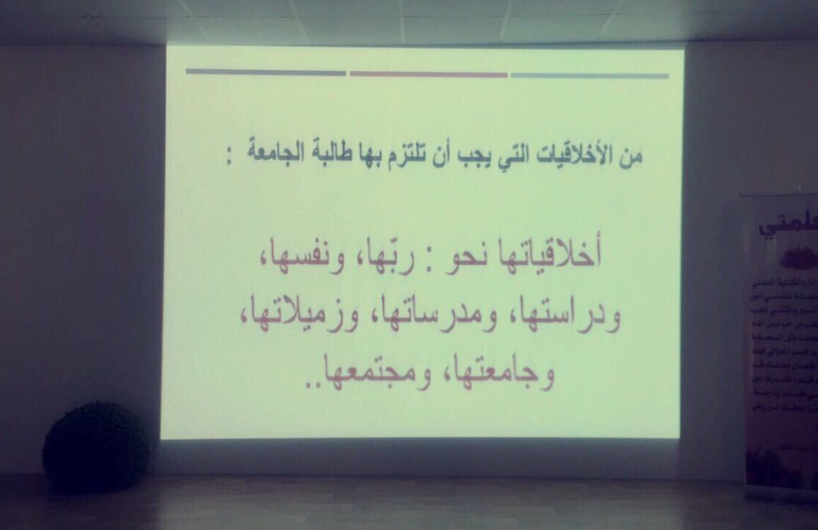 تحت إشراف وحدة العمل الطلابي بالتعاون مع قسم الدراسات الاسلامية إقيمت فعالية بعنوان ( اخلاقيات الطالبة الجامعية ) يوم الخميس الموافق 17/6/1438هـ بإشراف د. روضة عبد المنعم منسقة الأنشطة بالقسم ،حيث هدفت الفعالية إلى بيان الأخلاق التي يجب أن تتخلق بها الطالبة الجامعية في ضوء التربية على الاستقامة والجدية وقد أعدت الطالبات لهذه الفعالية عدد من الفقرات من خلال عدة عناوين كالصدق والامانة و اتباع الرسول صلى الله عليه وسلم والتوسط والاعتدال والإقبال على الطاعات,وان تتخلق العفة وصحبة الجادين ومواجهة المشكلات والبعد عن الغش والهمة في طلب العلم ,وكان الهدف من الفعالية بيان لأهمية الاخلاق في سلوك الفتاة المسلمة ,وبيان لأهمية الاخلاق في تحقيق الأهداف والنوايا والمحافظة على قيم الطالبة الجامعية , واستهدفت الفعالية الطالبات بجميع الأقسام وقد كان عدد الحضور 40 طالبة.