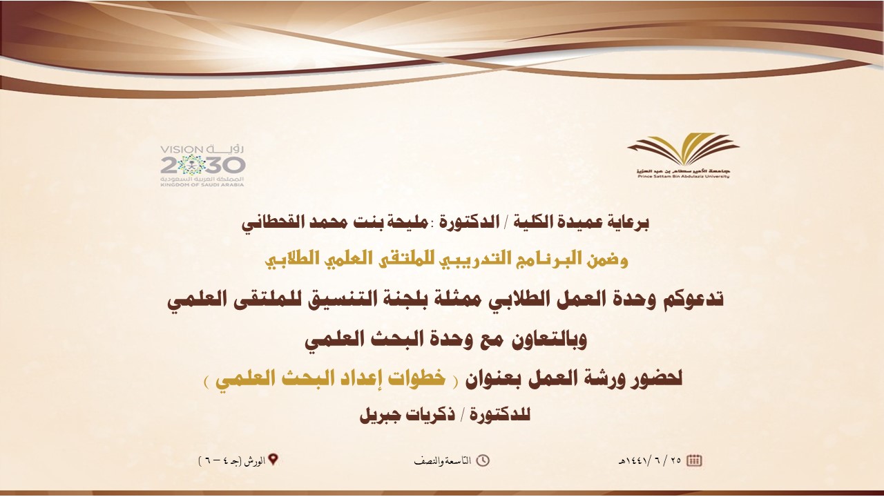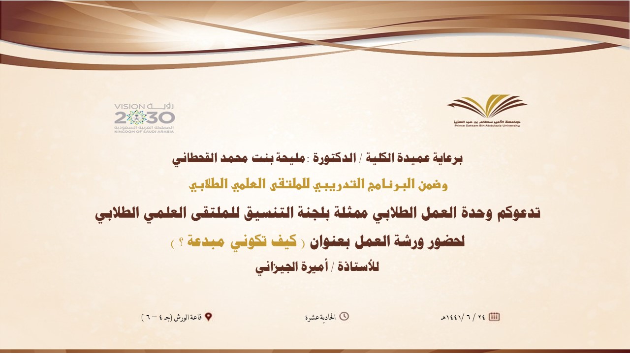 بهمة تسمو للقمم وبخطوات كلها عزم ، وبرعاية كريمة من عميدة كلية التربية بالدلم ومتابعة من وكالة الشؤون التعليمية والأكاديمية أنهى الملتقى العلمي الطلابي باشراف الدكتورة أسماء الزهراني برامجه التدريبية للطالبات والتي انطلقت مطلع الأسبوع الماضي ابتداءً من يوم الأحد الموافق : 22/ 6/ 1441هـ