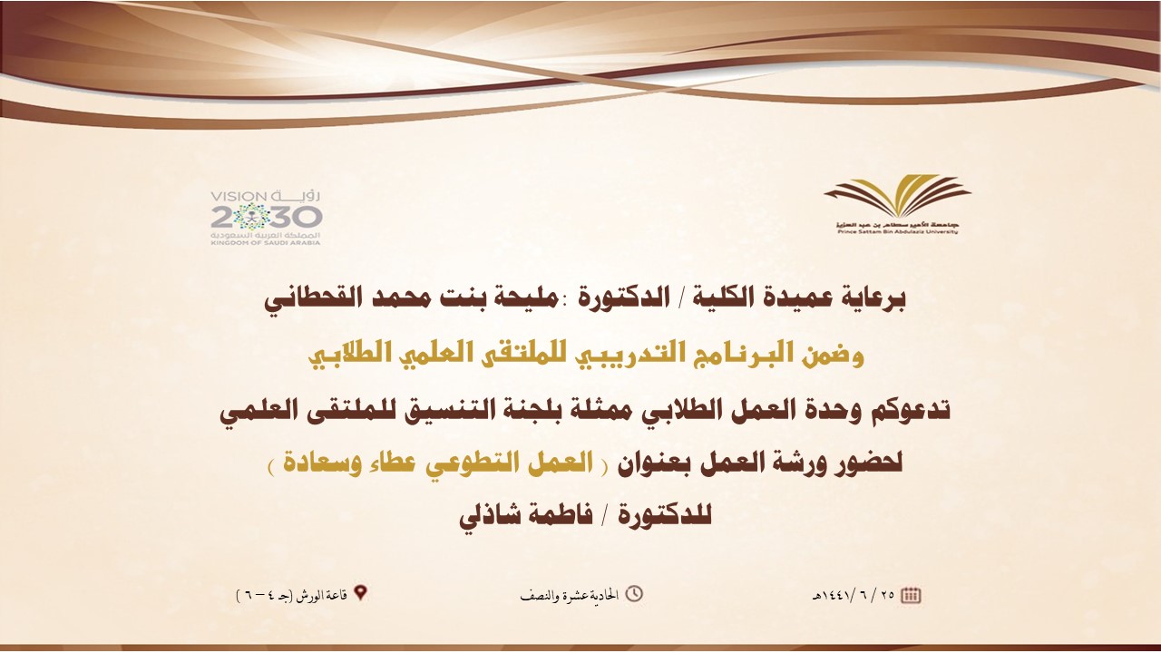 كما قدمت الدكتورة ذكريات جبريل دورة بعنوان ( خطوات إعداد البحث العلمي) والدكتورة فاطمة شاذلي دورة بعنوان ( العمل التطوعي عطاء وسعادة ) يوم الأربعاء : 25/ 6/ 1441هـ