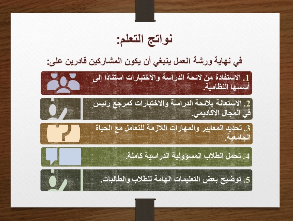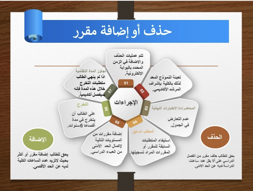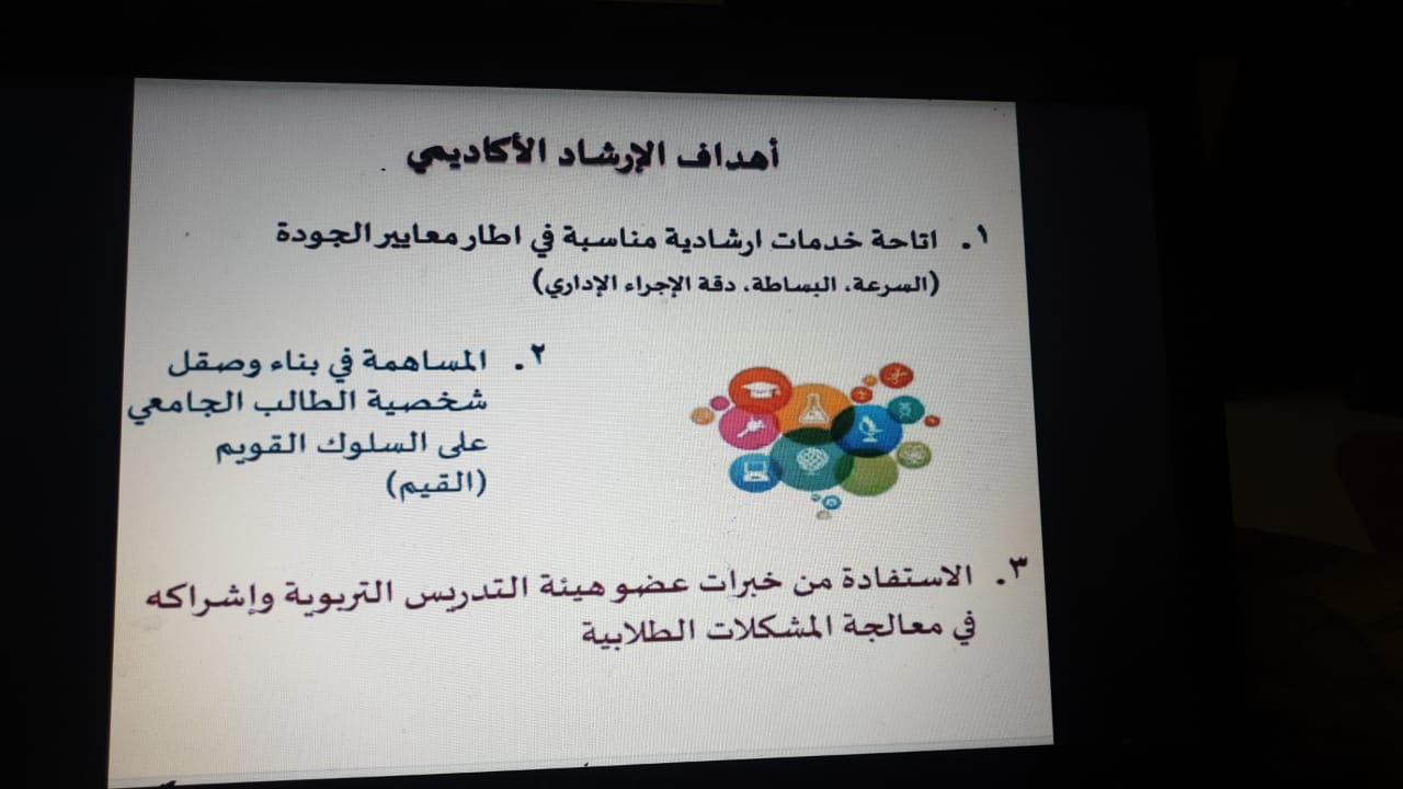 ثم قدمت د. سحر عبده- رئيسة وحدة البحث العلمي بالكلية- في اليوم الأول من الأسبوع الإرشادي ورشة بعنوان" لائحة الدراسة والاختبارات - تعليمات وأنظمة "هدفت إلى تعريف الطالبات بنظام الدراسة والاختبارات(عملية الحذف والإضافة وتسجيل المقررات- الإنذار الأكاديمي- التأجيل والاعتذار- الحرمان والانقطاع وكيفية إعادة القيد وكيفية احتساب المعدل التراكمي)كما اشتمل اليوم الثاني الثلاثاء 21/2/1443 هـ على لقاء تعريفي بالحقوق والواجبات الطلابية تقديم د. ابتهال المبرد والذي يهدف الى توعية الطالبة المستجدة بما لها من حقوق وما عليها من التزامات وتعريفها باللائحة التأديبية لجامعة سطام و تبصيرها بحقوقها الأكاديمية وغير الأكاديمية، وفى اليوم الثالث الأربعاء 22/2/1443 هـ تم التعريف برؤية ورسالة و أهداف ووسائل التواصل لكل من وحدة الإرشاد الاكاديمي د. أمل على محمد زين و الإرشاد النفسي د. أسماء الشخيبى و وحدة ذوى الاحتياجات الخاصة د. منى عبدا للطيف.