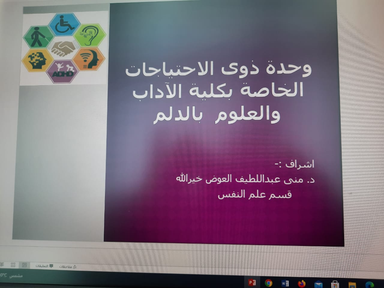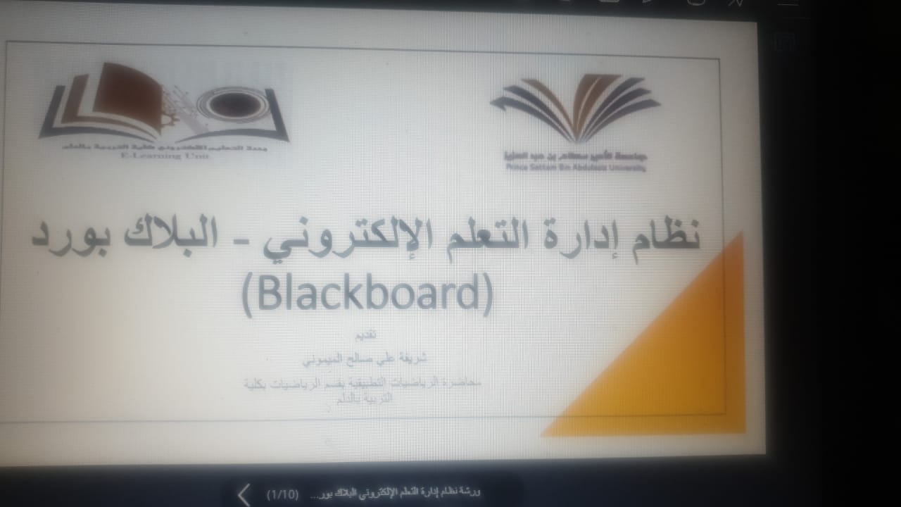 اختتمتا. شريفه الميمونى -منسقة التعلم الإلكتروني بالكلية يوم الخميس 23/2/1443 هـ ورشة بعنوان "إدارة التعلم الالكتروني – البلاك بورد" والتي تهدف إلى تمكين الطالبة المستجدة من استخدام أساسيات البلاك بورد مثل معرفة معلومات المقرر وتحميل المحاضرات والوصول للواجبات والتفاعل في منتديات المناقشة استخدم المنفذون عروض تقديمية مشوقة وجاذبة للانتباه باعتبار أن العروض التقديمية وأسلوب المنفذ من أهم عناصر تحفيز الطلاب في التعليم عن بعد.