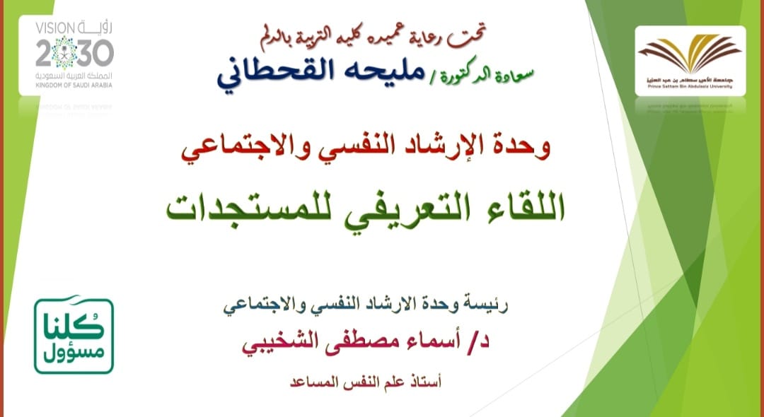 في إطار أنشطة وحدة الإرشاد الأكاديمي الموجهة للطالبات المستجدات، وبتوجيه من عميدة الكلية الدكتورة/ مليحة بنت محمد القحطاني، قدمت وكالة الشؤون التعليمية والأكاديمية بالكلية ممثلة في وحدة الإرشاد الأكاديمي برنامج اللقاء التعريفي للطالبات المستجدات للفصل الدراسي الأول للعام 1443 هـ في الفترة من الاثنين 20/2/1443 هـ إلى الخميس 23/2/ 1443 هـ بإشراف الدكتورة أمل على محمد زين- رئيسة وحدة الإرشاد الأكاديمي بالكلية.