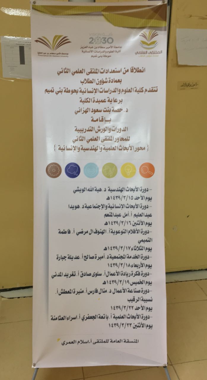 تحت رعاية سعادة عميدة كلية العلوم والدراسات الانسانية بحوطة بني تميم الدكتورة حصة الهزاني ومنسقة الملتقى العلمي الثاني الأستاذة إسلام العمري، تم اختتام التحضيرات والدورات التأهيلية للملتقى العلمي داخل الكلية حيت تم التفعيل لمدة أسبوعين من تاريخ 15_25 /3/1439 هـ. تضمنت فترة التهيئة عدد من الدورات والاجتماعات واللقاءات التعريفية كالتالي :