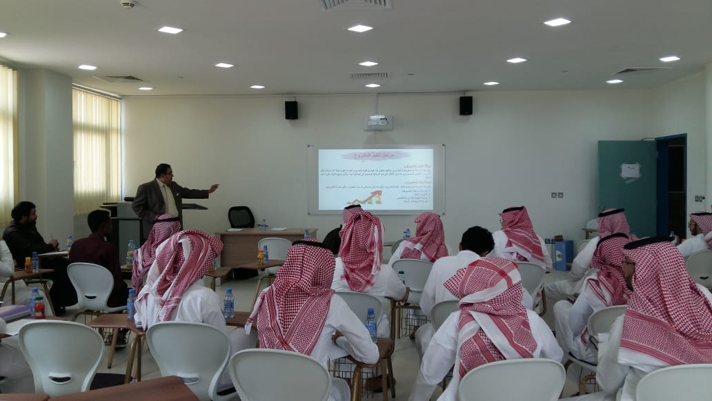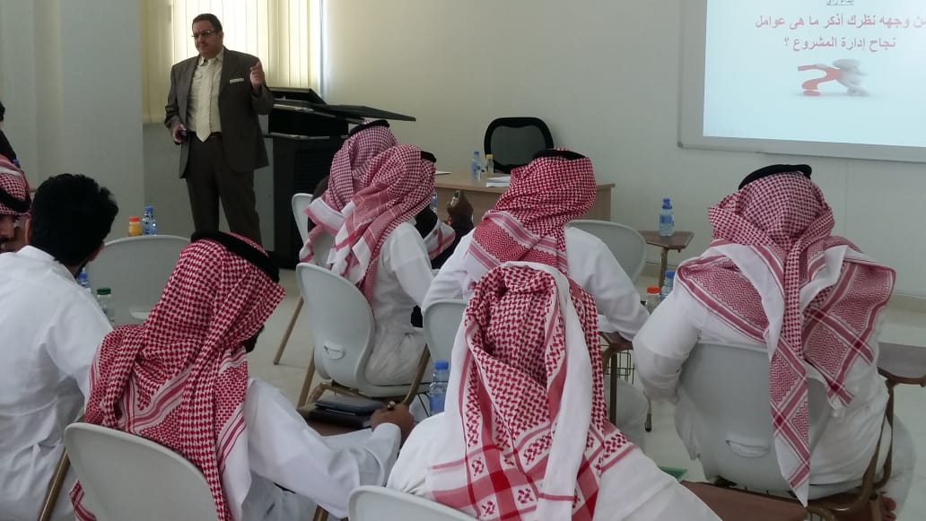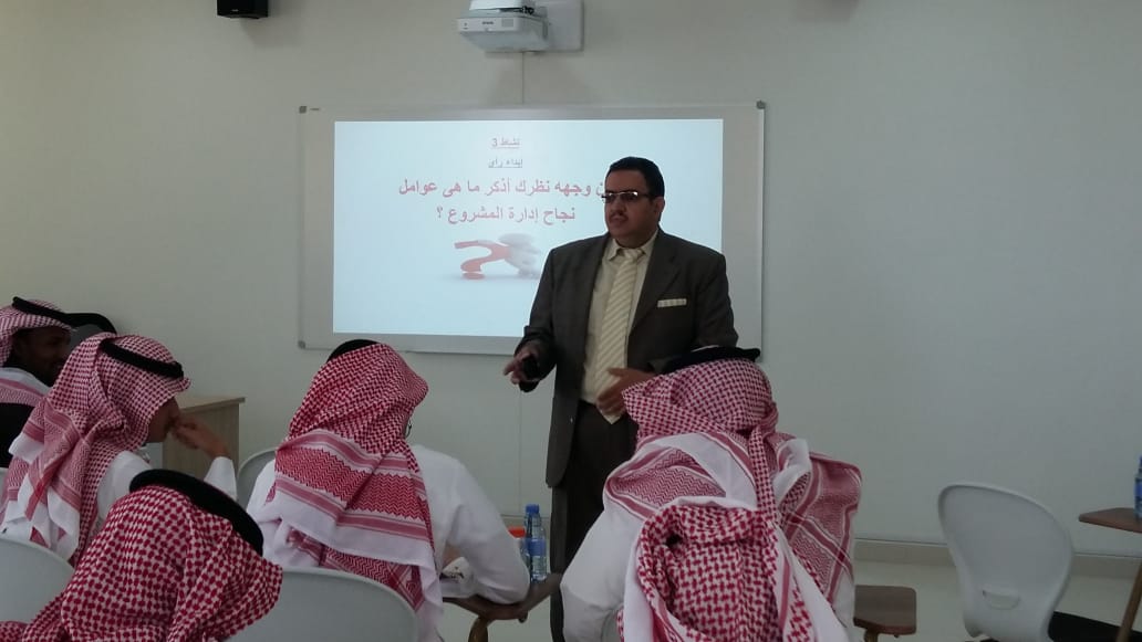 وأعتمد المنسي على عدد من المحاور تعريف وخصائص المشروع ، مراحل المشروع ، مفهوم وعوامل نجاح إدارة المشروع ، صفات ومهام مدير المشروع الناجح ، مفهوم دراسة الجدوى ، حساب وقت المشروع ، التحكم في مصادر المشروع .، يذكر أن الدورة شارك فيها (٣٤) طالب وحظيت بحراك علمي وتفاعل كبير من قبل الطلاب مع المدرب مما يعكس مدى حرصهم لاكتساب المعرفة والفائدة .