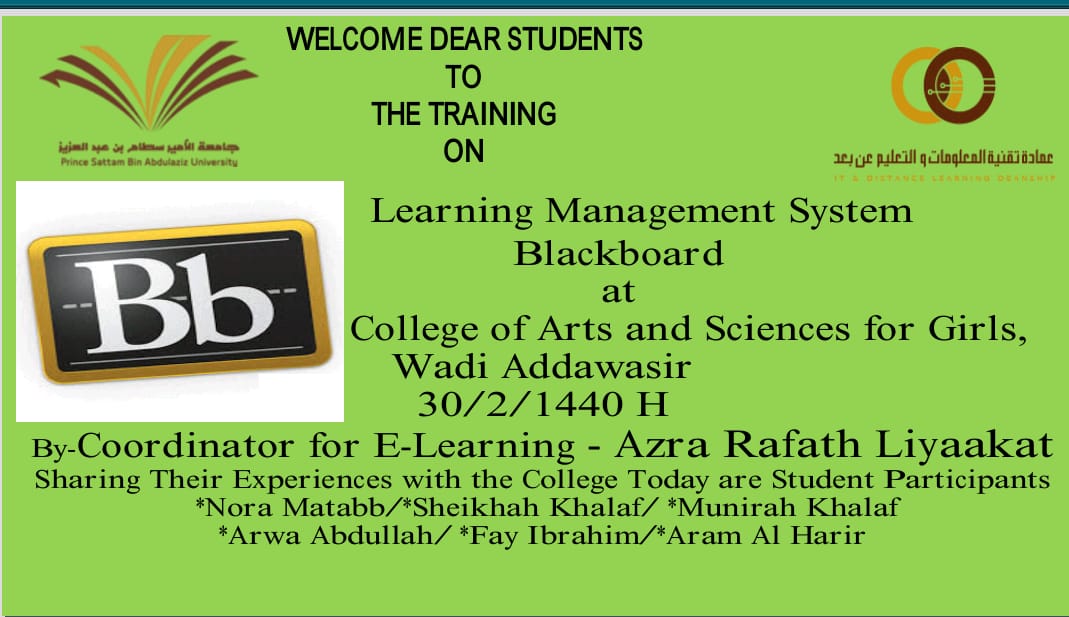 اختتمت كلية الاداب والعلوم بوادي الدواسر بوم الثلاثاء الموافق 12-3-1440هـ ممثلة بوحدة التعليم الالكتروني دورة تدريبية حول أساسيات استخدام نظام البلاك بورد للطالبات .