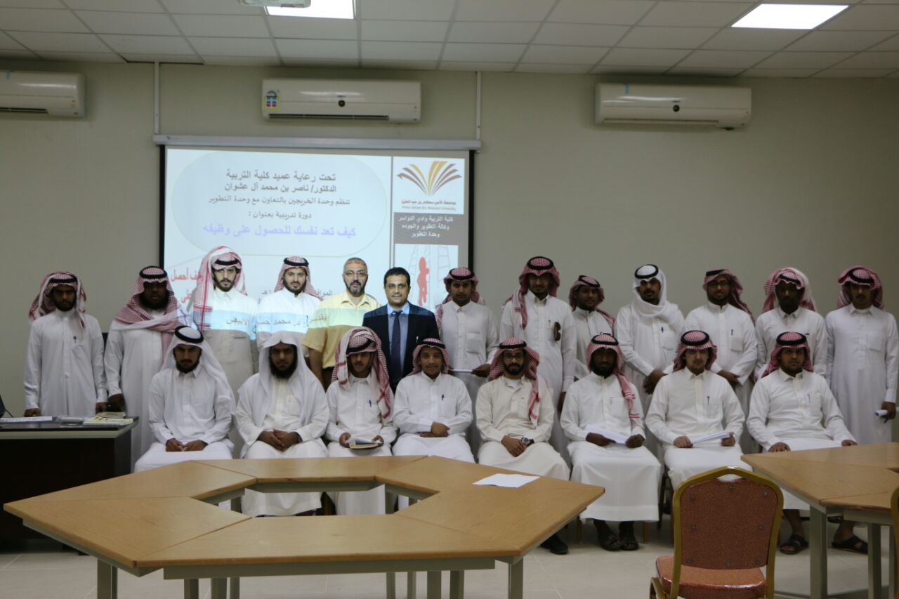 اختتمت كلية التربية بوادي الدواسر ممثلة بوحدة الخريجين الدورة التدريبية "كيف تحصل على وظيفة ؟" قدمها الدكتور محمد حسن الأبيض المشرف على الأنشطة الثقافية والاجتماعية بوكالة الجامعة للفروع والتي شارك بها عدد من طلبة كليات وادي الدواسر والسليل وذلك بقاعة التدريب بكلية التربية . واشتملت الدورة على كيفية عمل السيرة الذاتية وكيفية الاستعداد لمقابلات التوظيف بالإضافة إلى تعريف بموقع التوظيف العالمي "LinkedIn".