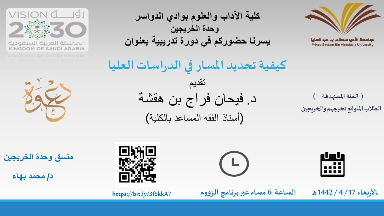 بهذا أقامت كلية الآداب والعلوم بوادي الدواسر وبالتعاون مع وحدة الخريجين بالكلية دورة (كيفية تحديد المسار في الدراسات العليا) ، وذلكيوم الأربعاء الموافق 1442/4/17هـ عبر برنامج الزووم , قدمها الدكتور فيحان بن فراج الهقشة استاذ الفقه المساعد بالكلية .