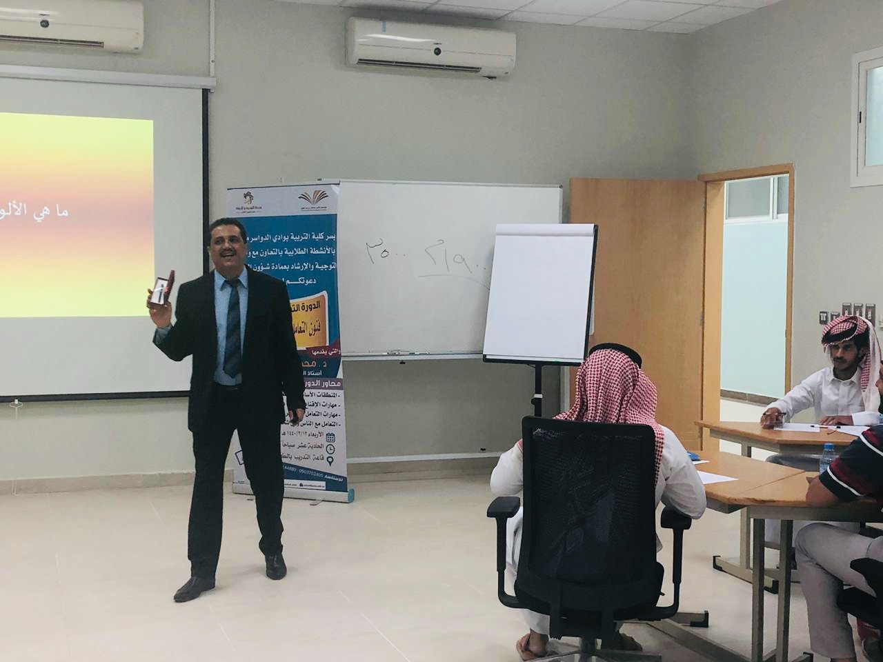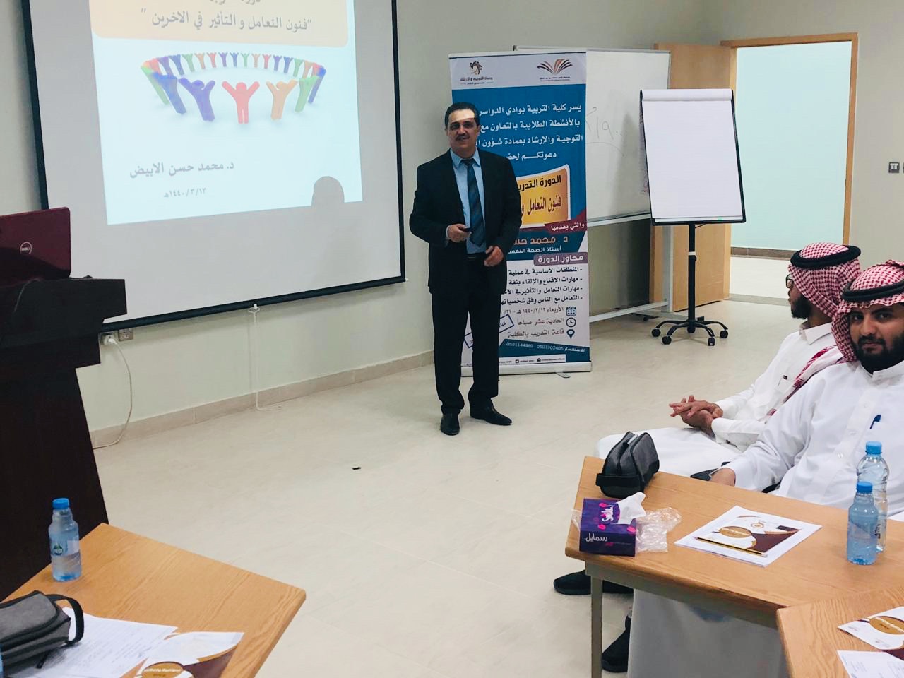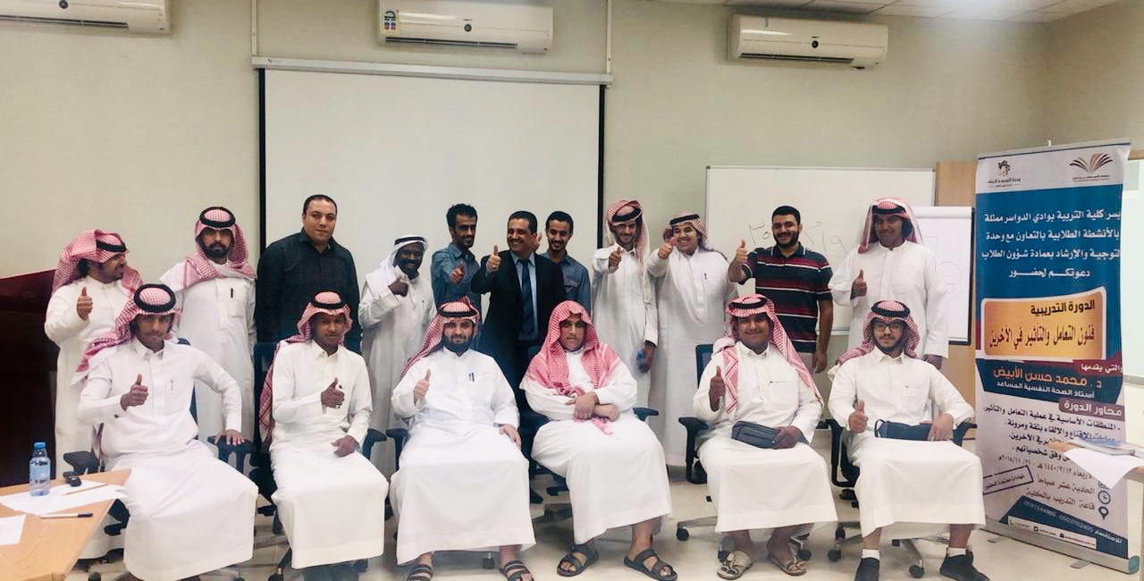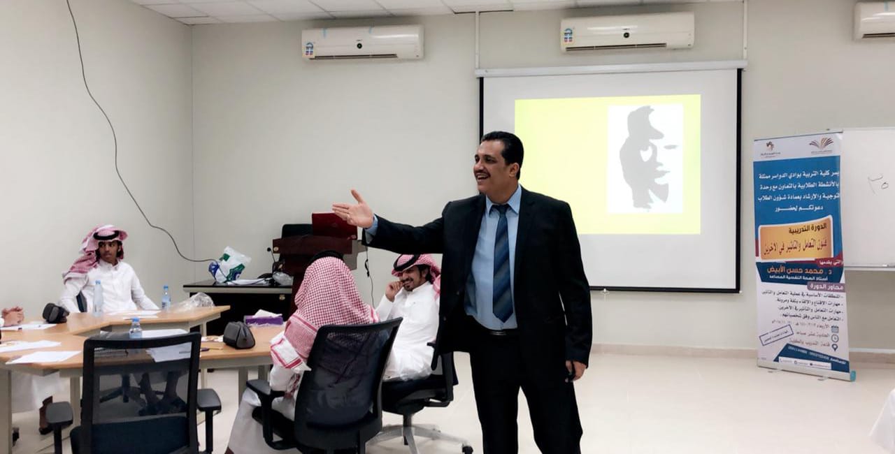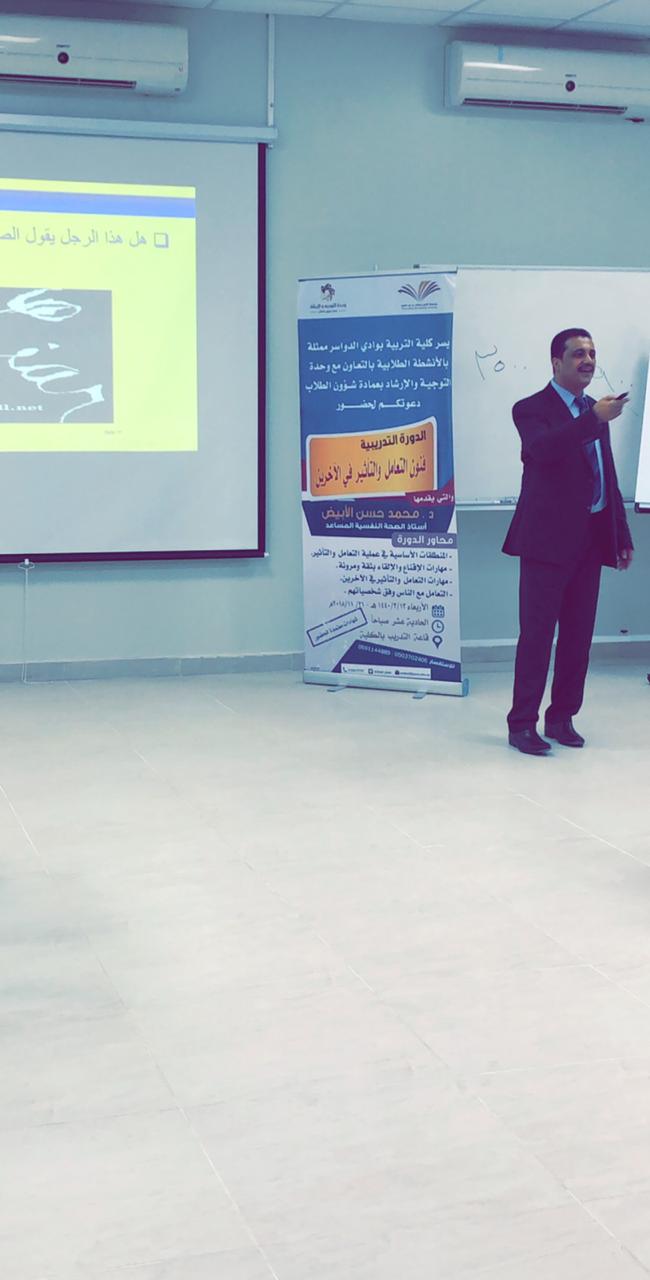 اختتمت كلية التربية بوادي الدواسر بالتعاون مع وحدة التوجية والارشاد بعمادة شؤون الطلاب دورة تدريبية تفاعلية بعنوان " مهارات التعامل والتأثير في الاخرين " وذلك يوم الأربعاء الموافق 13/3/1440هـ بقاعة التدريب بالكلية ، قدمها الدكتور محمد حسن الأبيض استاذ الصحة النفسية المساعد وحضرها مجموعة من الطلاب واعضاء هيئة التدريس والموظفين والمهتمين لمثل هذه الدورات .