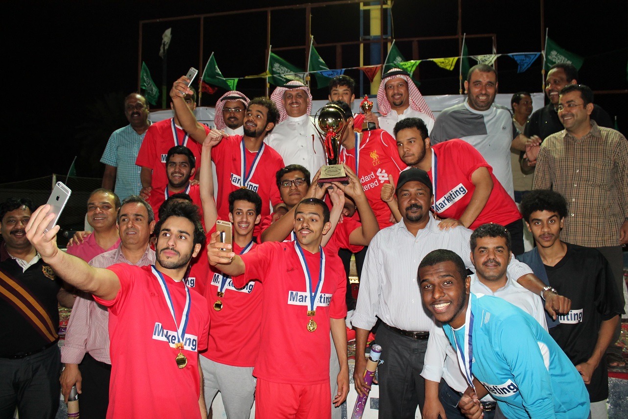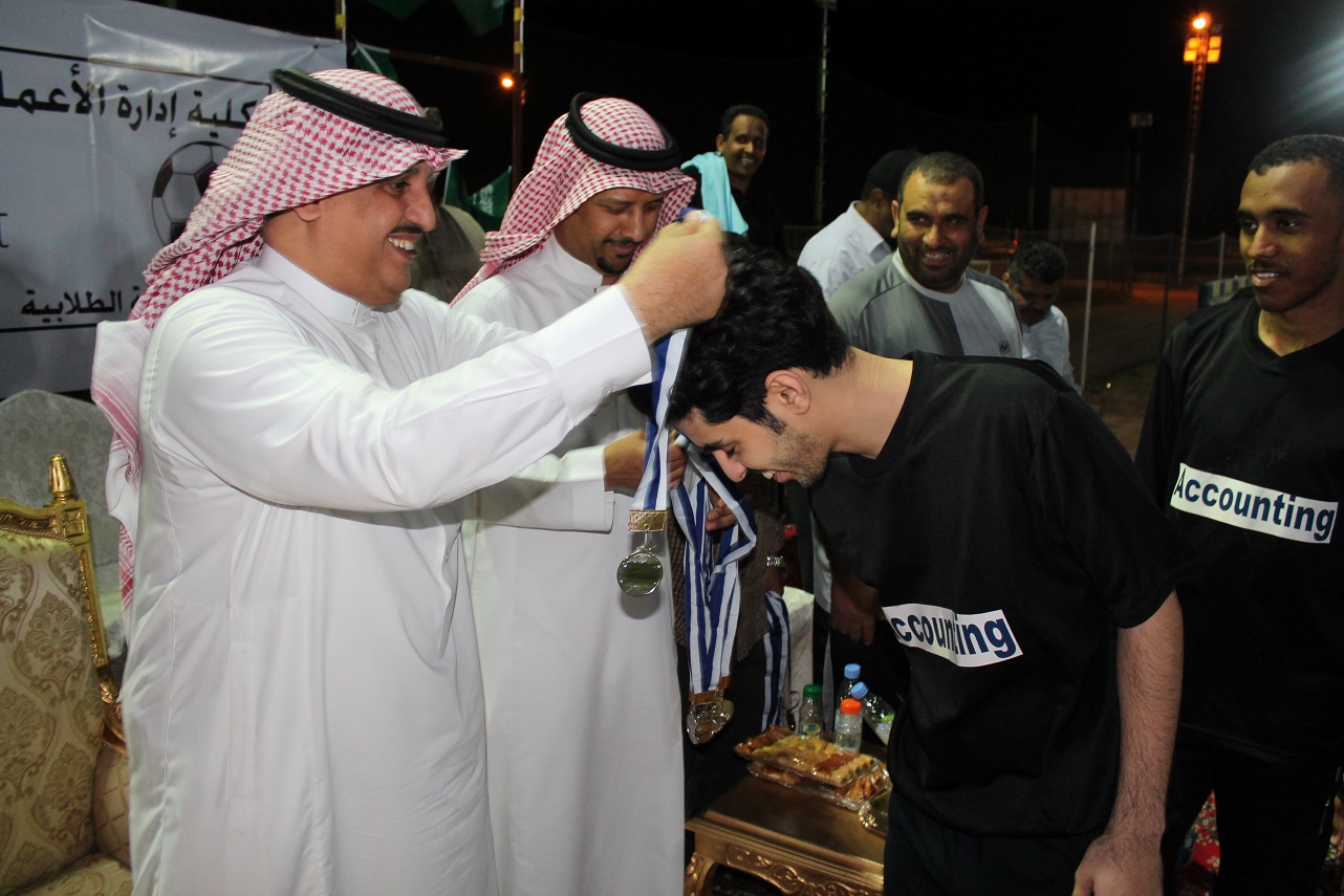 اختتمت فاعليات الدورة الثانية لبطولة كأس عميد كلية إدارة الأعمال لكرة القدم، والتي نظمتها لجنة الأنشطة الطلابية بالكلية، برعاية العميد الدكتور ناصر بن سعد القحطاني، بدأ اللقاء بحضور العميد والوكلاء ومنسوبي الكلية من طلاب وموظفين وهيئة تدريسية، وقد جمعت مباراة النهائي بين فريقي قسم المحاسبة وقسم التسويق، حيث تألق الفريقان أمام الساحرة المستديرة، بأداء مميز ومثير حل توقيع التعادل الإيجابي بهدفين لكل منهما، ووصولهما لضربات الترجيح والتي انتهت بفوز فريق التسويق وتتويجه بطلا للبطولة، وقد سلم سعادة عميد الكلية فريق التسويق كأس البطولة والميداليات الذهبية وسط فرحة عمت لاعبي الفريق ومنسوبي القسم بالفوز ، كما تسلم فريق المحاسبة الحائز على المركز الثاني كأس الفريق المثالي والميداليات الفضية، وقد حصل على جائزة هداف البطولة الطالب بدر مبارك الموح ، وحصل على جائزة أفضل لاعب الطالب عبدالمجيد الراشدي، وحصل على جائزة أفضل حارس مرمى الطالب عبدالله فيصل بن حسين، وتأتي تلك البطولة ضمن فعاليات الأنشطة الطلابية التي تقوم بها الكلية لتحقيق أهدافها الرياضية والاجتماعية السامية التي تصبو إليها وذلك للرقي بمستوى الطلاب من خلال الترابط بينهم وبين زملائهم ومنسوبي الكلية .