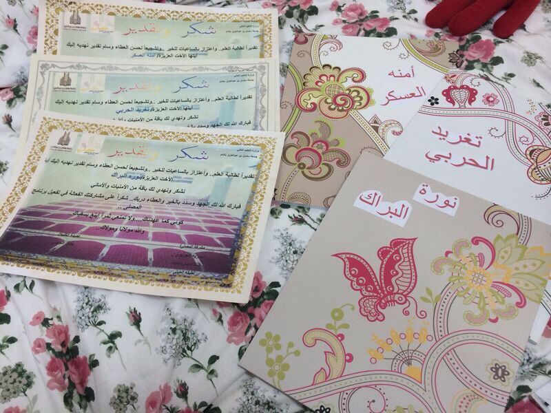 ثم قدمت شهادات شكر وتكريم للخريجات من طالبات المصلى "عائشة الحربي، بتول الدوسري، شيخة العسكر، منيرة السيف" بمسيرة قدمتها صديقة المصلى الجوهرة الداغري، تم بعدها عرض فيديو خاص للخريجات ، تلاه فقرة تهاني الامهات لبناتهن الخريجات.