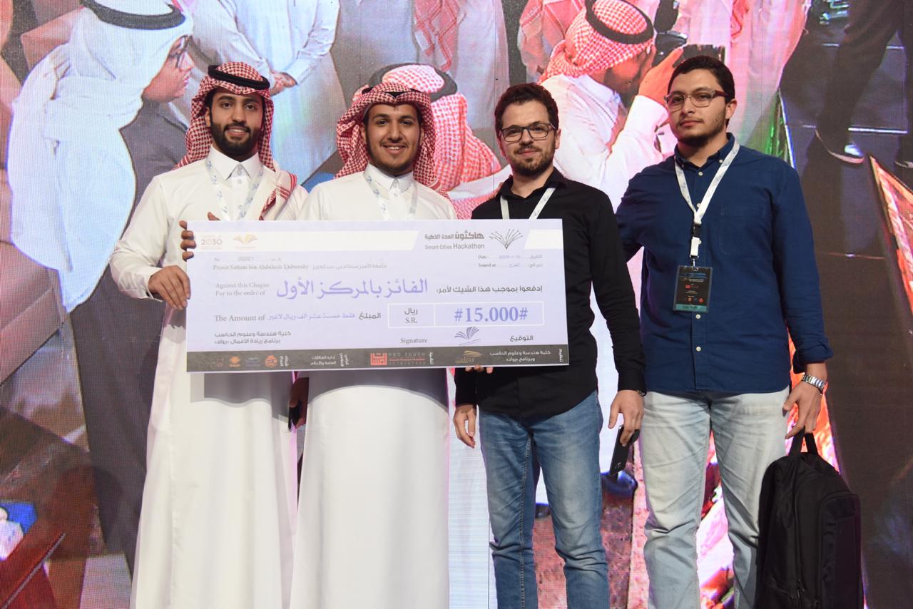 حيث توج معالي مدير الجامعة أ.د. عبدالعزيز بن عبدالله الحامد الثلاث فرق الفائزة بالمراكز الأولى من بين 64 فرقة مشاركة جاء ذلك خلال عدد من المراحل حيث تم ترشيح ٨ مجموعات للتقييم النهائي أمام لجنة التحكيم ثم أعلنت النتائج بفوز فريق BLE بالمركز الأول الذي حصل على جائزة مقدارها ١٥.٠٠٠ ريال والذي طور فكرة تطبيق مشاركة السيارة مع الآخرين إلى استعمال هذا التطبيق لمشاركة الدراجات الهوائية والعربات والسيارات بين المستخدمين بطريقة سهلة ومميزة