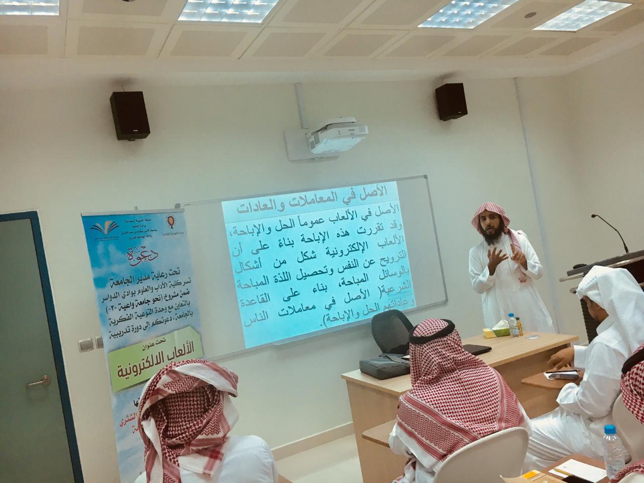 نظمت كلية الآداب والعلوم بفرع جامعة الأمير سطام بن عبدالعزيز في محافظة وادي الدواسر، ضمن مشروع ( نحو جامعة واعية-٣-) وبالتعاون مع وحدة التوعية الفكرية بالجامعة ، يوم أمس حلقة نقاش بعنوان ” الألعاب الإلكترونية خطرها وطرق الوقاية منها ” في قاعة التدريب بالكلية قدمها الدكتور أحمد بن عبدالعزيز الشثري عضو هيئة التدريس بالجامعه .