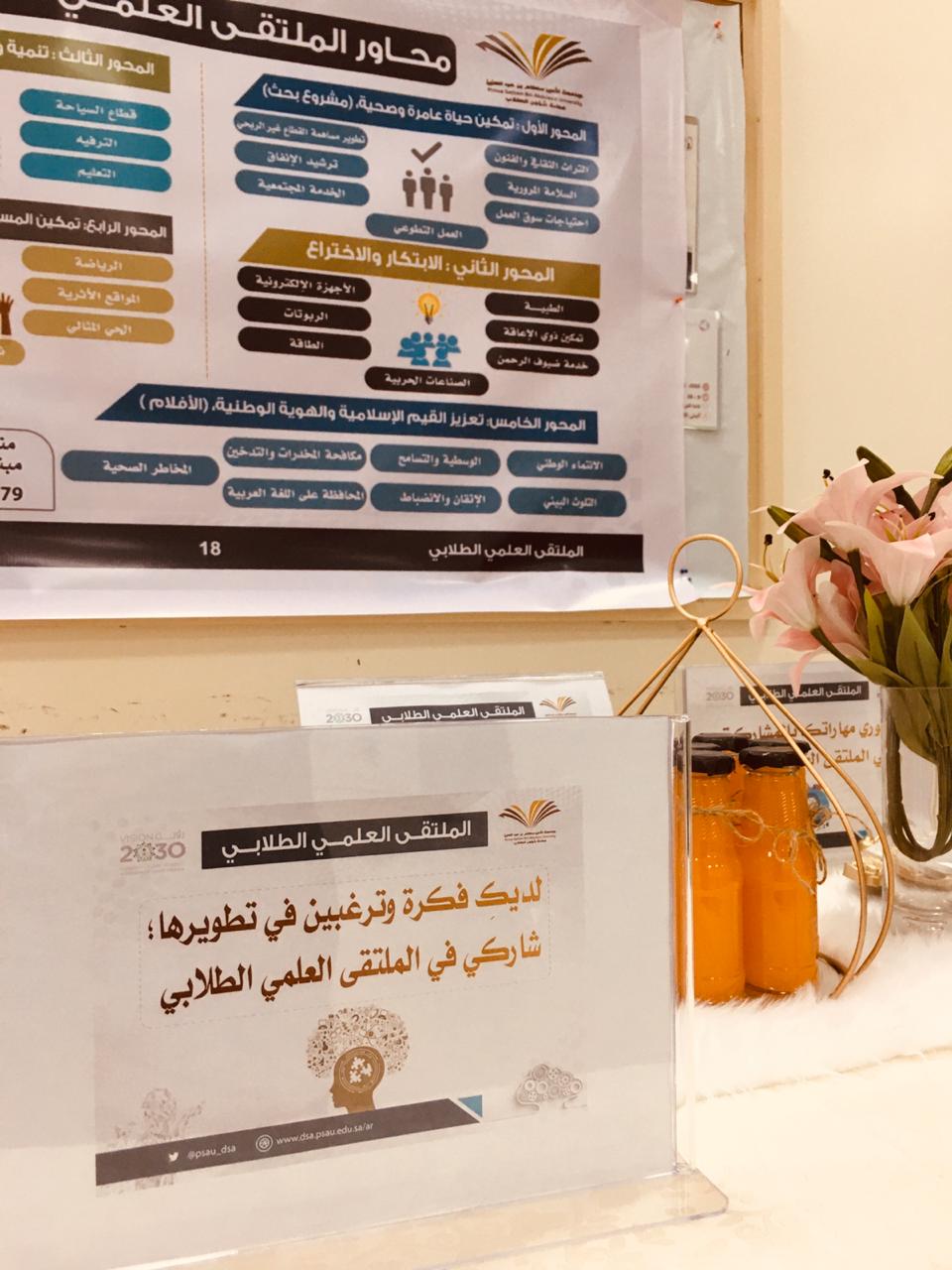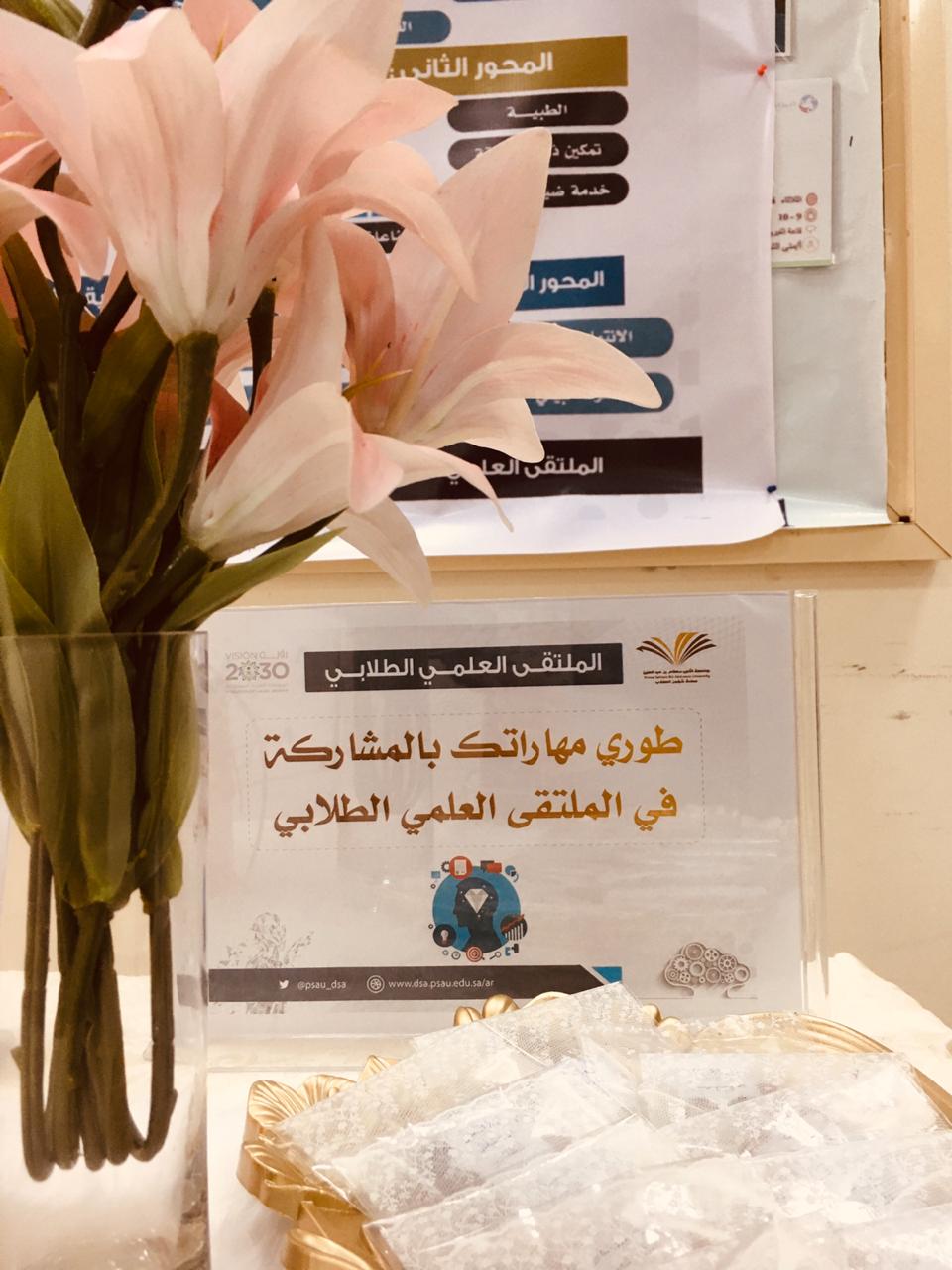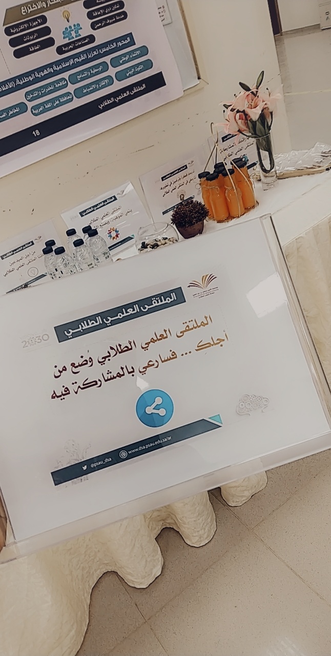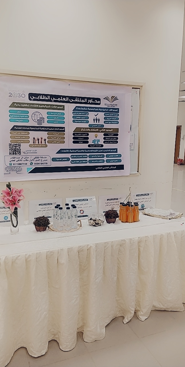 تحت رعاية وكيلة كلية التربية بالخرج الدكتورة/ منيرة بنت عبدالله العسكر, اختتمت اليوم الثلاثاء ٢٤ جمادى الآخر الأركان التعريفية والحملات التحفيزية والدعائية للملتقى العلمي الطلابي ,والتي بدأت من الأسبوع الماضي على جميع القنوات المرئية من برشورات واعلانات وأركان ومواقع التواصل الاجتماعي بمشاركة ودعم وحدة العمل الطلابي والأندية الطلابية والمجالس الطلابية والهيئة التدريسية بالكلية , وكان أخر هذه الأركان الركن الذي أقامه عضوات المجالس الطلابية من قسم اللغة العربية حيث شمل الركن كل مايخص الملتقى العلمي الطلابي وكن العضوات متواجدات للإجابة عن أي سؤال حول المشاركة بالملتقى العلمي الطلابي .
