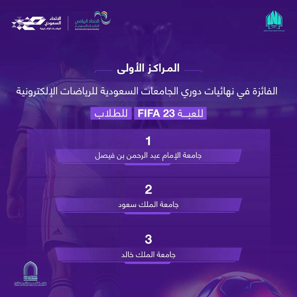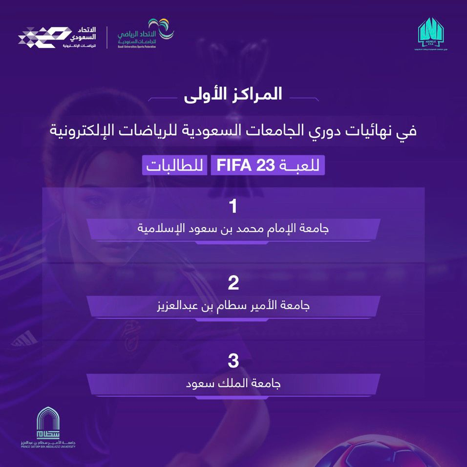 بحضور صاحب السمو الملكي الأمير فيصل بن بندر بن سلطان رئيس الاتحاد السعودي للرياضات الإلكترونية؛ اختتمت أمس الجمعة ١٤٤٤/١٠/٢٩هـ الموافق ١٩ مايو ٢٠٢٣م نهائيات دوري الجامعات السعودية لبطولة فيفا٢٣ الإلكترونية للطلاب والطالبات؛ والتي نظمها الاتحاد الرياضي للجامعات السعودية، باستضافة جامعة الأمير سطام.