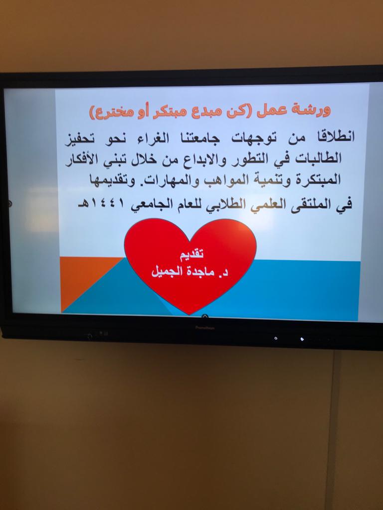 في إطار الدعاية لمحاور الملتقى العلمى الطلابى أقيمت اليوم ورشة عمل للتعريف والدعاية لمحور الابتكار والاختراع قدمتها د. ماجدة الجميل مساعدة العميد لشؤون الطالبات بكلية العلوم الطبية التطبيقية بوادي الدواسر ومنسقة المحور وتم فيها تعريف الطالبات بمعنىأواهمية الاختراع والابتكار في مجال العلوم والتكنولوجيا وشرح التجارب السابقة عبر التاريخ وعدم اليأس من فشل بعض التجارب والاصرار على النجاح.كما تم عرض مواضيع هذا المحور وطرح بعض الأفكار على الطالبات لمساعدتهن وتحفيزهن على المشاركة فى الملتقى وشرح الفائدة المعنوية والعلمية قبل المادية لمشاركتهم.