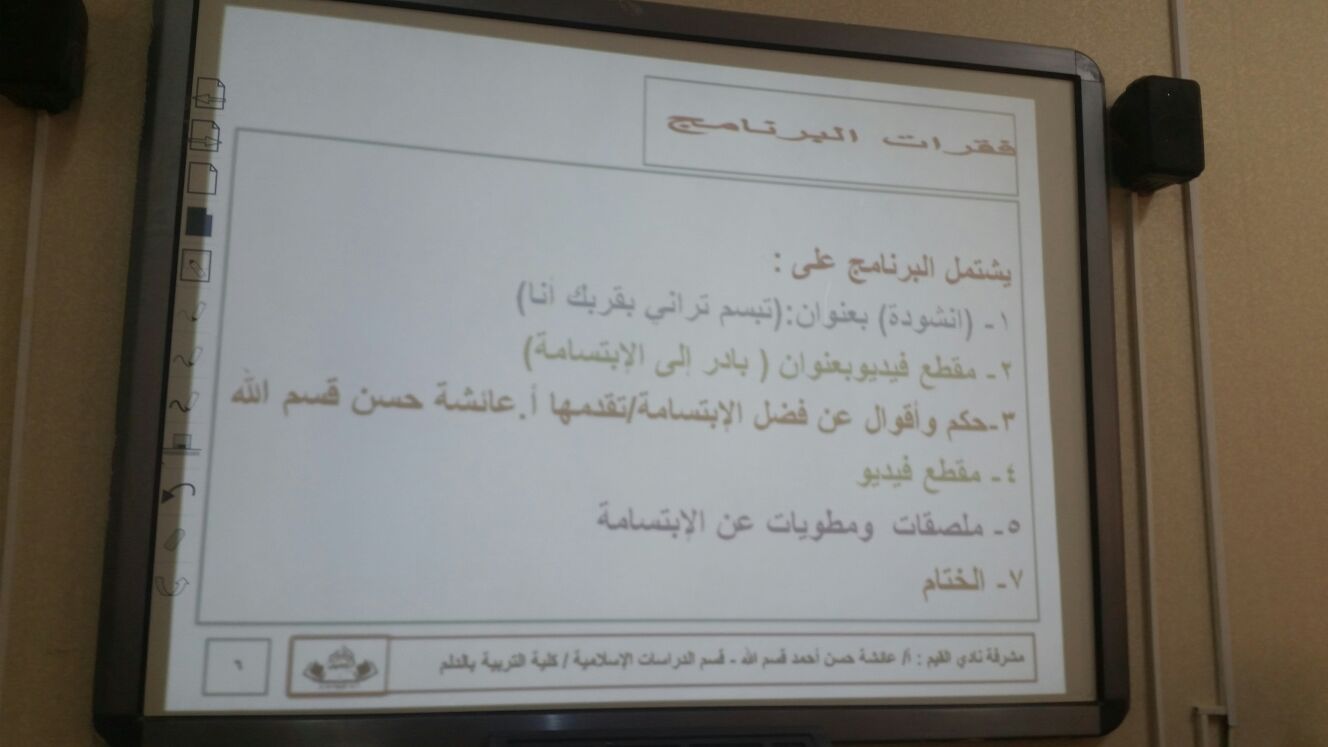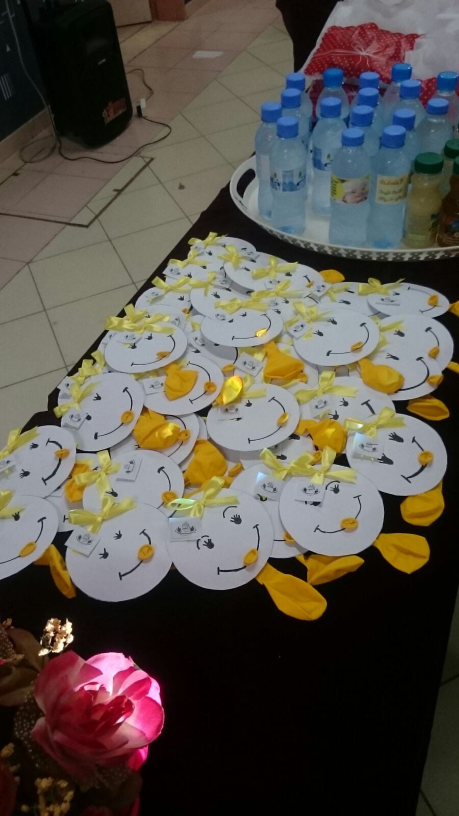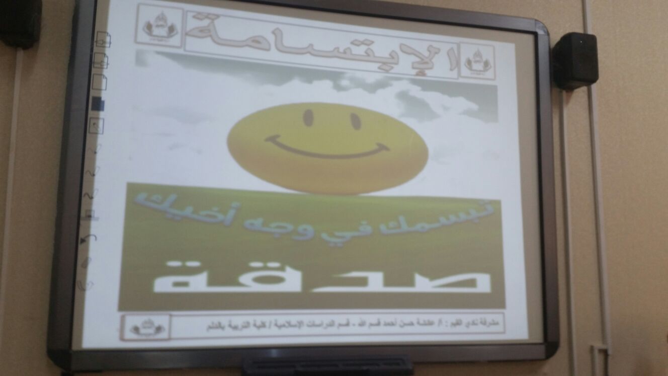 وقد تم توزيع المطويات المتنوعة وتوزيع شعار الوجه المبتسم على طالبات المدرسة ، و عملت مسابقة عن الابتسامة بين طالبات.