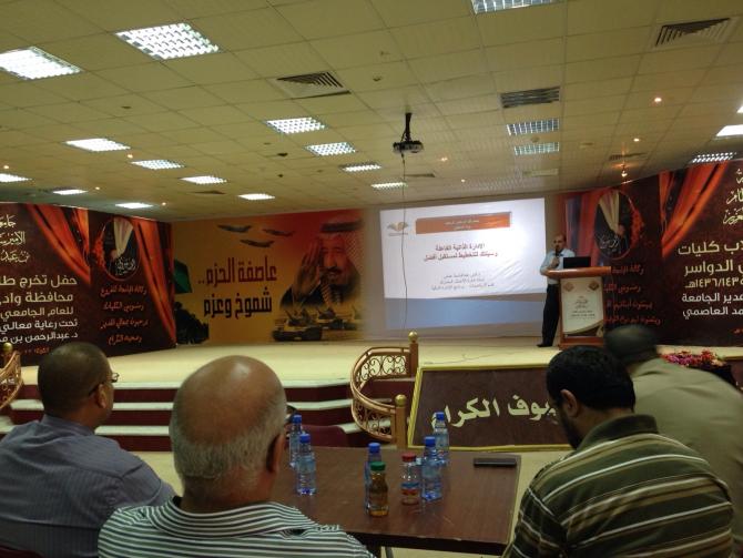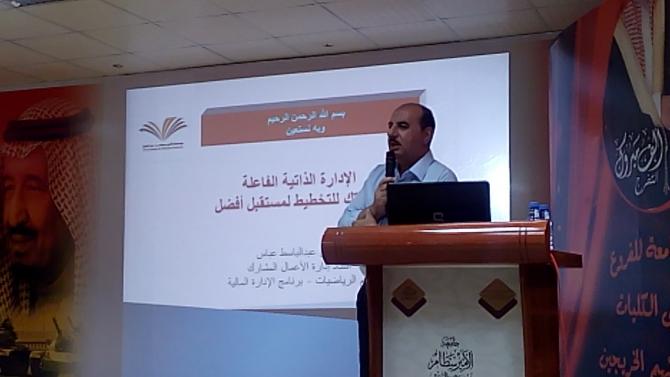 نظمت كلية الآداب والعلوم بوادي الدواسر - ضمن أنشطتها العلميّة- حلقة نقاش بعنوان (الإدارة الذاتية الفاعلة وسيلتك لتخطيط نحو مستقبل أفضل) قدمها الدكتور أنس عبدالباسط عباس مساعد العميد للتطوير والجودة، بحضور عميد الكلية الدكتور/ ناصر بن محمد المهيزع، وعدد من أعضاء هيئة التدريس في الكلية، وقد تضمن اللقاء طرح العديد من الأفكار العلمية التي توضح أهمية تنمية المهارات الذاتية، وأنها مطلب حيوي للنجاح في الحياة على المستويين الشخصي والمهني، وتعد القدرة على إدارة الذات هي الخطوة الأساسية نحو صنع قيادات إدارية تتمتع بقدرات هائلة للتغيير والنجاح المؤسسي. وقد أشار الدكتور أنس أنه من خلال الإدارة الناجعة للذات يمكن تطوير العلاقات الشخصية والمؤسسية بما يضمن الوصول للهدف والرؤيا بسلاسة ويسر والقليل من المعوقات والمخاطر.