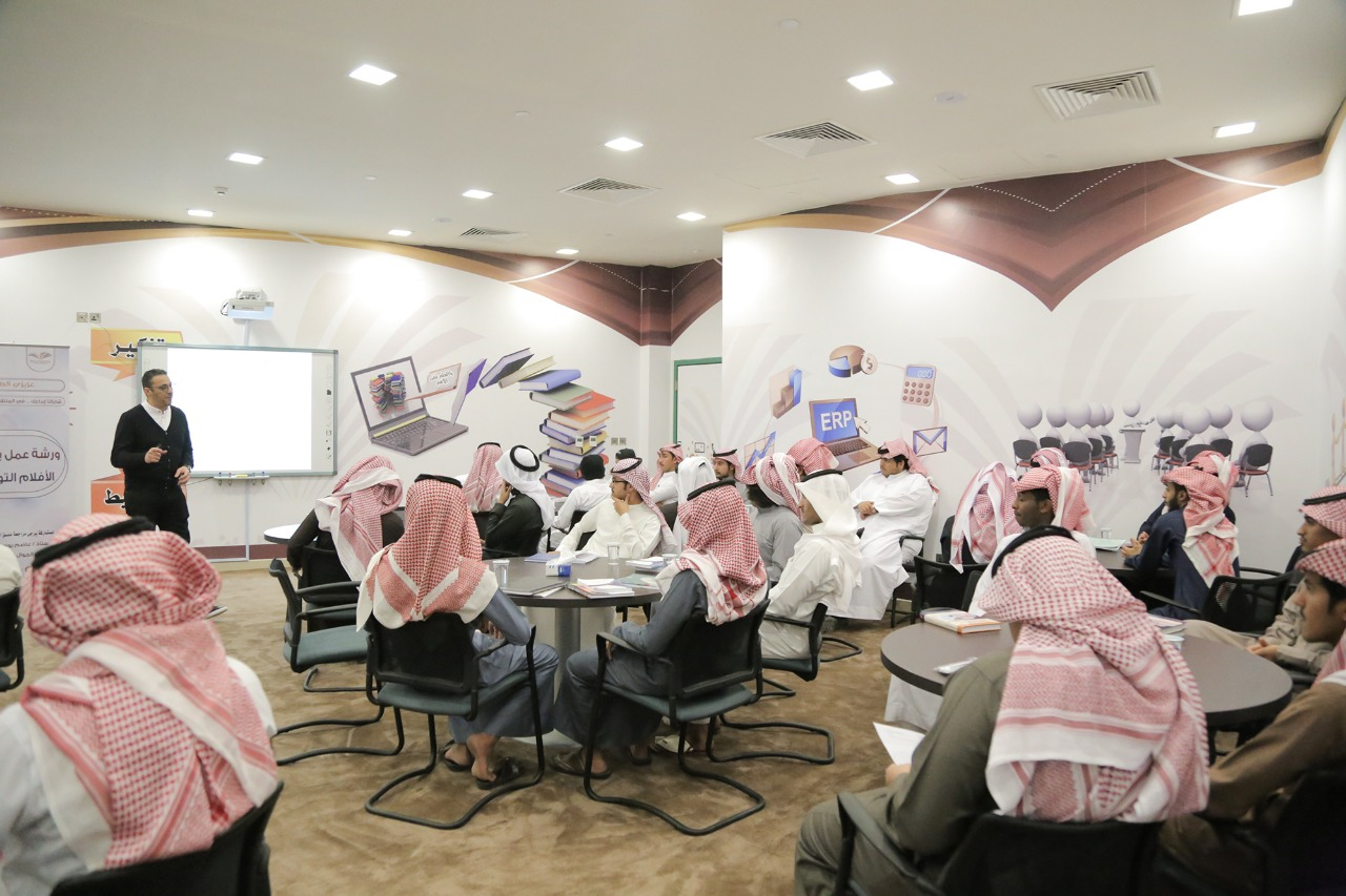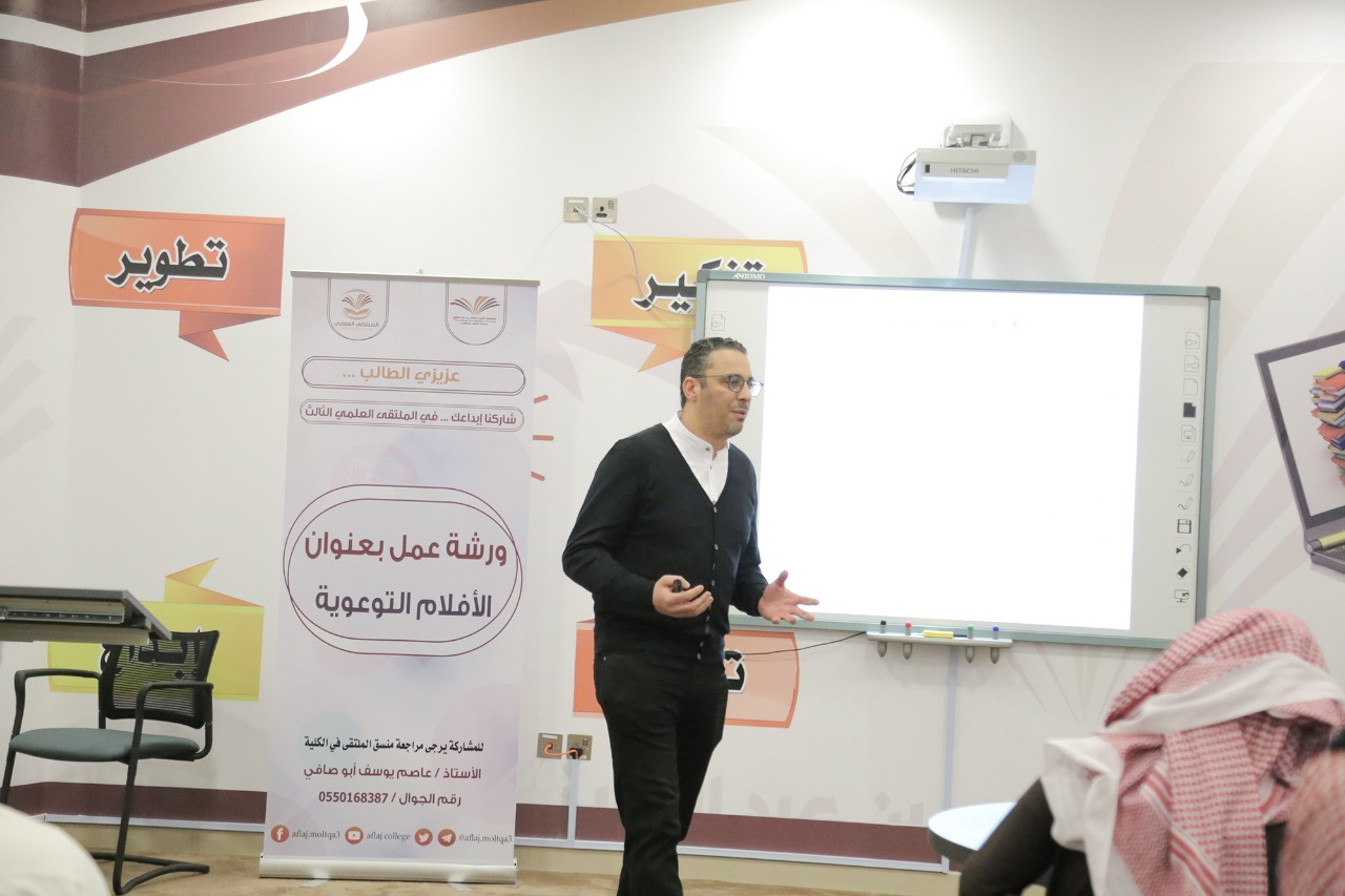 ضمن فعاليات الملتقى العلمي الثالث بكليات الجامعة بالأفلاج نظمت لجنة الملتقى العلمي الثالث يوم الثلاثاء 1440/5/23هـ ورشة عمل بعنوان "الافلام التوعوية القصيرة للشباب" قدمها الدكتور بلحسن عبد المجيد العكروت من كليه هندسة وعلوم الحاسب بالخرج ، تطرق خلالها الي عدة نقاط ومحاور أهها تعريف الافلام التوعوية وخطوات تصوير فيلم توعوي قصير، الادوات الخاصة به ، واهم معايير تقييم الافلام التوعوية.