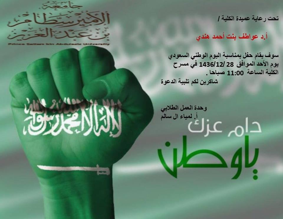أقامت وحدة العمل الطلابي وجميع الأقسام والوحدات بكلية العلوم والدراسات الإنسانية بحوطة بني تميم حفلًا بمناسبة ذكرى توحيد المملكة بمسرح الكلية وساحتها وتضمن الحفل عرض بوربوينت وبعض الأناشيد عن الوطن وبدأ البرنامج بآيات من الذكر الحكيم ثم كلمة لعميدة الكلية أ.د عواطف بنت أحمد بن هندي التي قدمت فيها التهنئة للجميع وذكرت مدى الجهد المبذول من حكومة خادم الحرمين الشريفين في رعاية ضيوف الرحمن ودعت أن يديم الله الأمن والأمان على المملكة وعلى مليكها وشعبها ثم ألقت وكيلة الكلية د. حصه الهزاني كلمة جاء فيها ( أننا نتقلب في نعمة الأمن والأمان في ربوع بلادنا ، وننتقل فيها حيث نشاء ، ننعم بالخير الوافر والعيش الرغيد ، فانه يتوجب علينا شكر هذه النعم العظيمة ، وأن ندرك أن وراء هذه الحياة الامنة ، رجال أشاوس يعرضون أرواحهم للموت والهلاك للحفاظ على حياتنا ، ثم دعت الله أن يحفظ بلادنا من شر الأشرار ، وكيد الفجار ، وأن يعز بلادنا حكومة وشعبا وأن يحفظ سائر بلاد المسلمين)