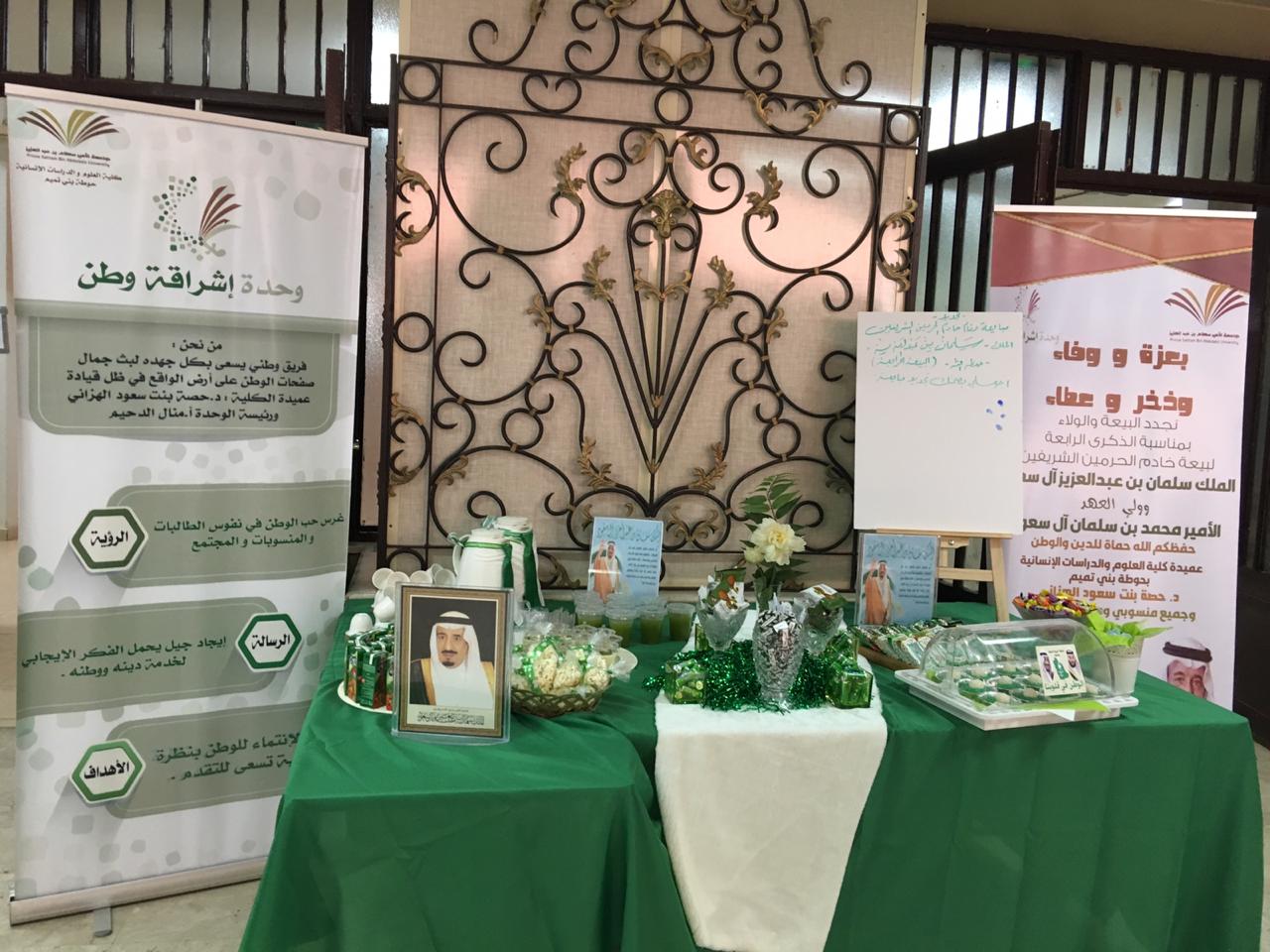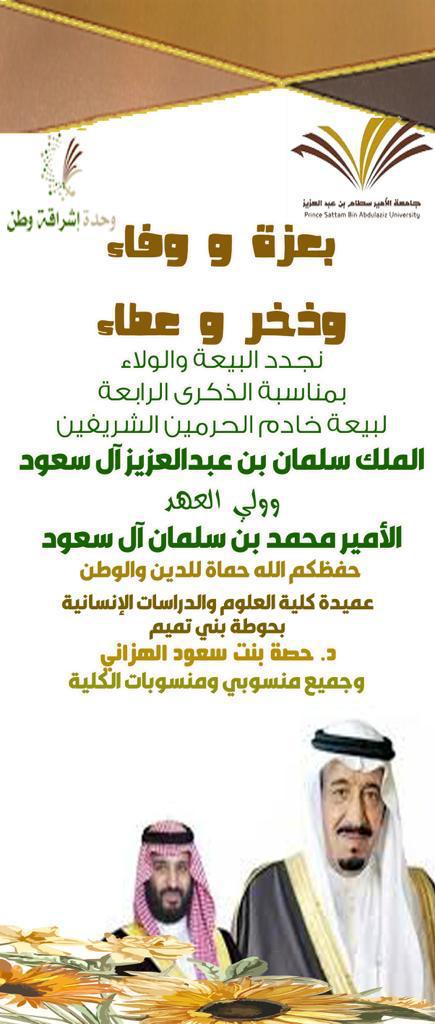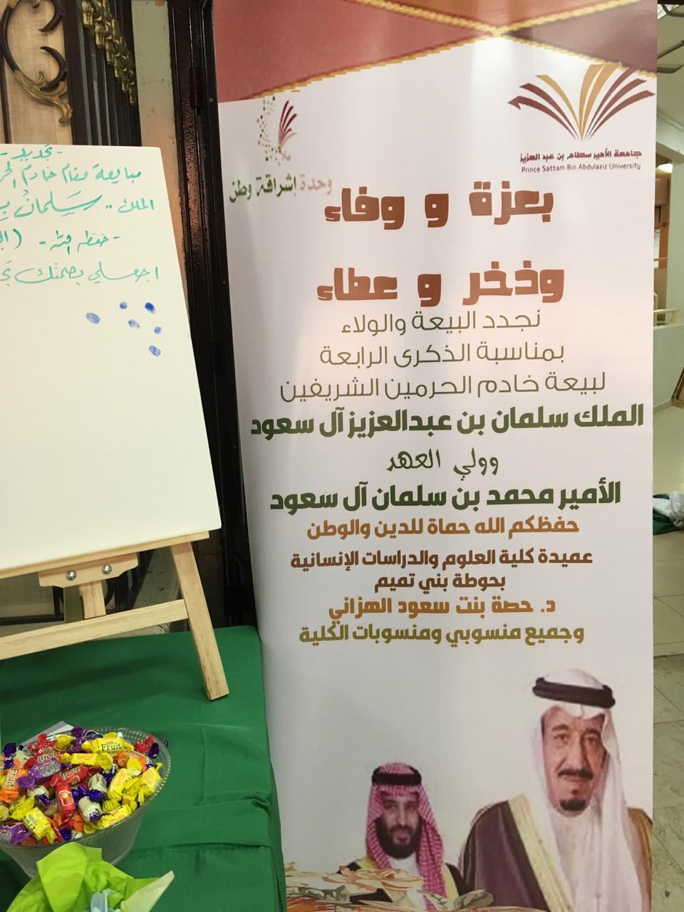 تتوالى التبريكات وتعلو التهاني فرحة بتجديد البيعة الرابعة لمقام خادم الحرمين الشريفين الملك سلمان بن عبدالعزيز وولي عهده محمد بن سلمان حفظهما الله ليسمو التجديد من كلية العلوم والدراسات الانسانية بحوطة بني تميم تحت قيادة عميدة الكلية د/حصه بنت سعود الهزاني، حيث انطلقت وحدة اشراقة وطن يوم الأحد الموافق 9 / 4 / 1440 هـ بركن يعلو بتجديد البيعة وبصمات ترقى بالدعوات ان الله يحمي ملكنا وولي عهده ويجعلهم قادة للدين والوطن. تجديد ذكرى البيعة هو تجديد للنعم التي نتقلب فيها ليلاً ونهاراً ادام الله علينا الأمن والأمان. كان البرنامج من إعداد وتنسيق وحدة اشراقة وطن الأستاذة منال الدحيم.